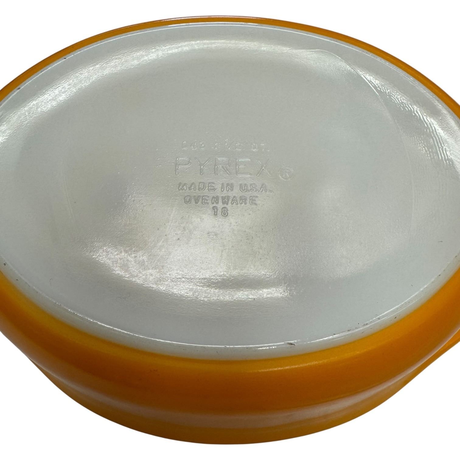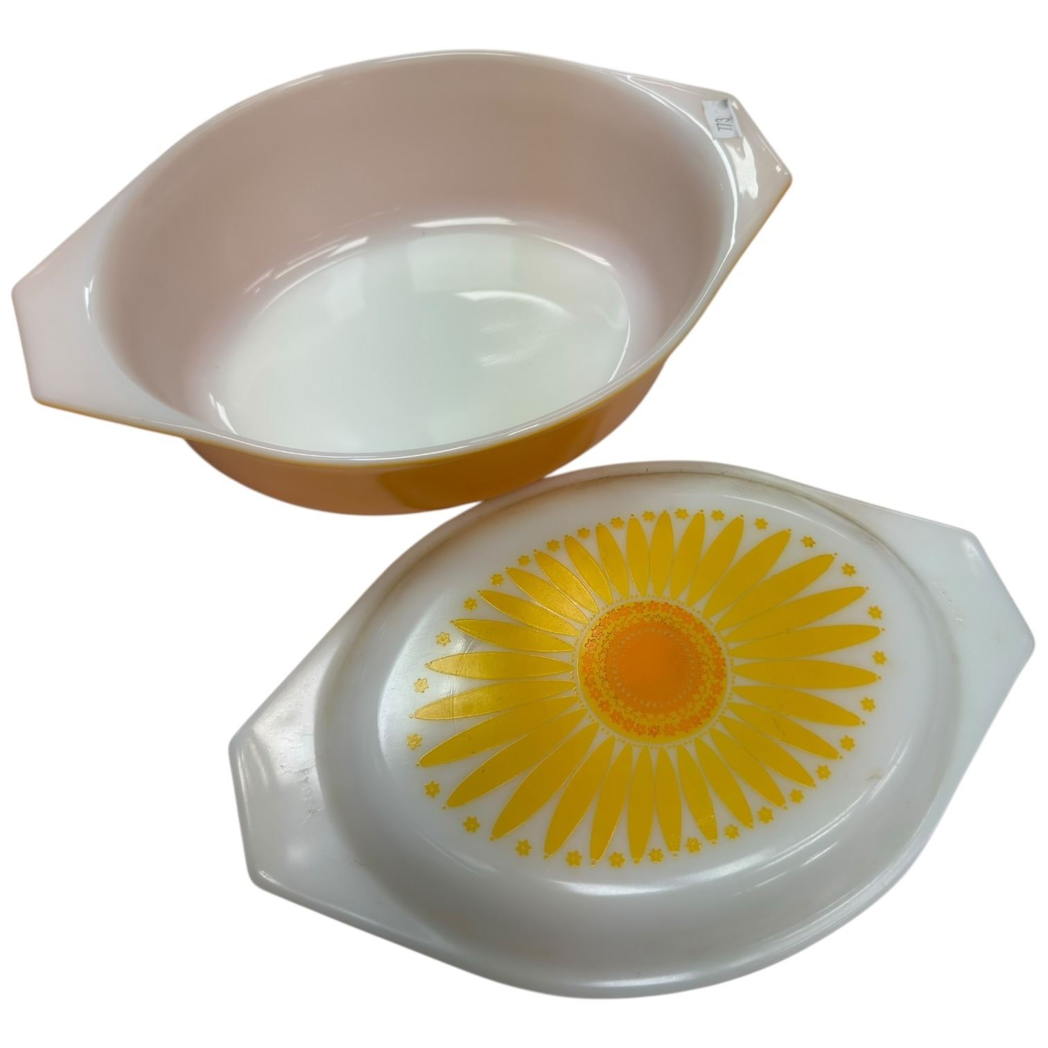 Vintage Pyrex 1.5 Quart Divided Dish featuring the Daisy pattern manufactured around 1969-1970. Pattern includes yellow sunflower/daisy design on opal white glass lid. Base is solid yellow or orange-colored glass. Model 043 comes with an oval glass lid and holds approximately 1.4 liters. No Chips