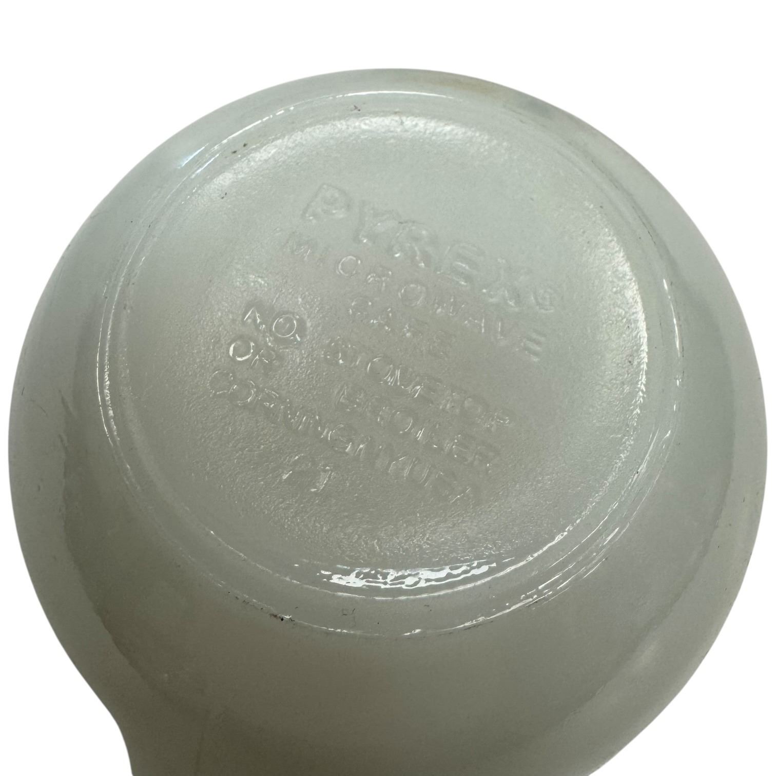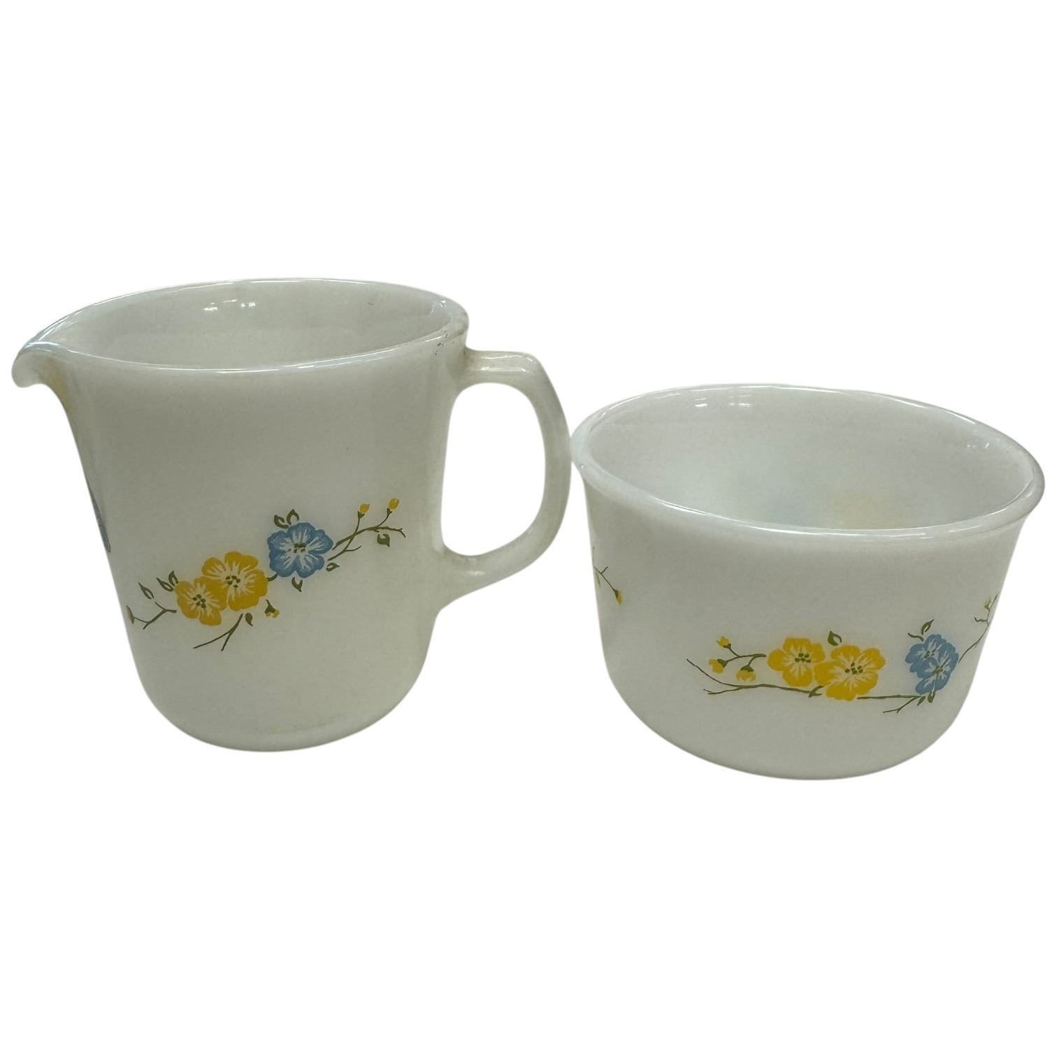 Set of vintage Pyrex Flirtation pattern milk glass pieces including a creamer jug, one tea cup and three matching mugs. The Flirtation pattern features delicate floral designs. Item is as pictured. No chips.