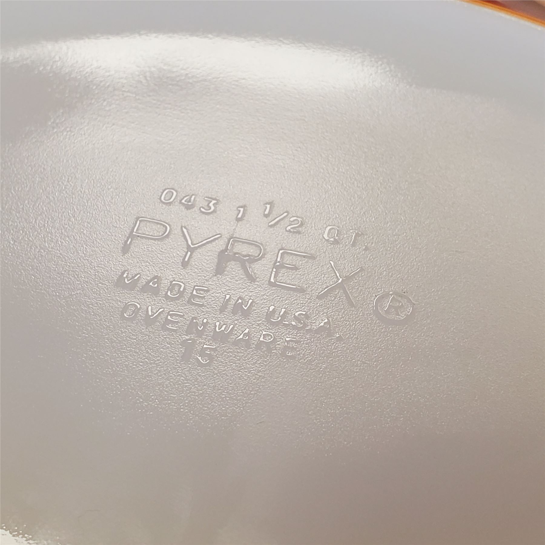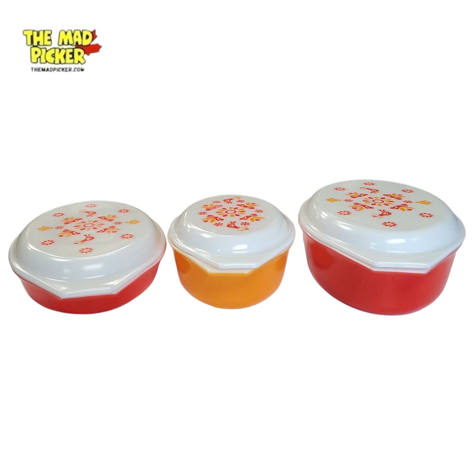 Set of vintage Pyrex casserole dishes in the Friendship pattern (1971-1974). Features red and orange bases with white opal lids showcasing an orange and red bird-and-flower motif. Includes two sizes: 1.5 quart and 2.5 quart. Produced during the early 1970s by Corning Glass Works.