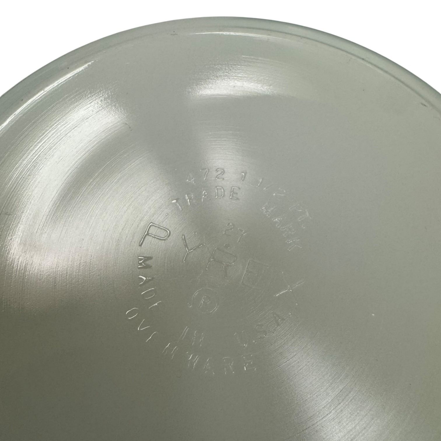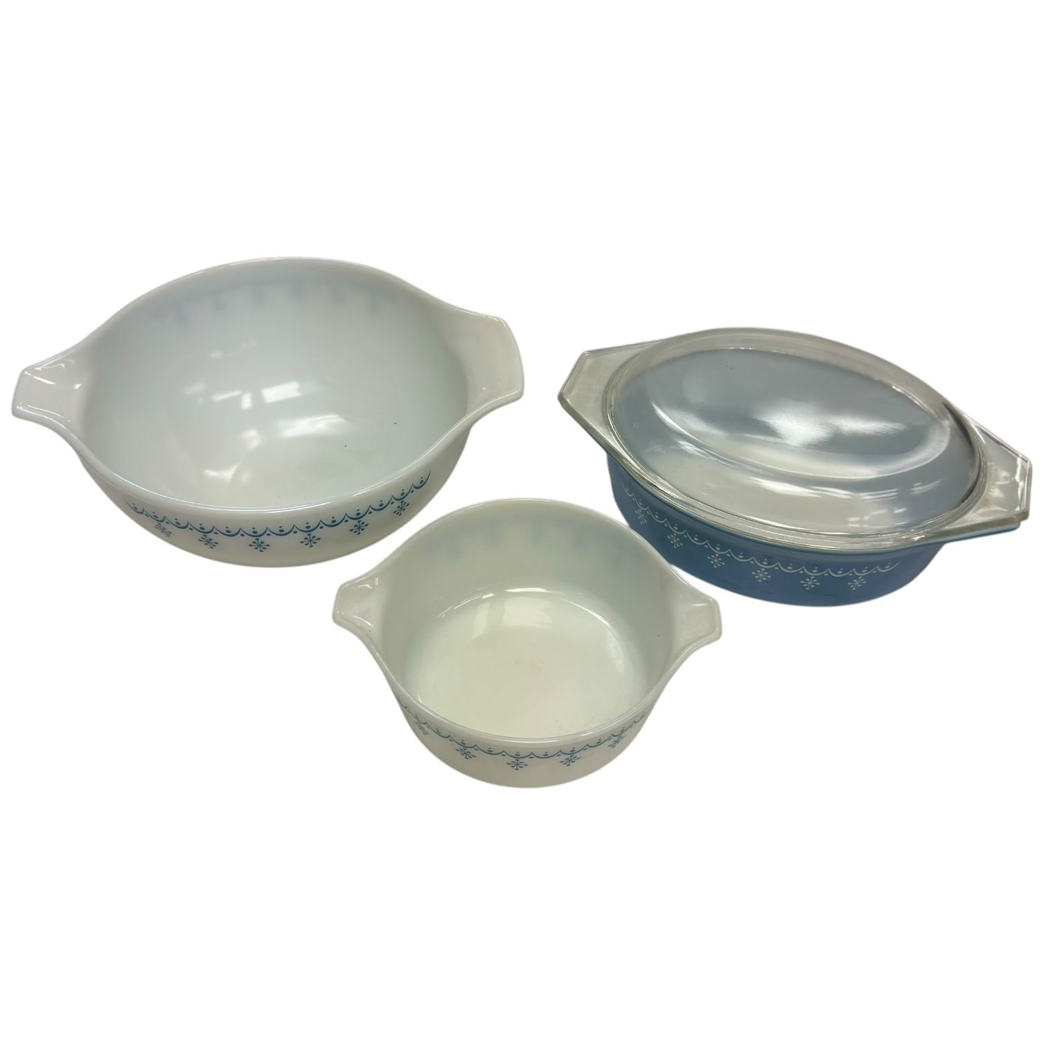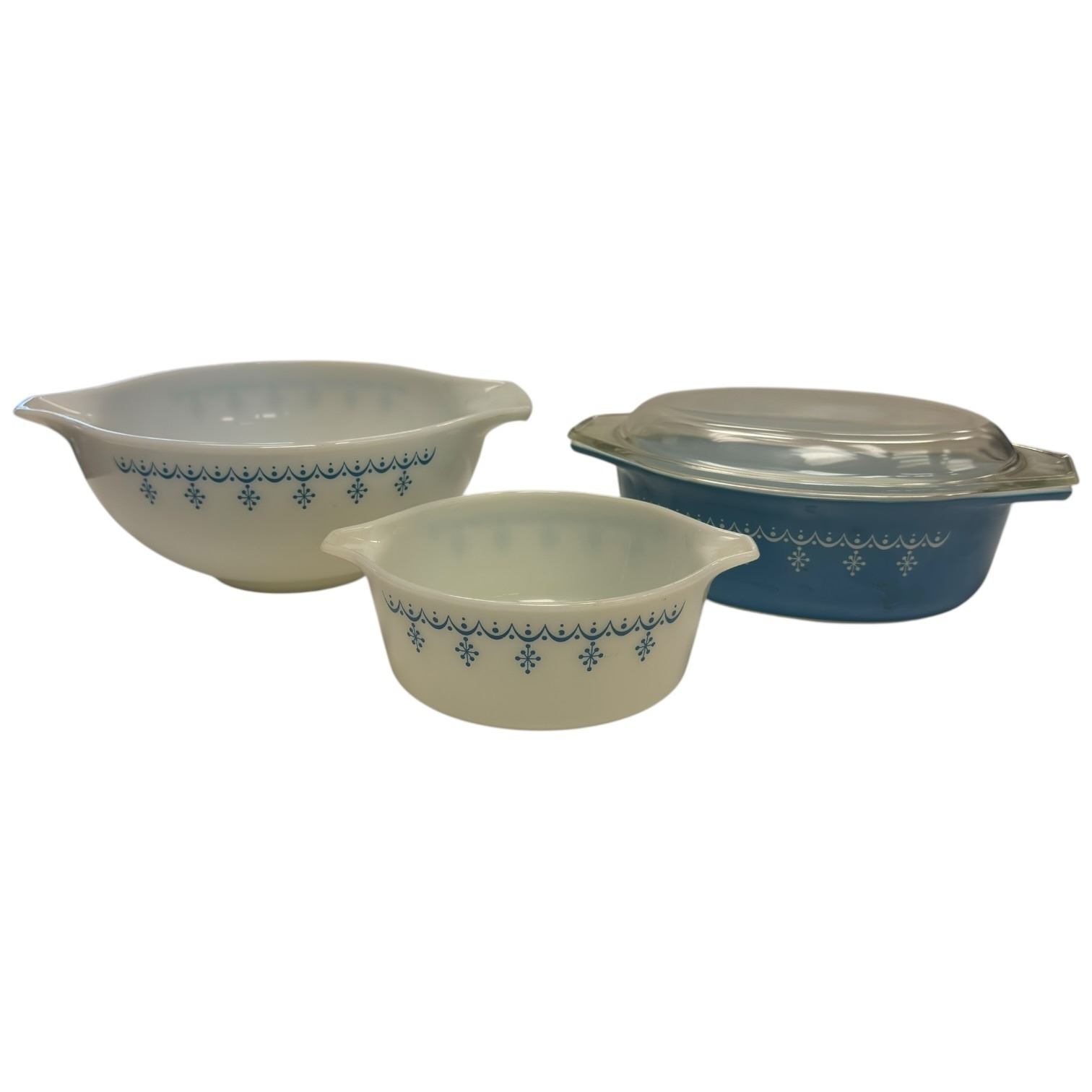 Vintage Pyrex mixing bowls and casserole dishes in Snowflake Blue or Snowflake Garland patterns from the Pyrex Compatibles line (1972-1975). Models include 472, 443, and 043 with lid. Features white snowflake and swag designs on blue or white backgrounds made to complement Corelle dinnerware. No chips as pictured.