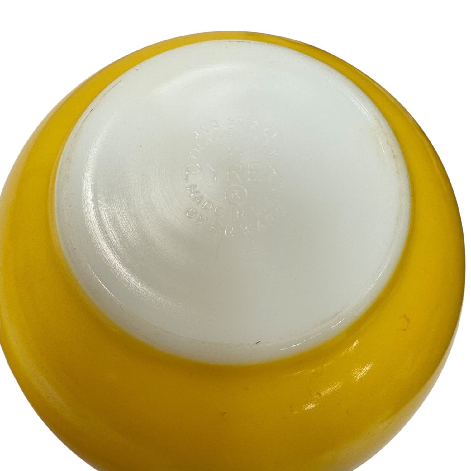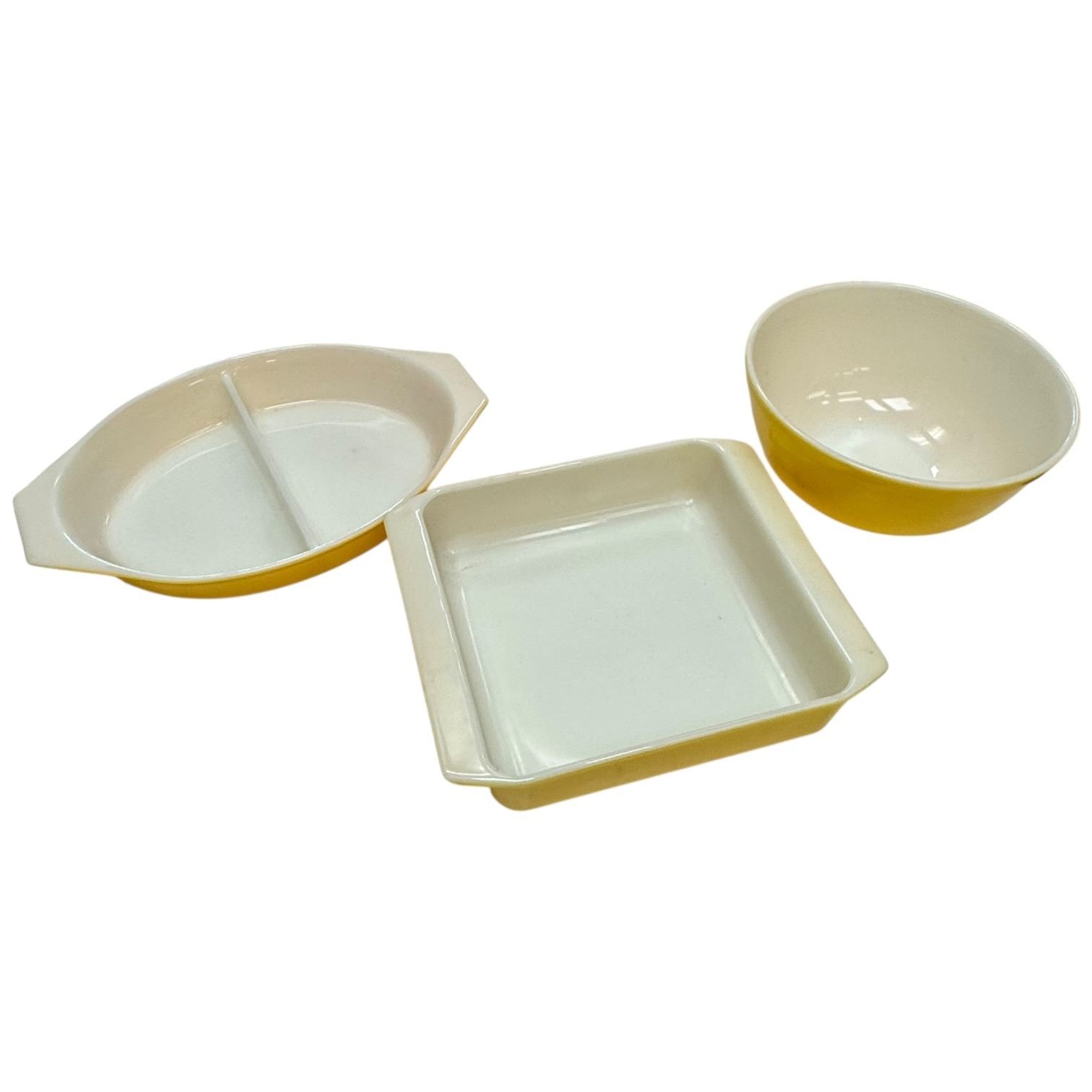Set of vintage Pyrex yellow baking dishes made of durable white opal glass with vibrant yellow exterior coating. Includes rectangular baker model 922, divided oval dish model 36, and round mixing bowl model 403. Mid-century modern design. All items are chip-free and as pictured.