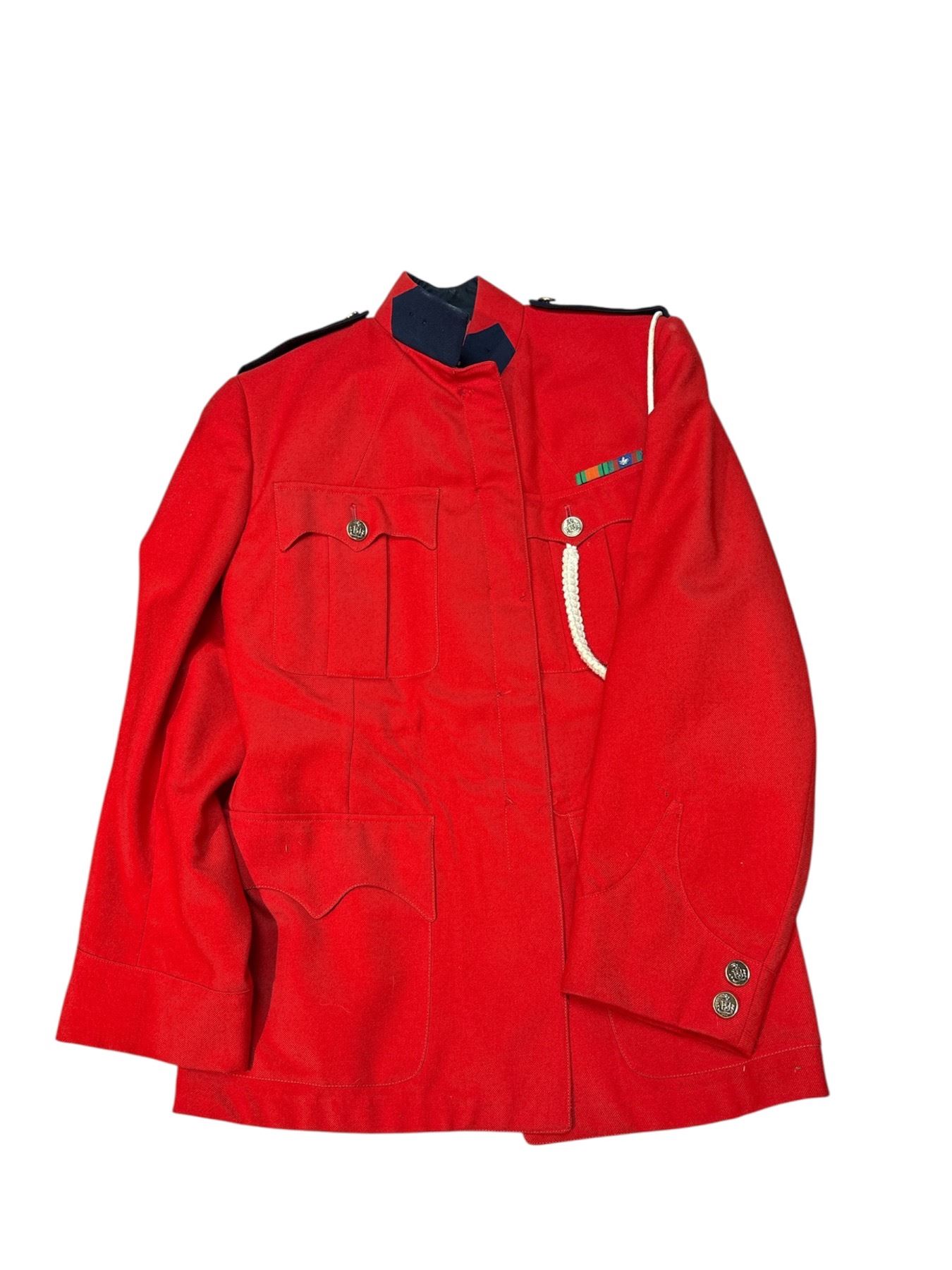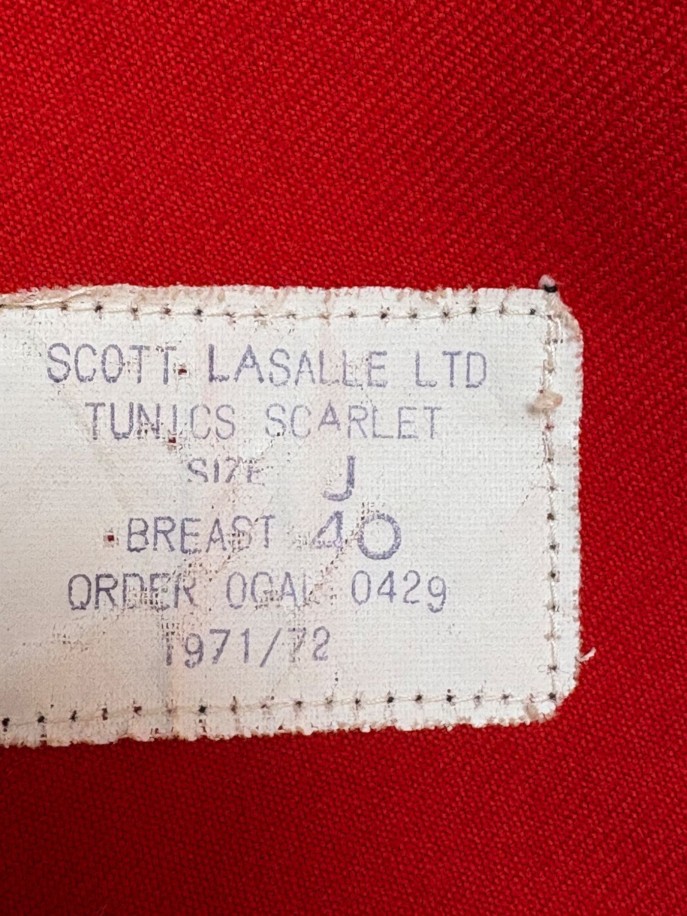 Vintage RCMP Red Serge ceremonial jacket from 1970/71. Size J with Breast 40 measurement. Features traditional red serge wool fabric with gold buttons and high collar design, known for Canadian Mounted Police usage. Authentic uniform piece from the early 1970s. Item is as pictured.