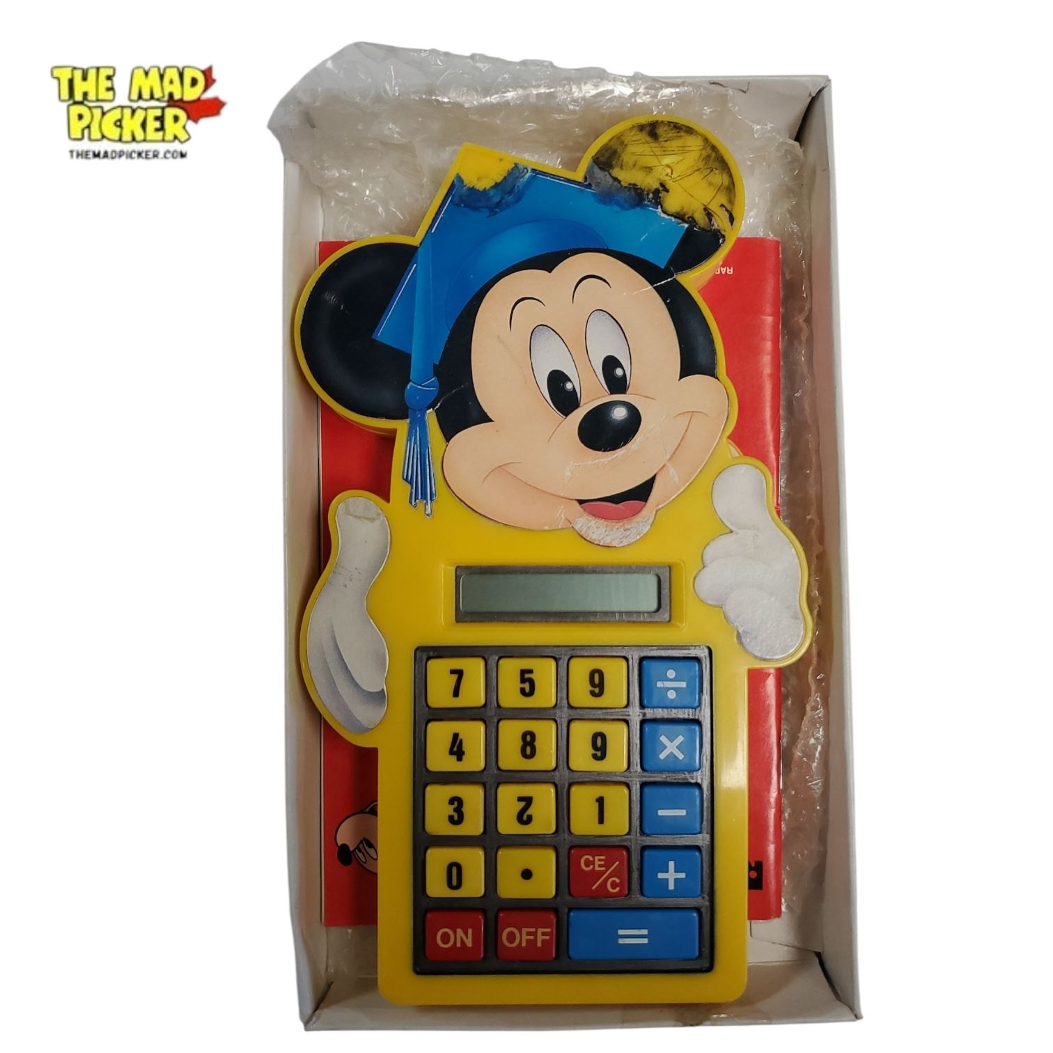 Radio Shack/Tandy Mickey Mouse Kiddy Calculator, made by Omron for Alco, released circa 1975 or 1985. Features a 6-digit blue VFD (Vacuum Fluorescent Display) and basic 4-function calculation capabilities. Designed for children with Mickey Mouse imagery. Vintage electronic collectible.