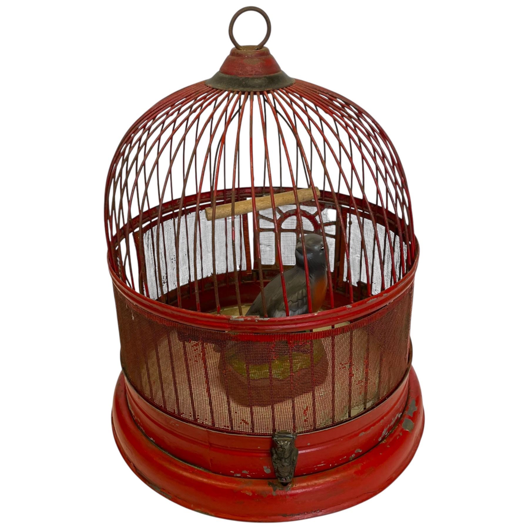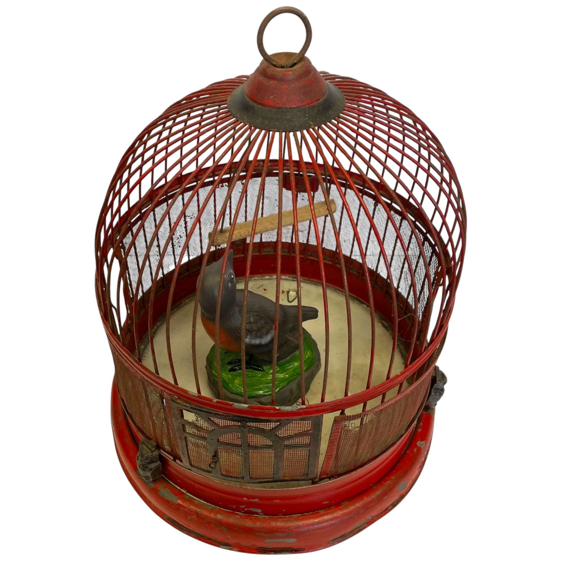 Vintage red metal beehive style bird cage featuring owl figurines around the edge. Includes a plastic battery-operated electric songbird. Cage dimensions are 12-Inch length, 12-Inch width, and 14.5-Inch height. Item is as pictured.