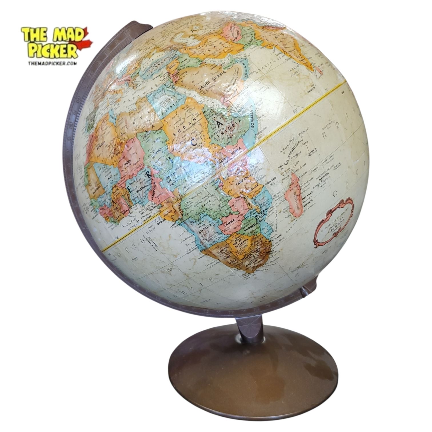 Replogle World Classic 12-inch raised relief globe with antique finish. Features raised topographical details and metal semi-meridian, mounted on a walnut base. Cartography reflects the USSR, dating the globe to pre-1991. Designed to illustrate geographic terrain with tactile elevation.