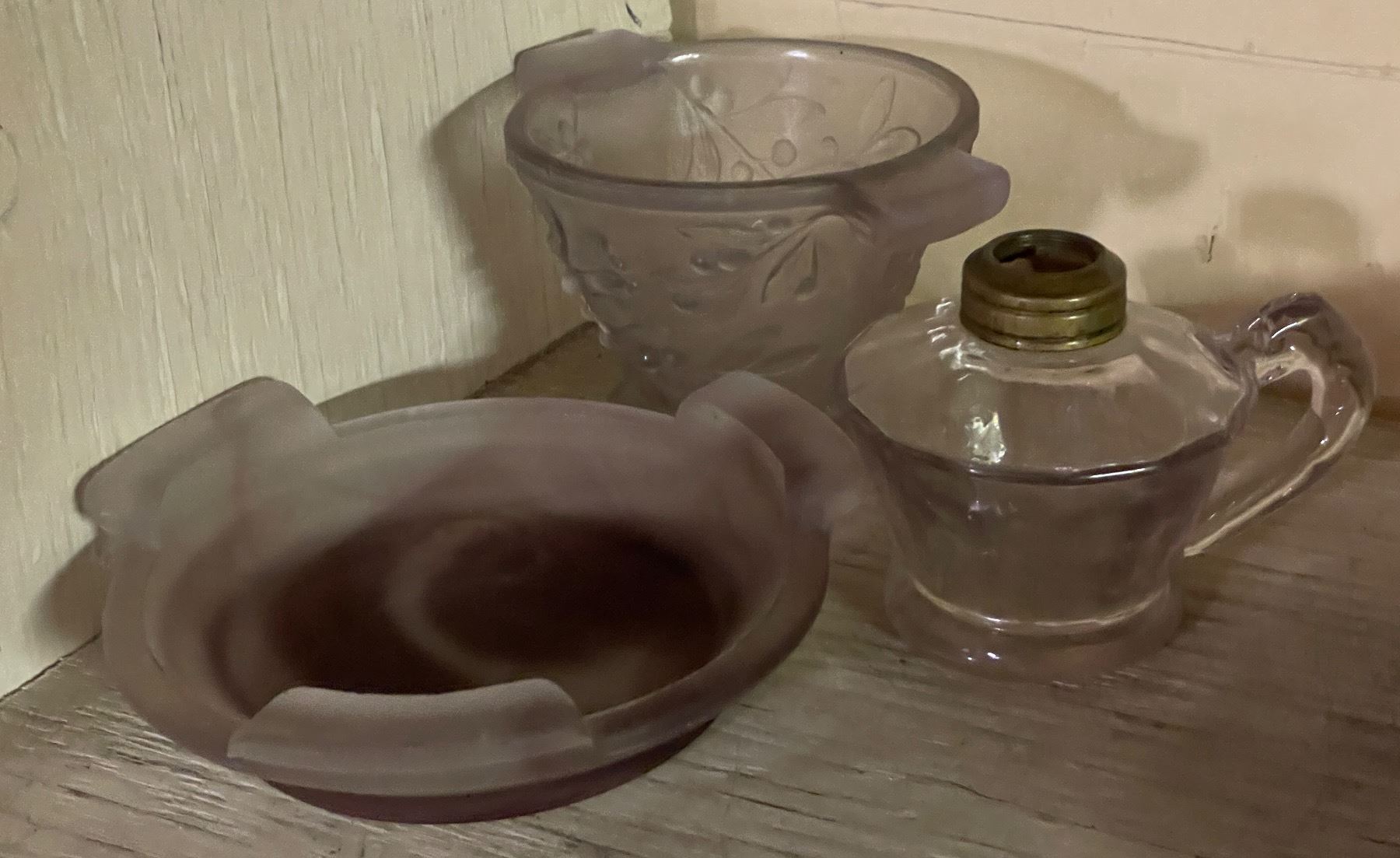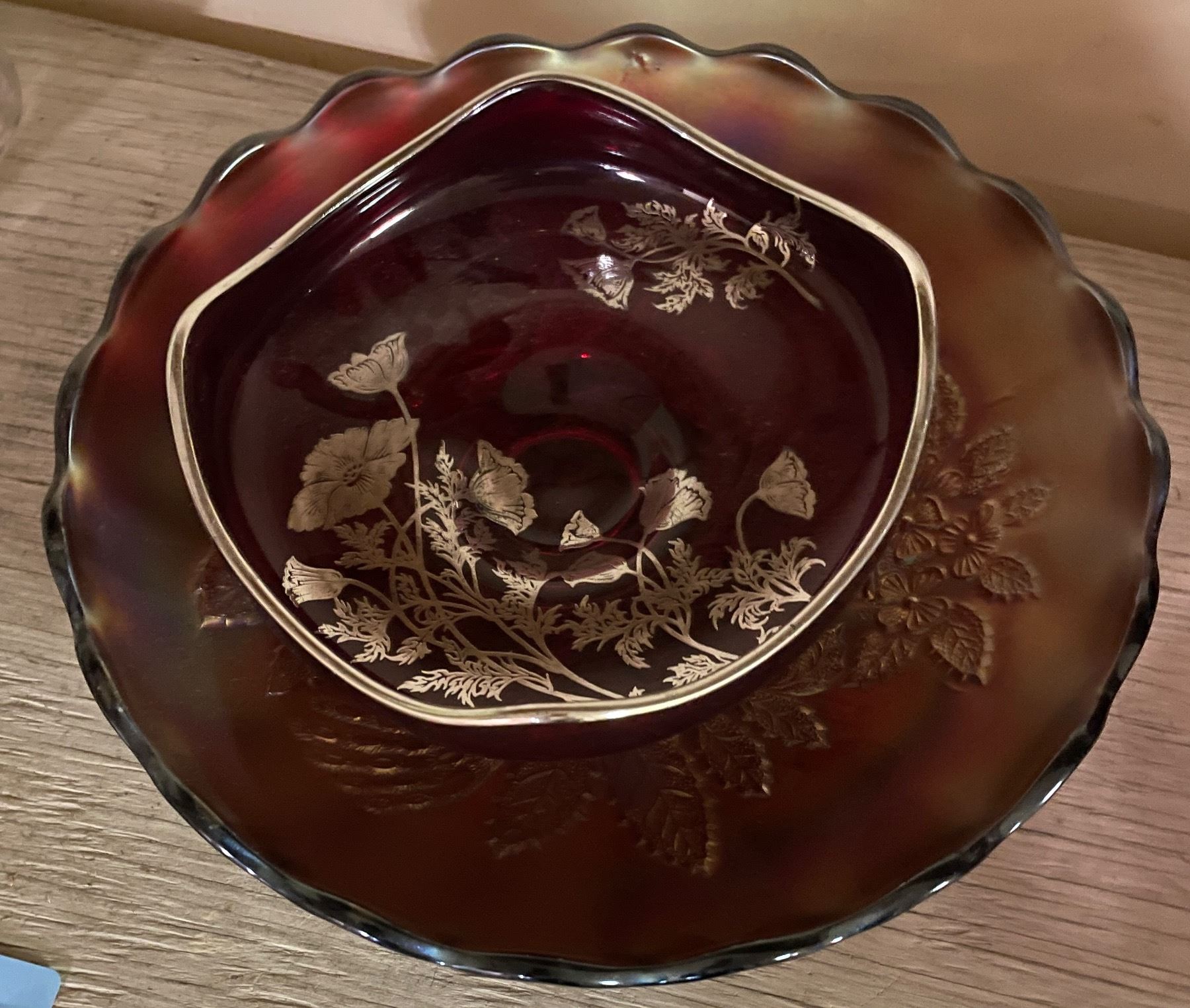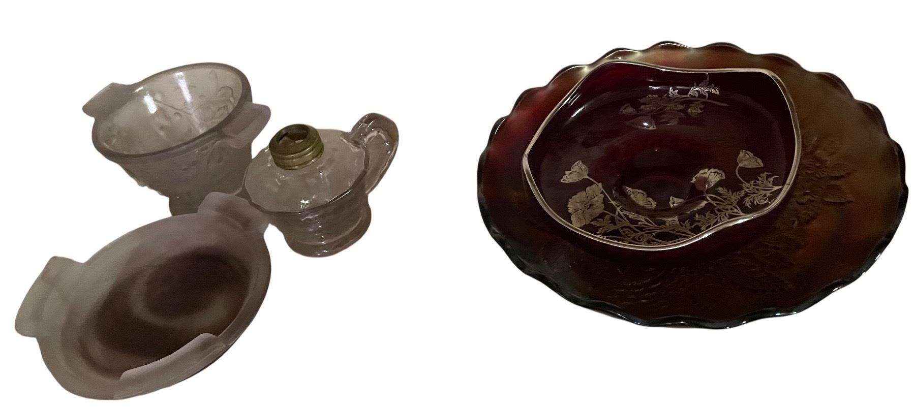 Vintage Ruby Red Sterling Overlay Poppy Bowl, Iridescent Carnival Glass, and Frosted Glass Collection