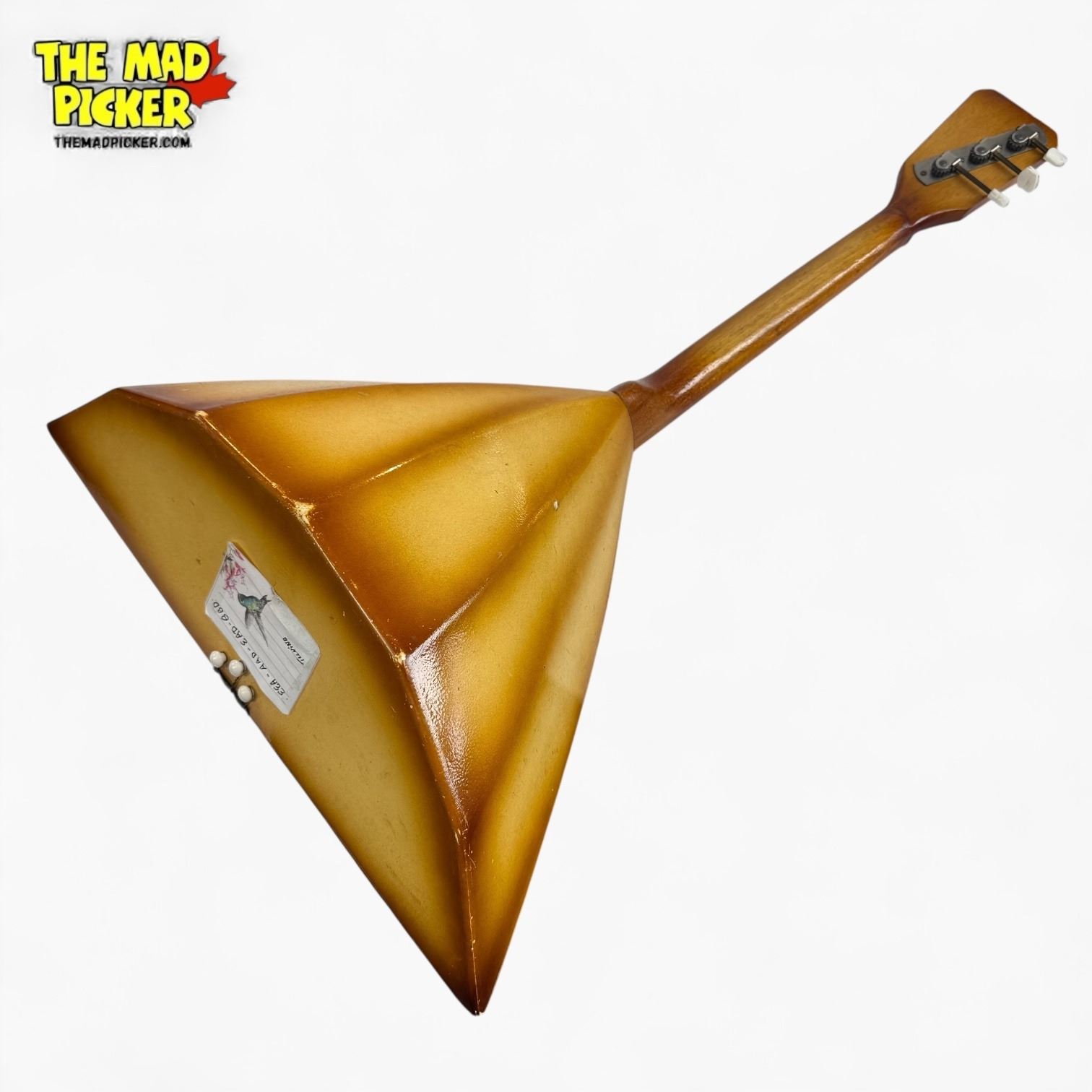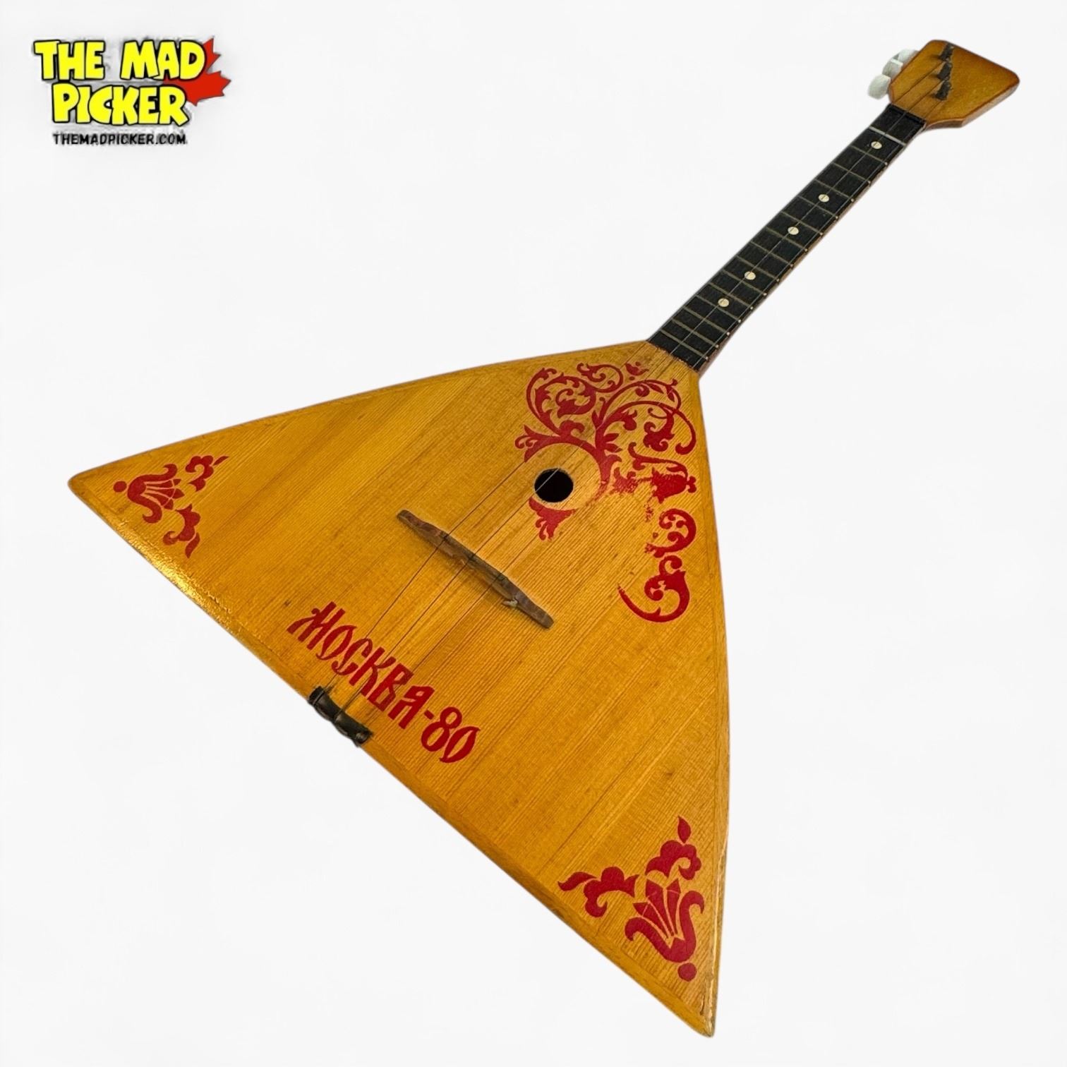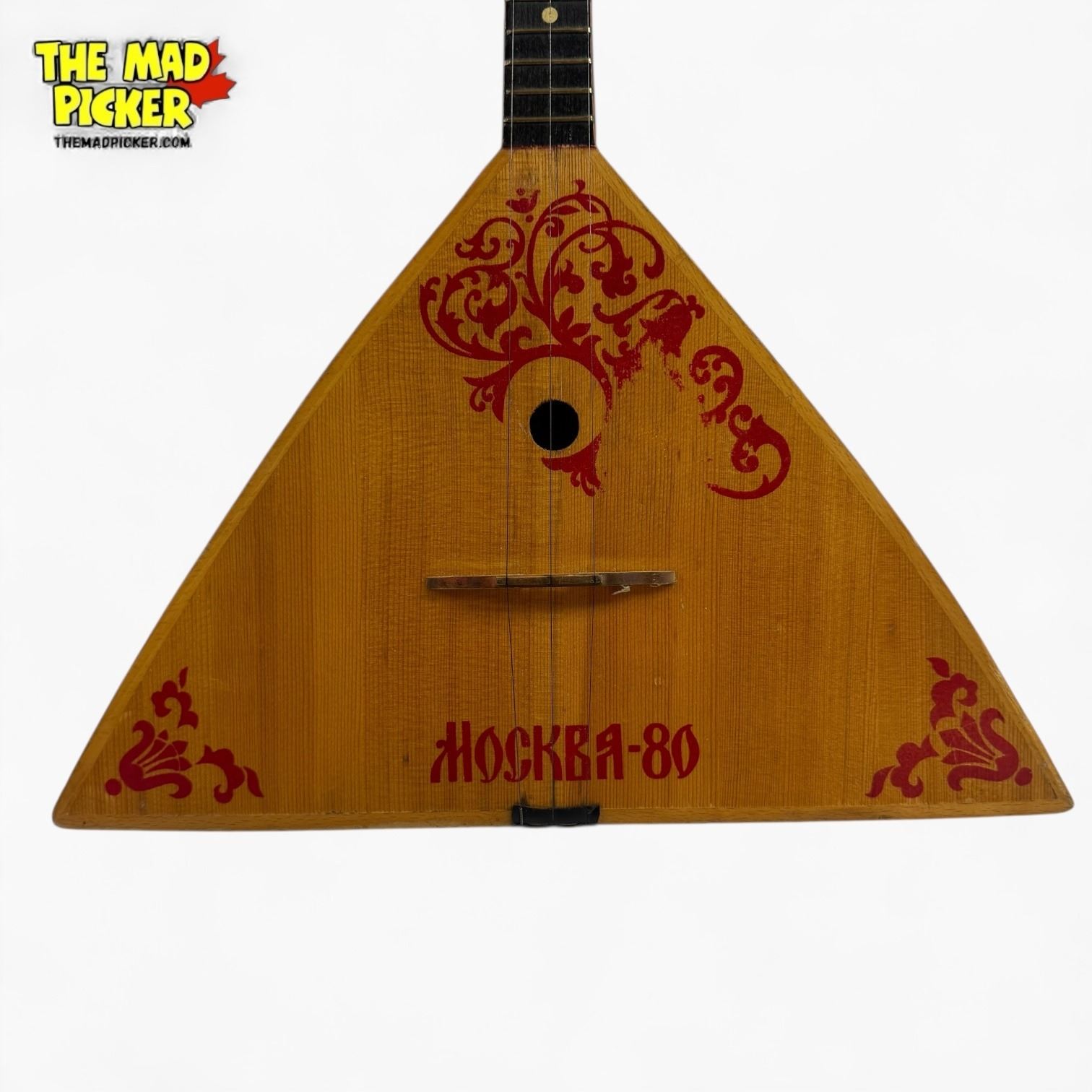 Vintage Russian Prima Balalaika with triangular body and three strings. Likely from Moscow, 1980s. Features fretted neck and is designed for standard tuning of E-E-a. Prima balalaikas are the most common size in traditional Russian folk music.