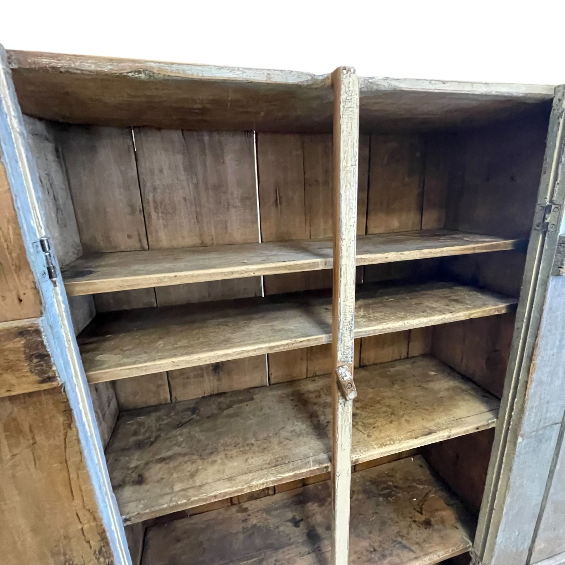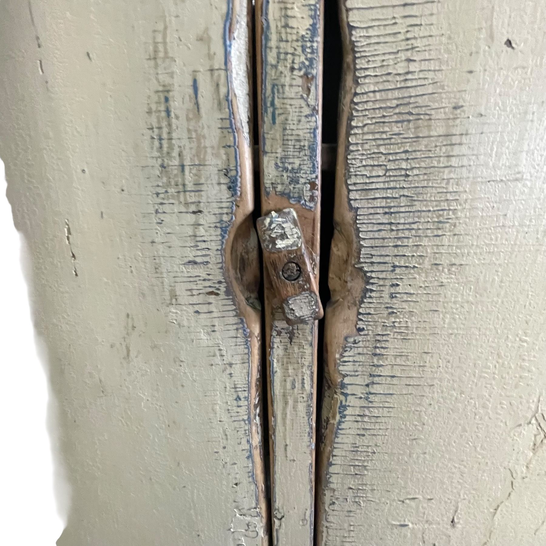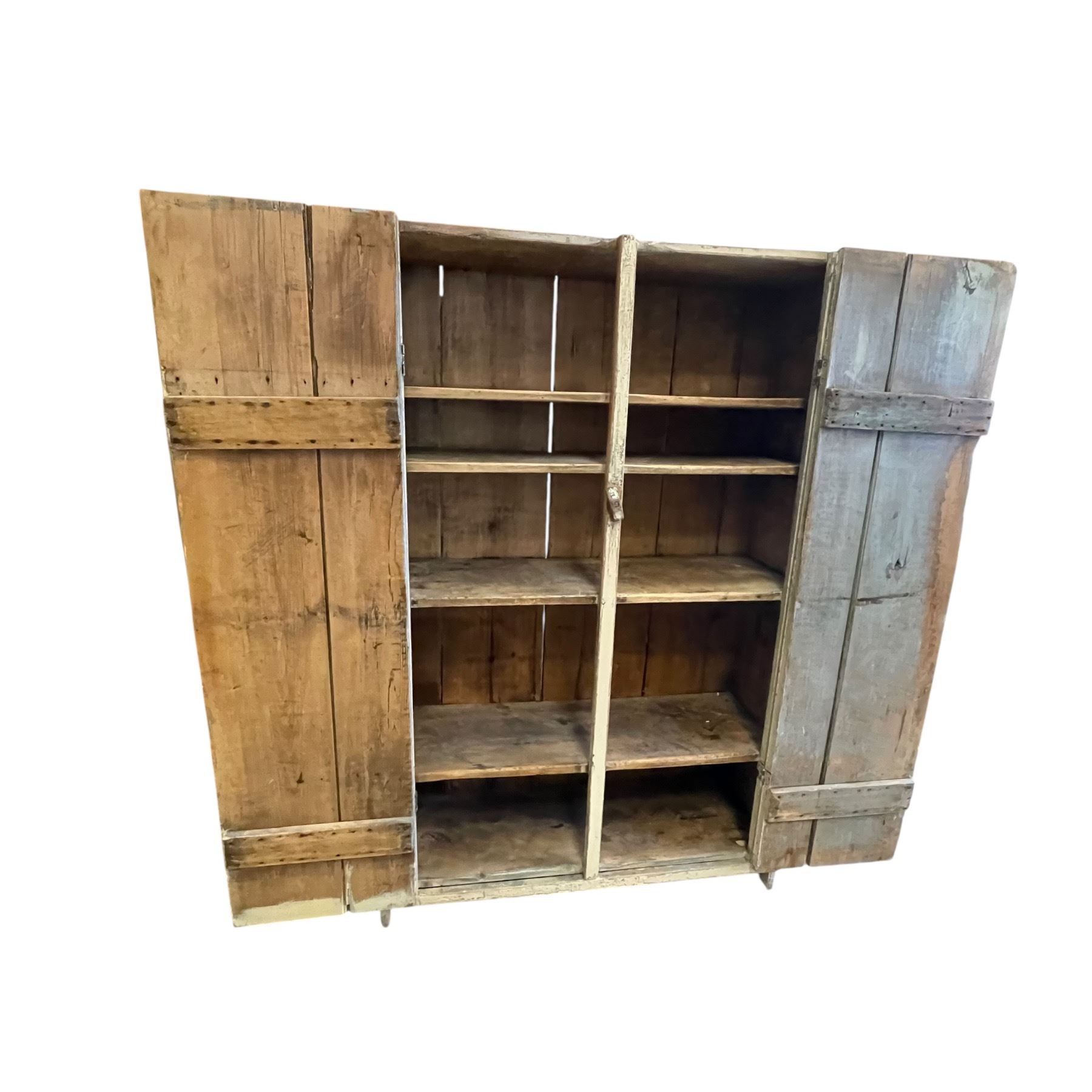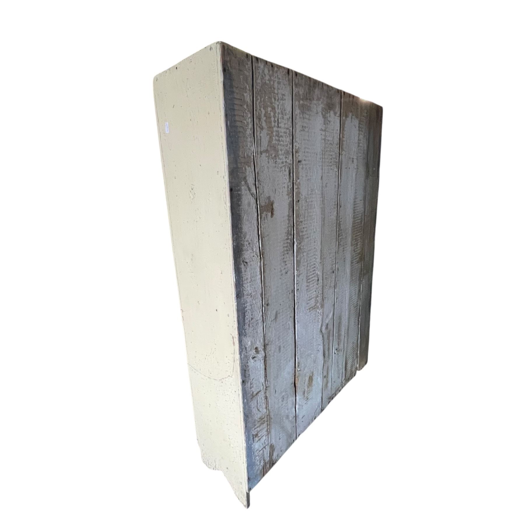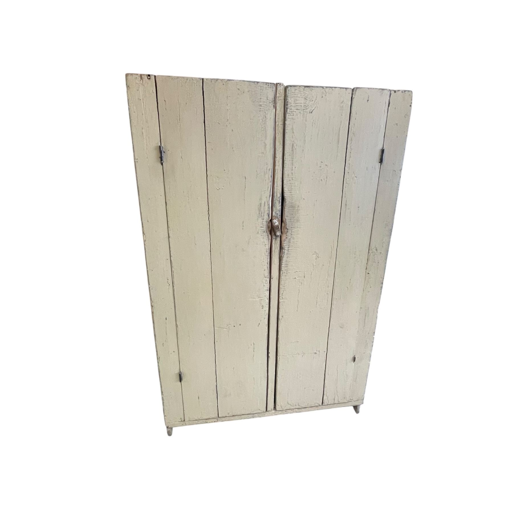 Vintage rustic storage cabinet made of barnboard. Features double doors and interior shelves. Cream colour finish. Measures 42.5-Inch in length, 15-Inch in width, and 65-Inch in height. Item is as pictured.