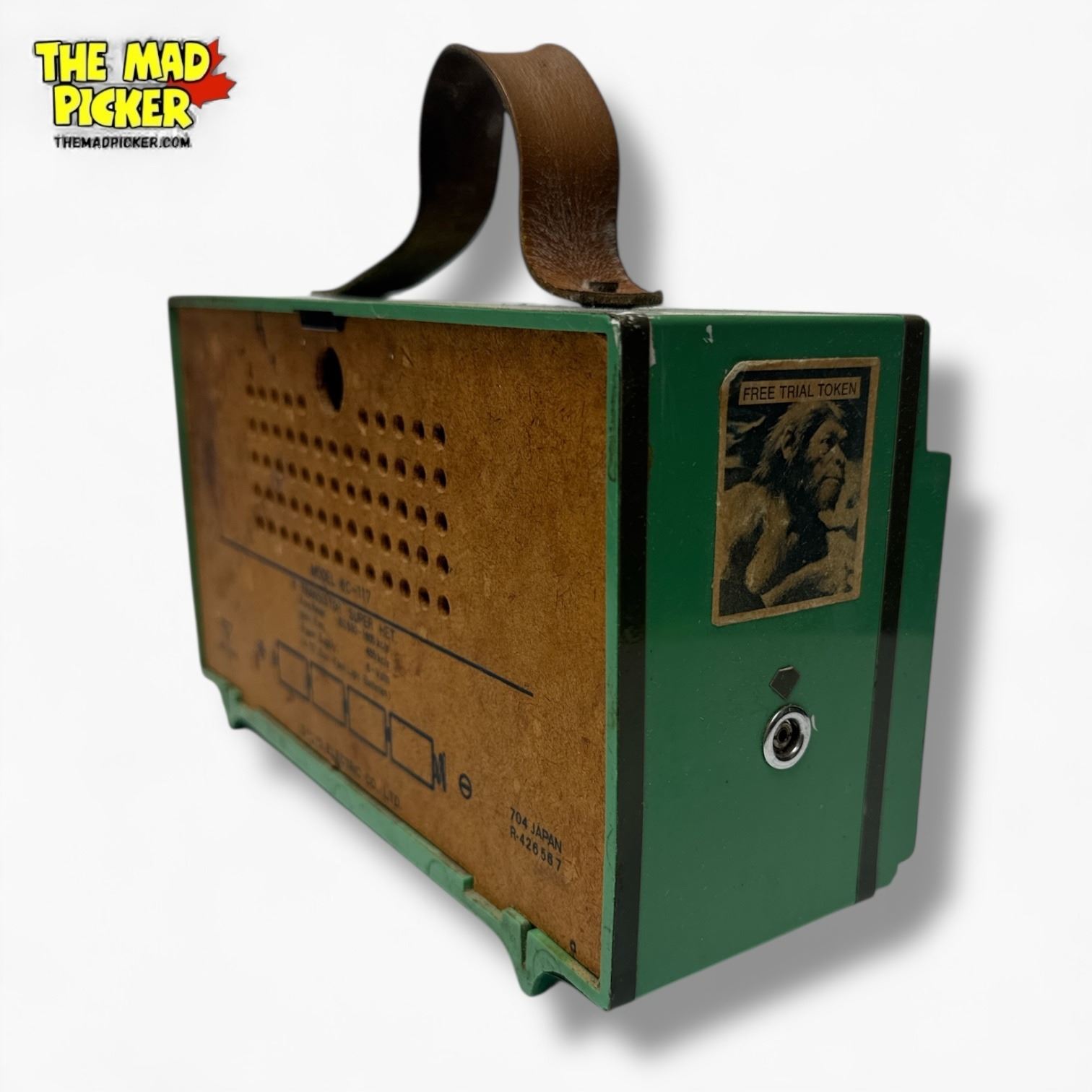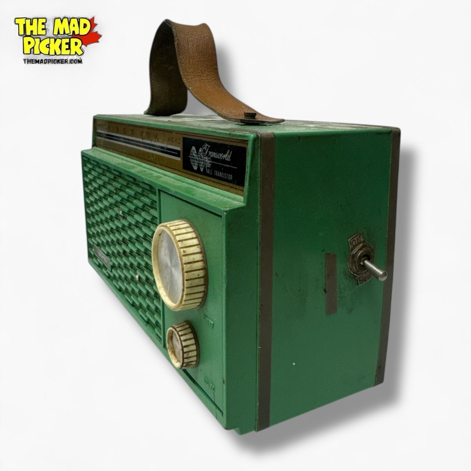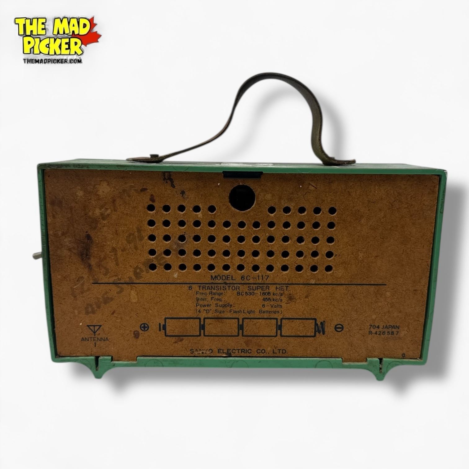 Sanyo Transworld model 6CA-119 AM radio, produced circa 1968-1970. Features distinctive green lunchbox-inspired design with carry handle. Compact and portable, it operates with AM frequency reception. Popular mid-century model reflecting innovative design trends of the era.