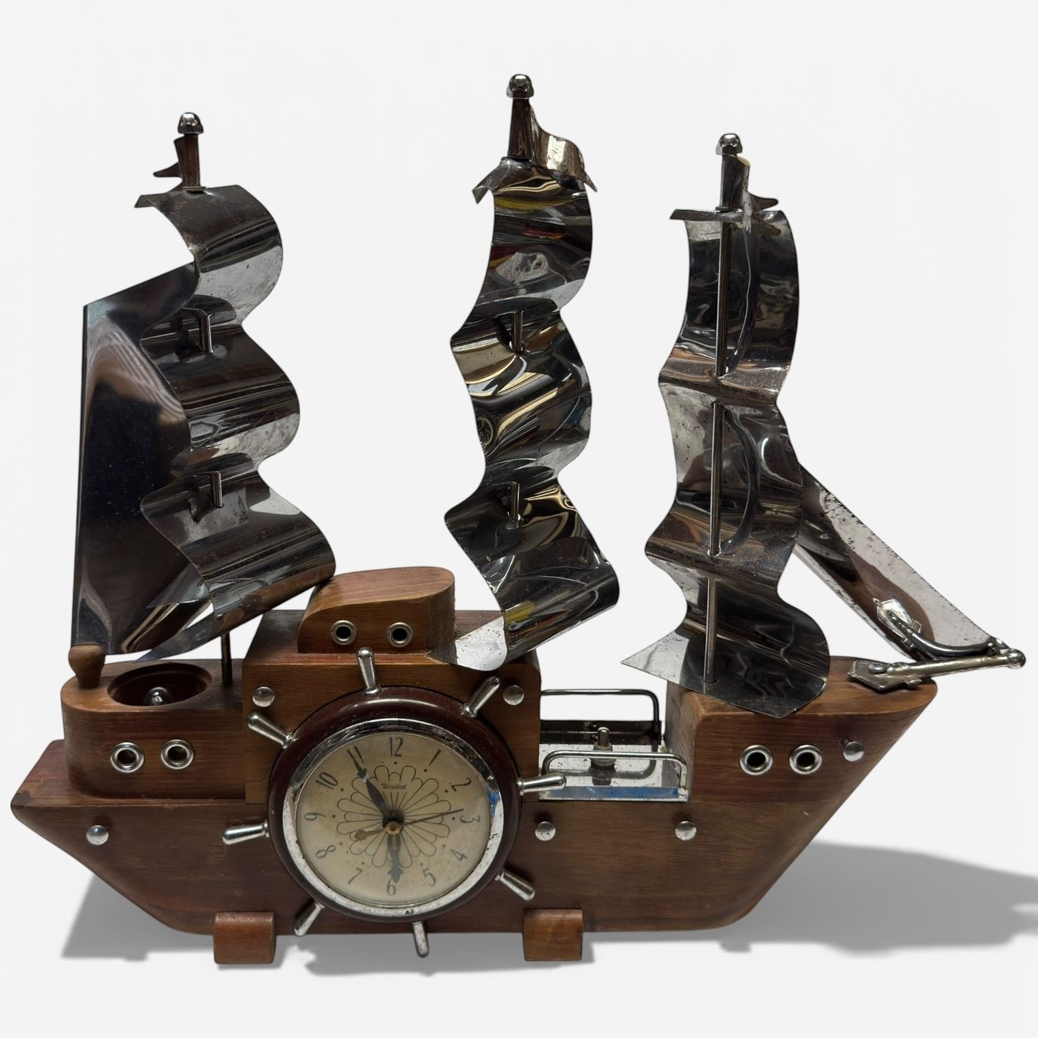 Vintage Sessions United Mid-Century Clipper Ship Electrified Table Clock. Crafted with a shaped wooden body and stylized metal sails, showcasing mid-20th-century maritime decorative arts. Functions as a mantel clock and night light. Dimensions are approximately 19.3-Inch wide and 15.8-Inch high.