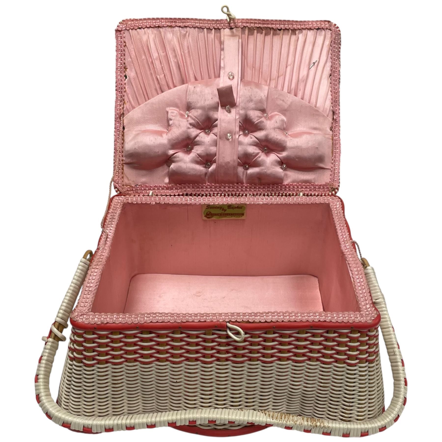 Vintage sewing basket with red and white wicker construction. Dimensions are Length 13-Inch, Width 10-Inch, Height 5.25-Inch. Item is as pictured.