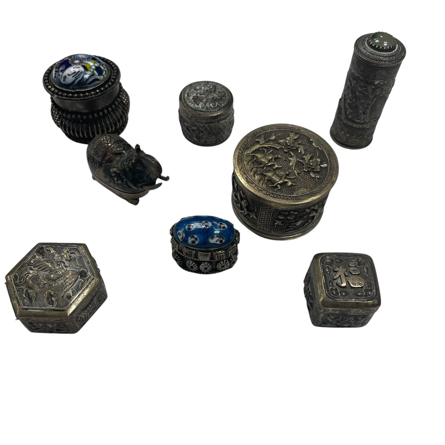 Lot includes a vintage silver plated teapot with ornate detailing and a collection of 7 small trinket or pill boxes. Boxes vary in design and materials. Item is as pictured.