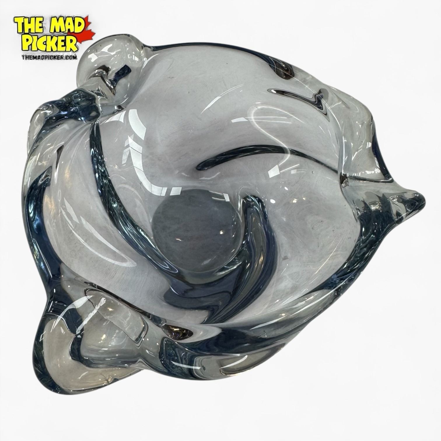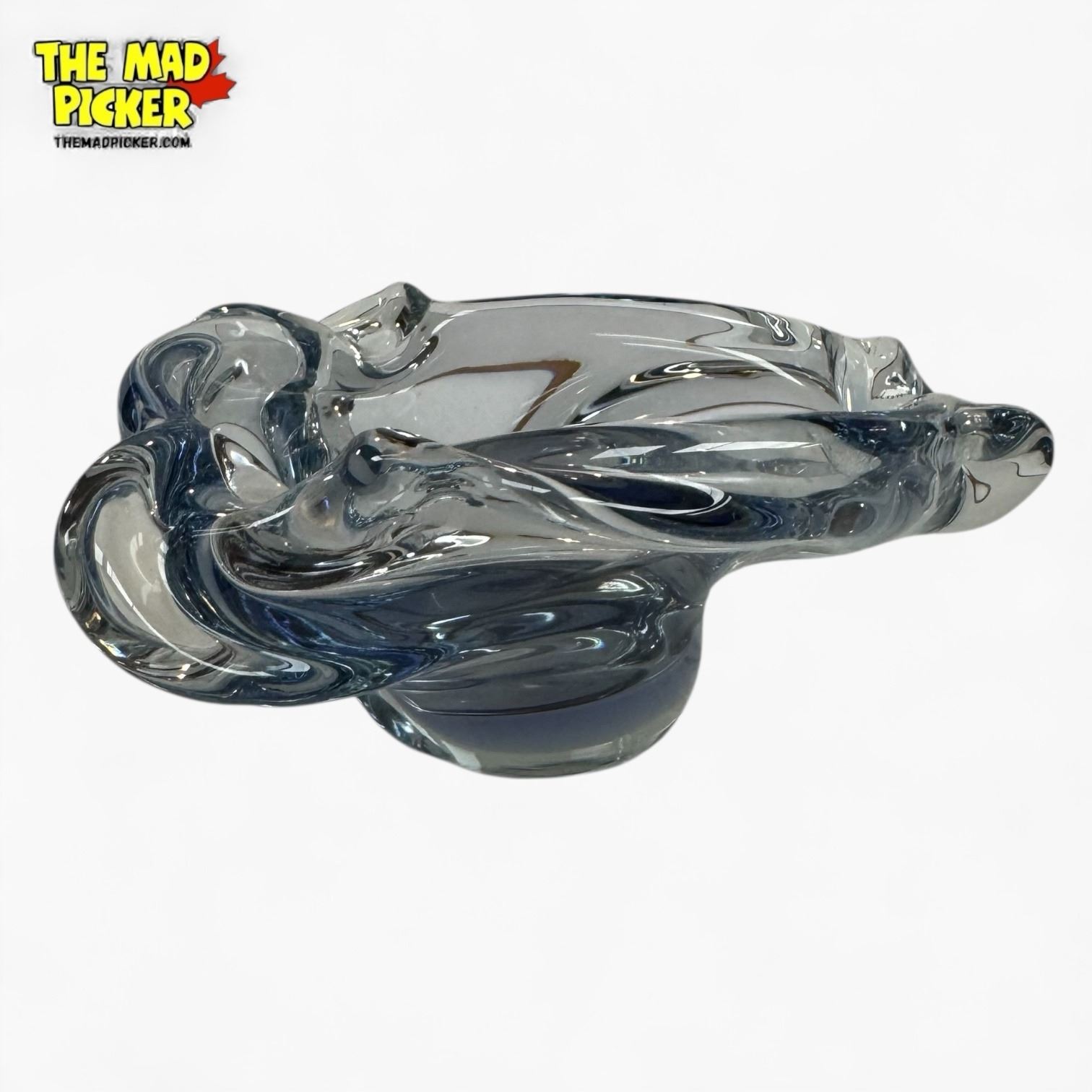 Vintage Skrdlovice art glass bowl attributed to Jan or Jaroslav Beranek unsigned. Features a freeform design with 'pulled ear' lobes, hand-formed using traditional techniques. Mid-Century Modern piece with color shifting between aqua blue/purple. Heavy glass construction, ideal as a decorative bowl or ashtray.