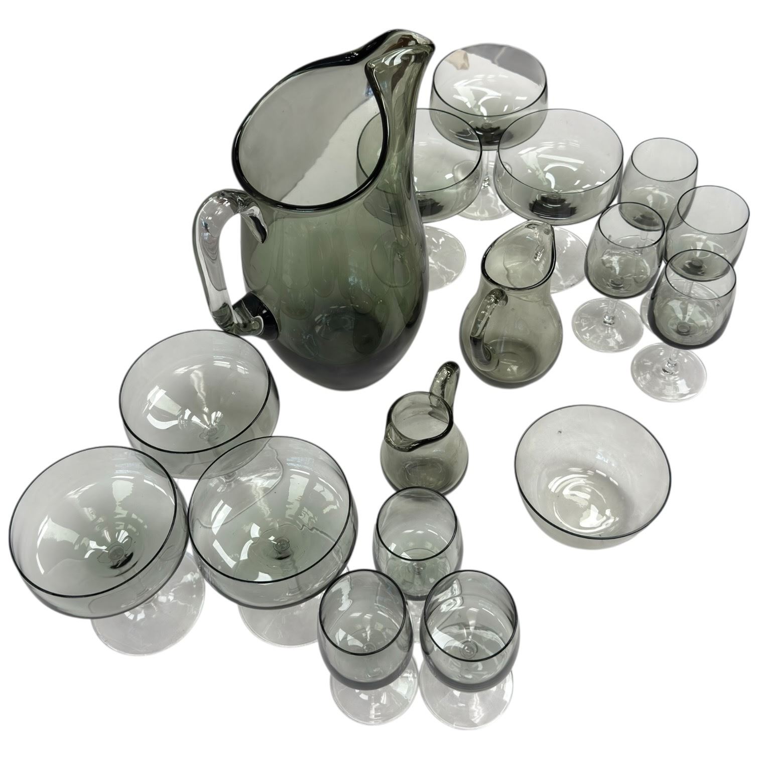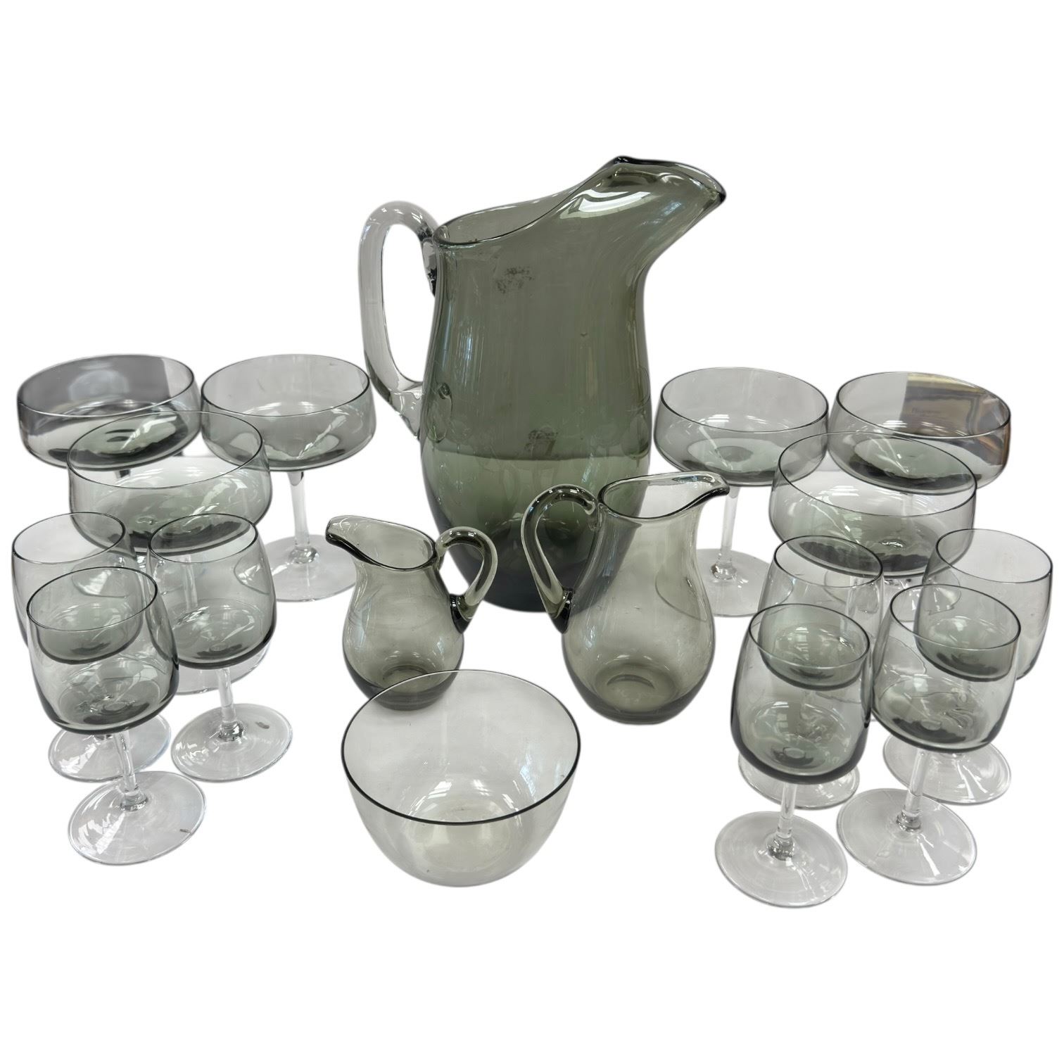 Set includes a vintage smoked glass pitcher with matching stemware designed in mid-century modern style. Similar in design aesthetics to works by Holmegaard, known for elegant glassware. Item is as pictured.