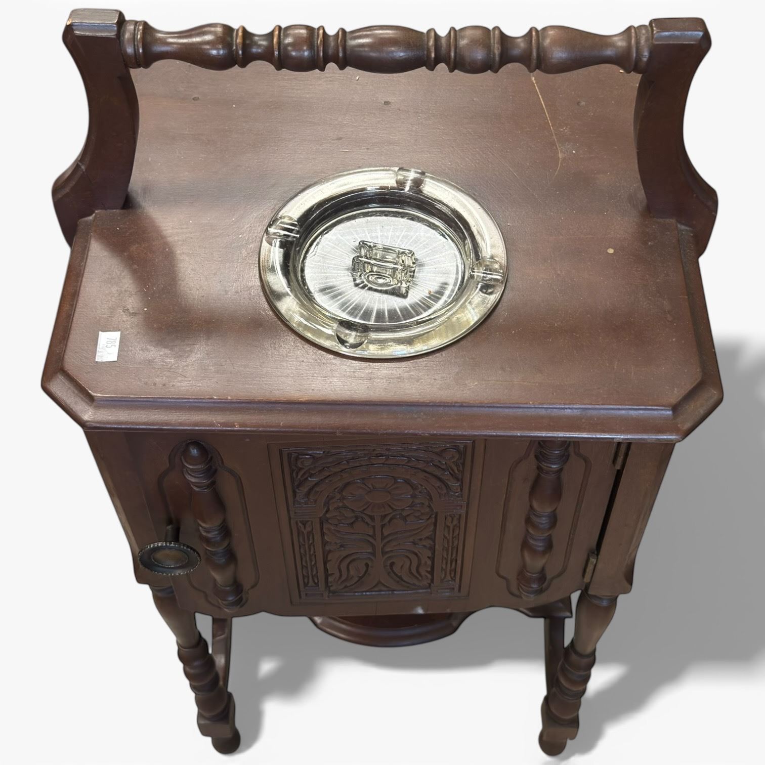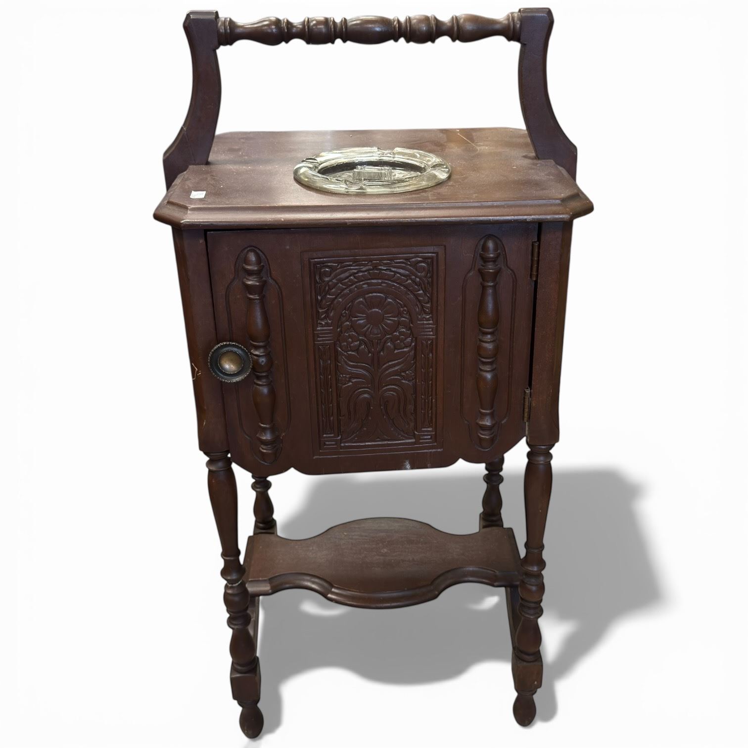 Vintage smokers table featuring a handle, built-in cupboard, and glass ashtray. Dimensions are Length: 29-In, Width: 14-In, Height: 12-In. Item combines functional design elements for smoker use with integrated storage and ashtray. Item is as pictured.