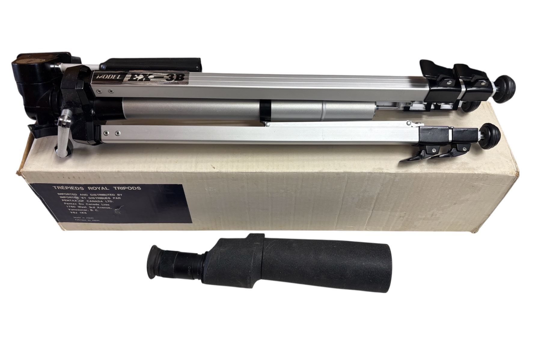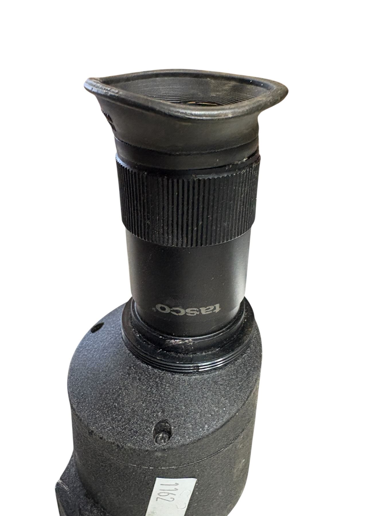 Vintage spotting scope with metal adjustable tripod. Likely mid-20th century manufacture. Features a manual focus system and standard optical design. Ideal for terrestrial observations or similar use. Displays classic craftsmanship typical of the era. Item is as pictured.