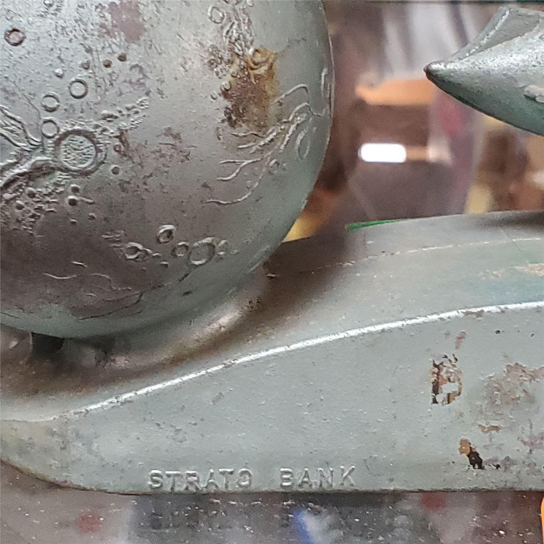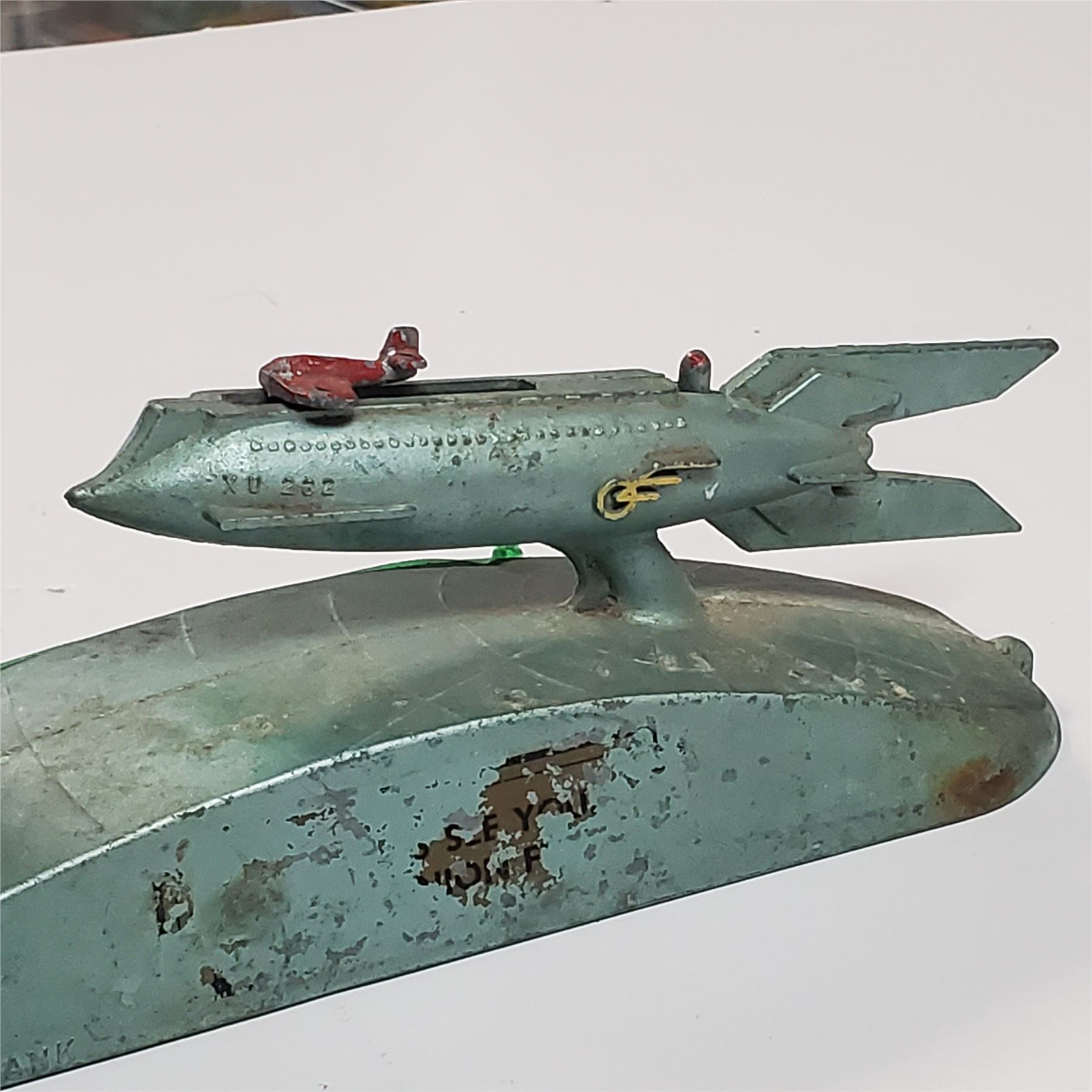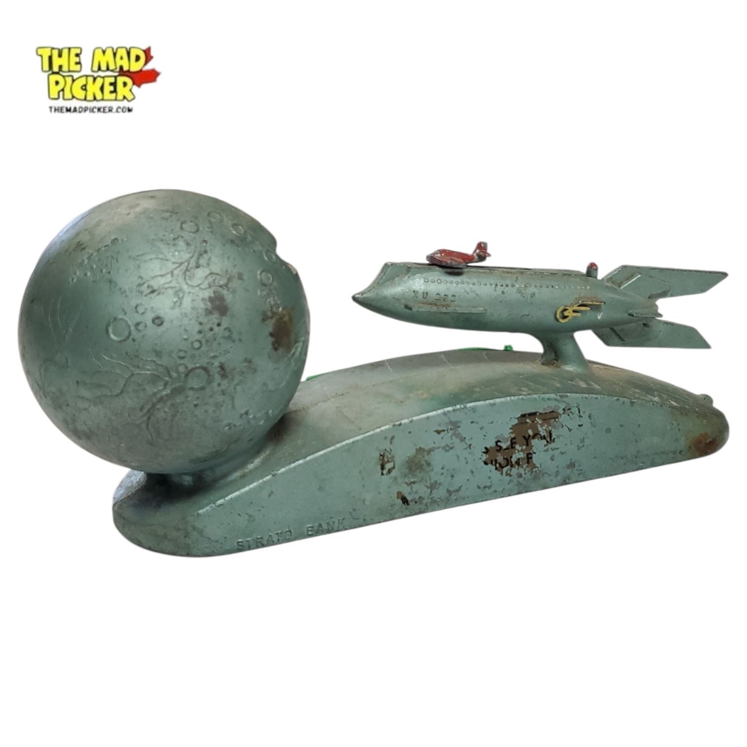 Strato Mechanical Coin Bank by Duro Pattern & Mold Co., patented in 1953. Features a mechanism that launches coins from a rocket into a 'moon.' Manufactured in the 1950s, this bank reflects the Space Age fascination of the era. Made of durable materials with intricate mechanical design.