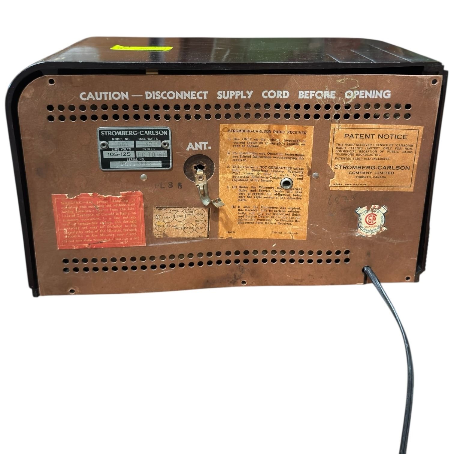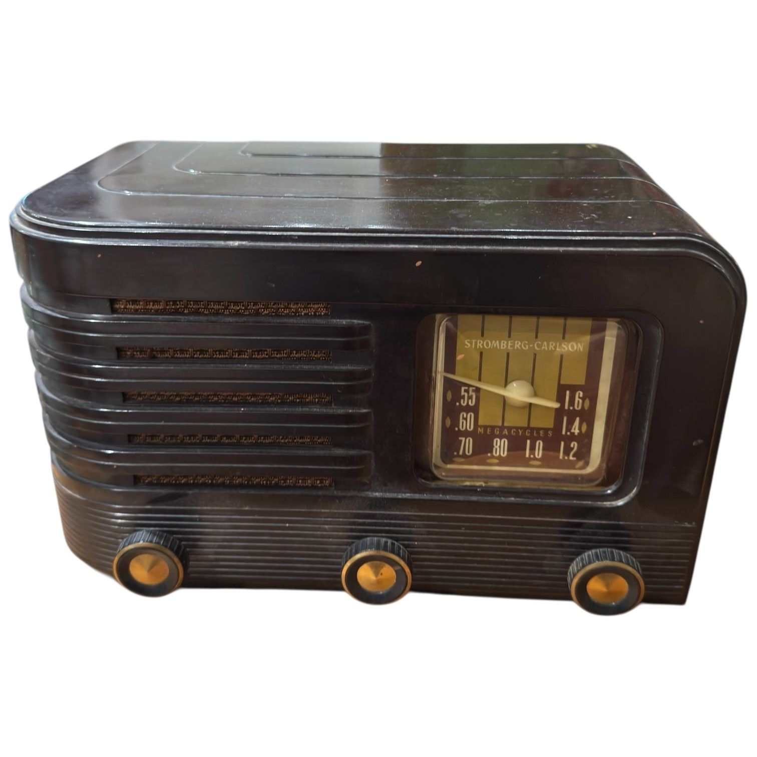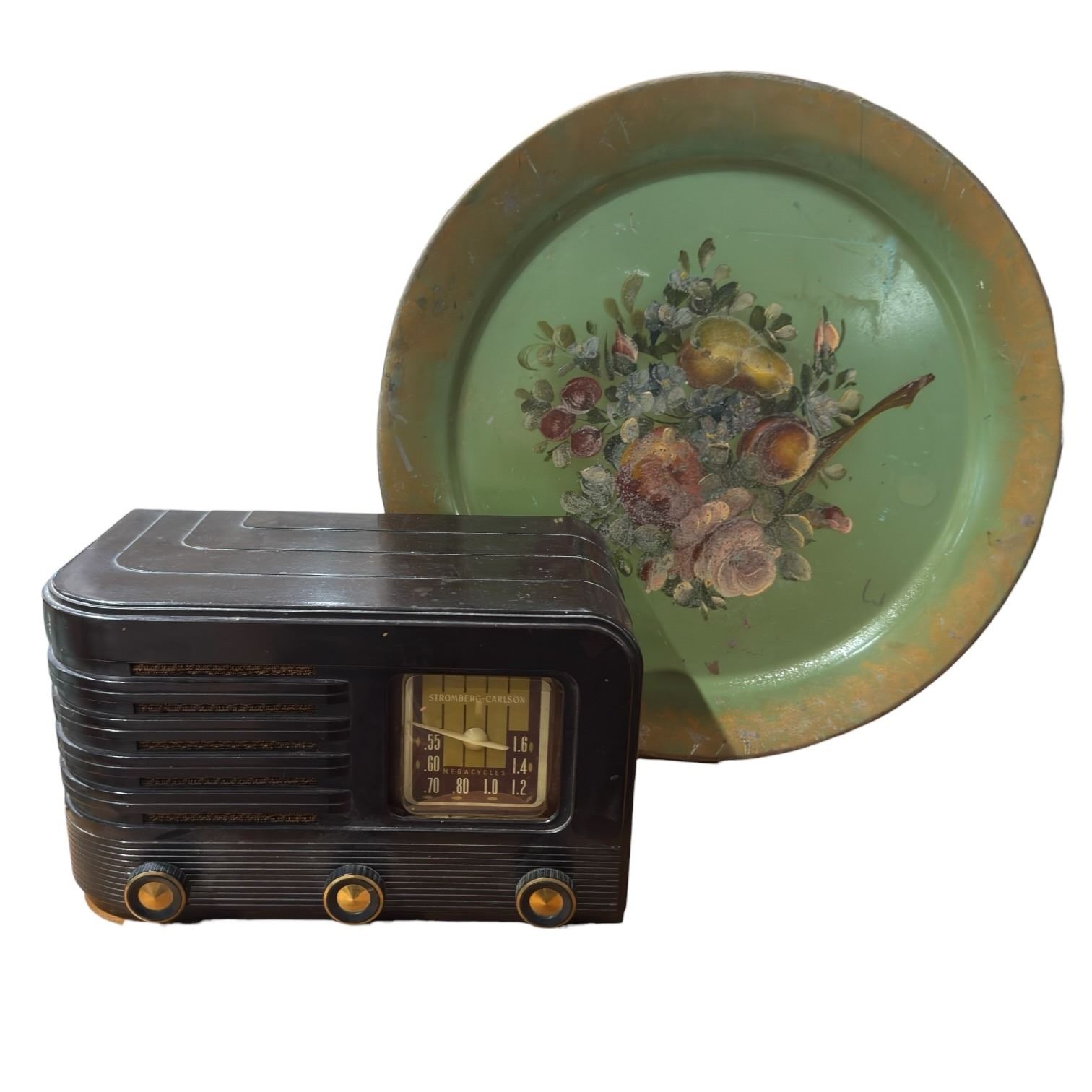 Lot includes a vintage Stromberg-Carlson Model 551 radio from the 1940s-1950s, featuring a Bakelite cabinet and vacuum tube technology, and a vintage metal platter with a floral print design. Both items show age-appropriate wear. Item is as pictured.