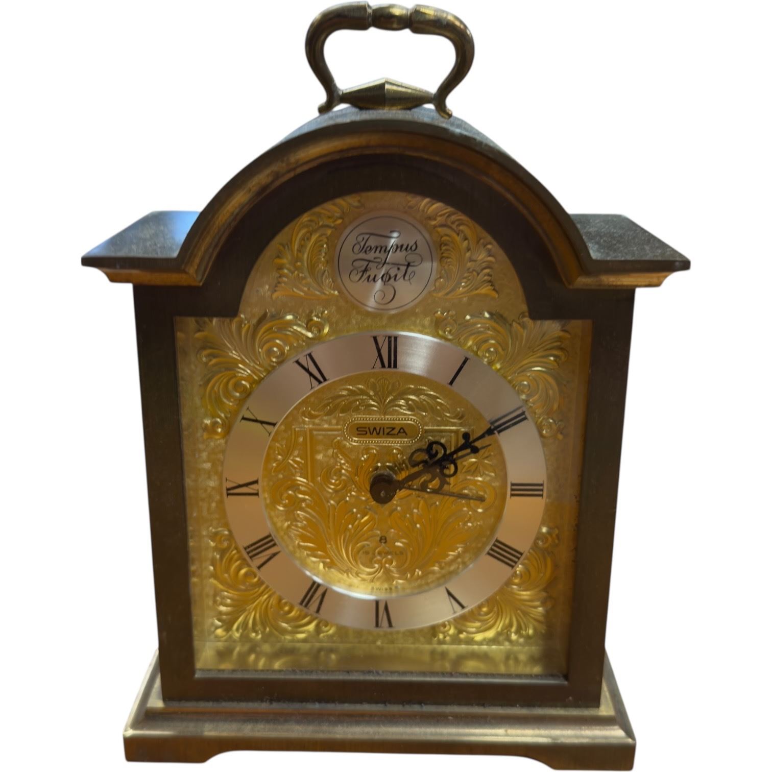 Vintage Swiza Tempus Fugit brass clock measuring 6.25-Inch tall. Features brass construction and 'Tempus Fugit' inscription. Swiss-made Swiza piece known for its craftsmanship and design. Item is as pictured.