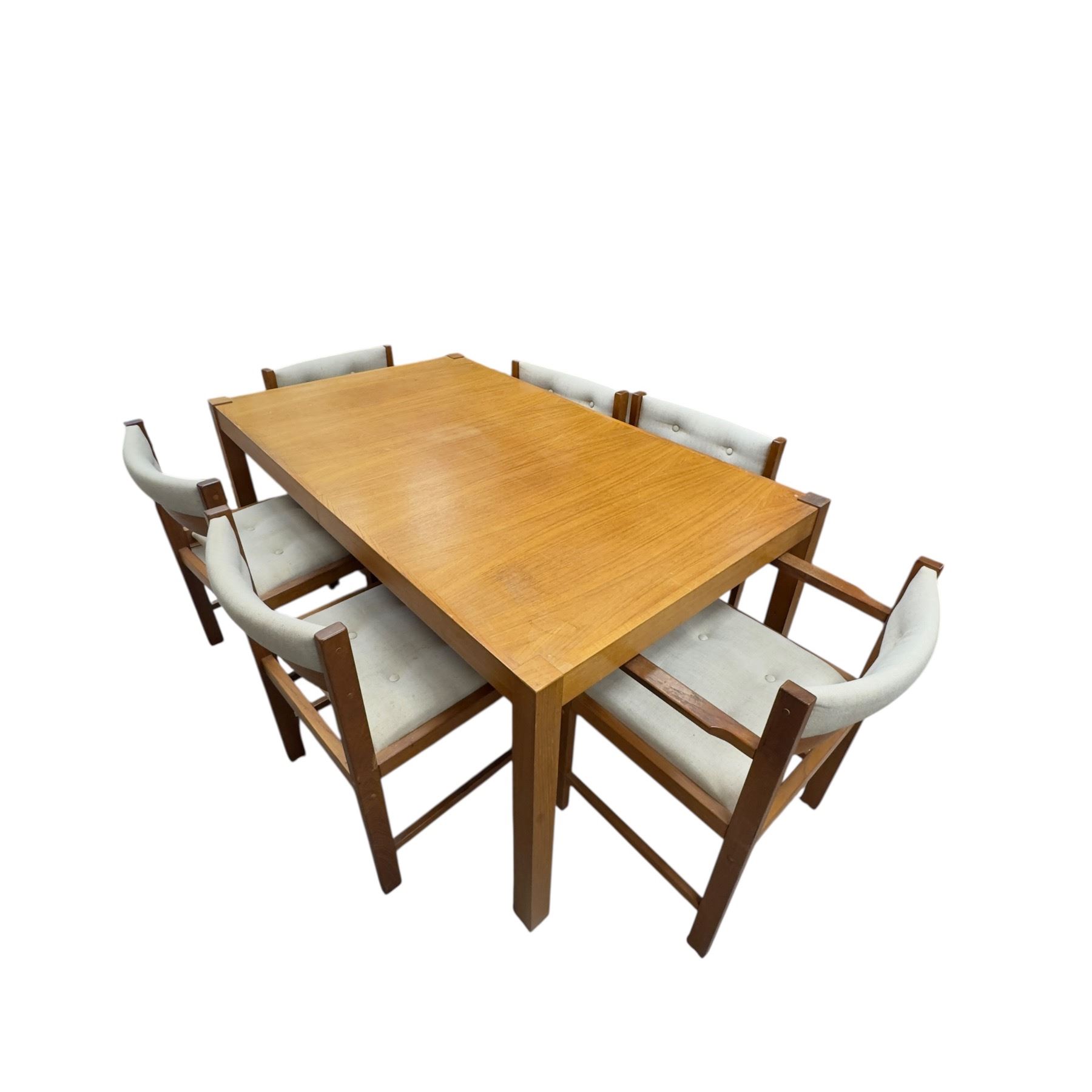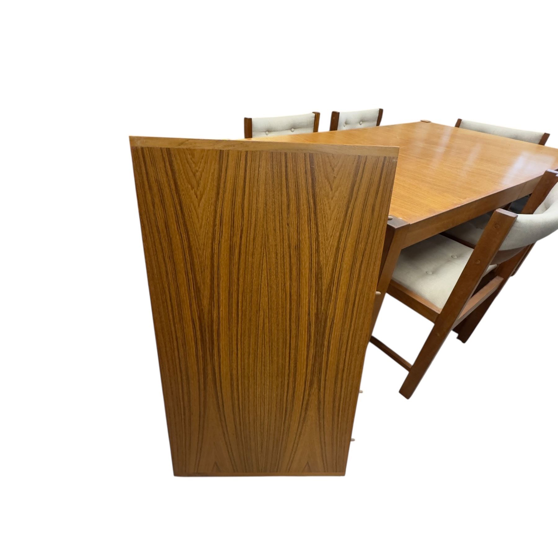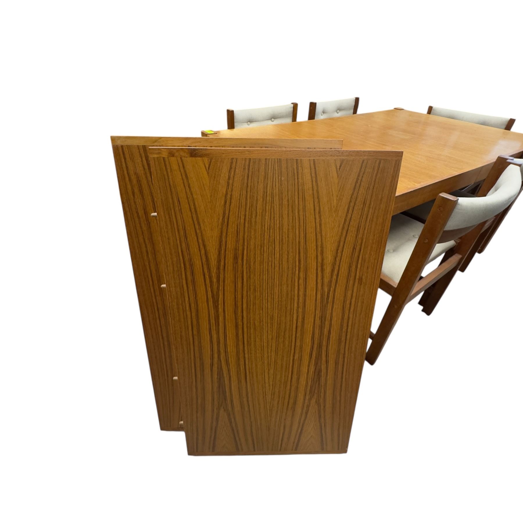 Vintage teak dining table measuring 60x36x25-Inch with six matching chairs. Includes two 14-Inch wide leaves to extend the table. The set showcases a cohesive design in durable teak. Item is as pictured.