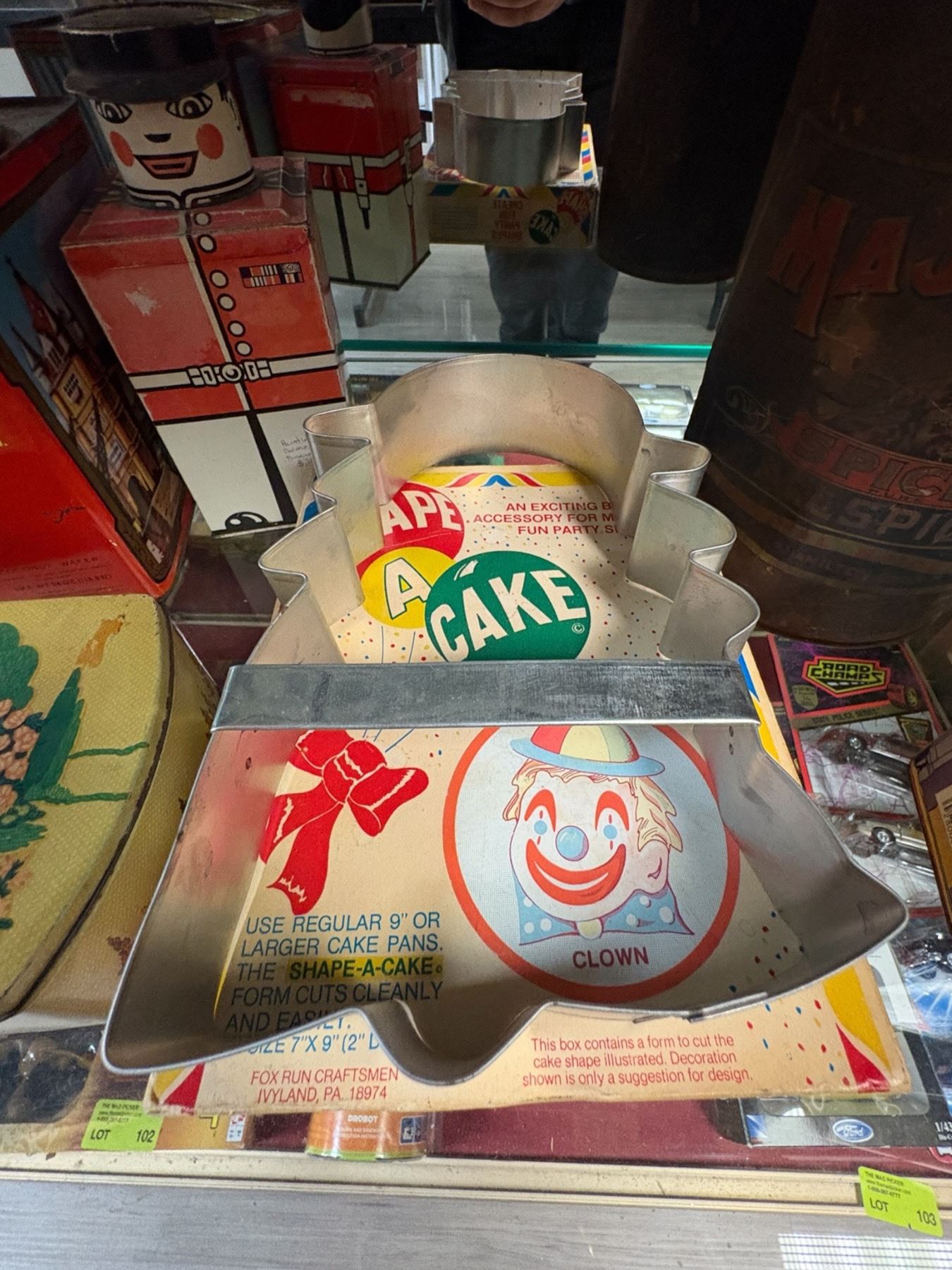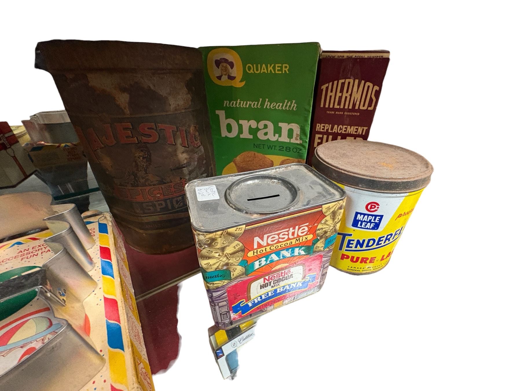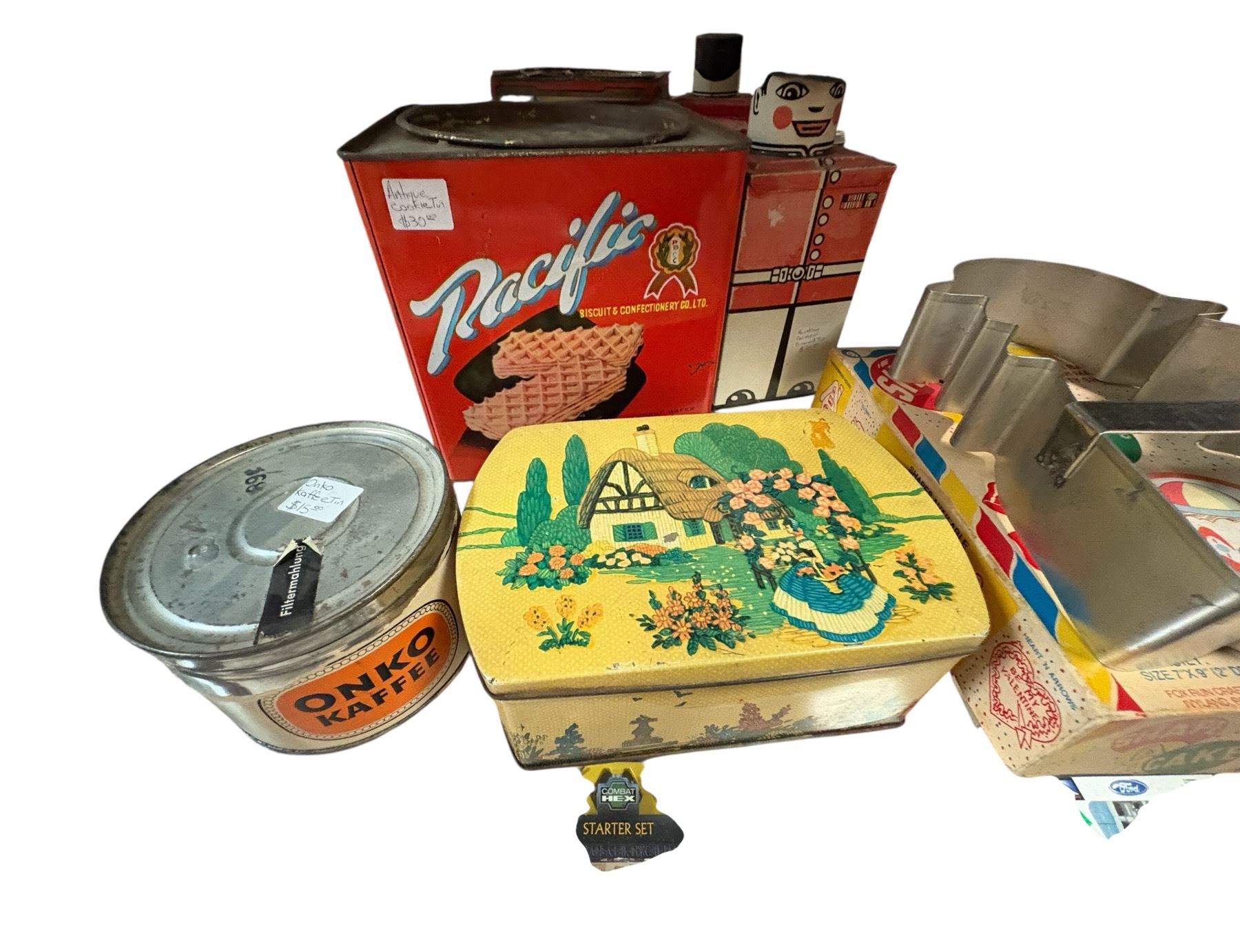 Assortment of vintage tins including Nestle, Tenderflake, Onko Kaffee, Majesty, and Pacific brands. Includes various shapes, sizes, and designs, such as a cake mold tin. Likely mid-20th century pieces, showcasing advertising and packaging of the era. Visible wear consistent with age and use.