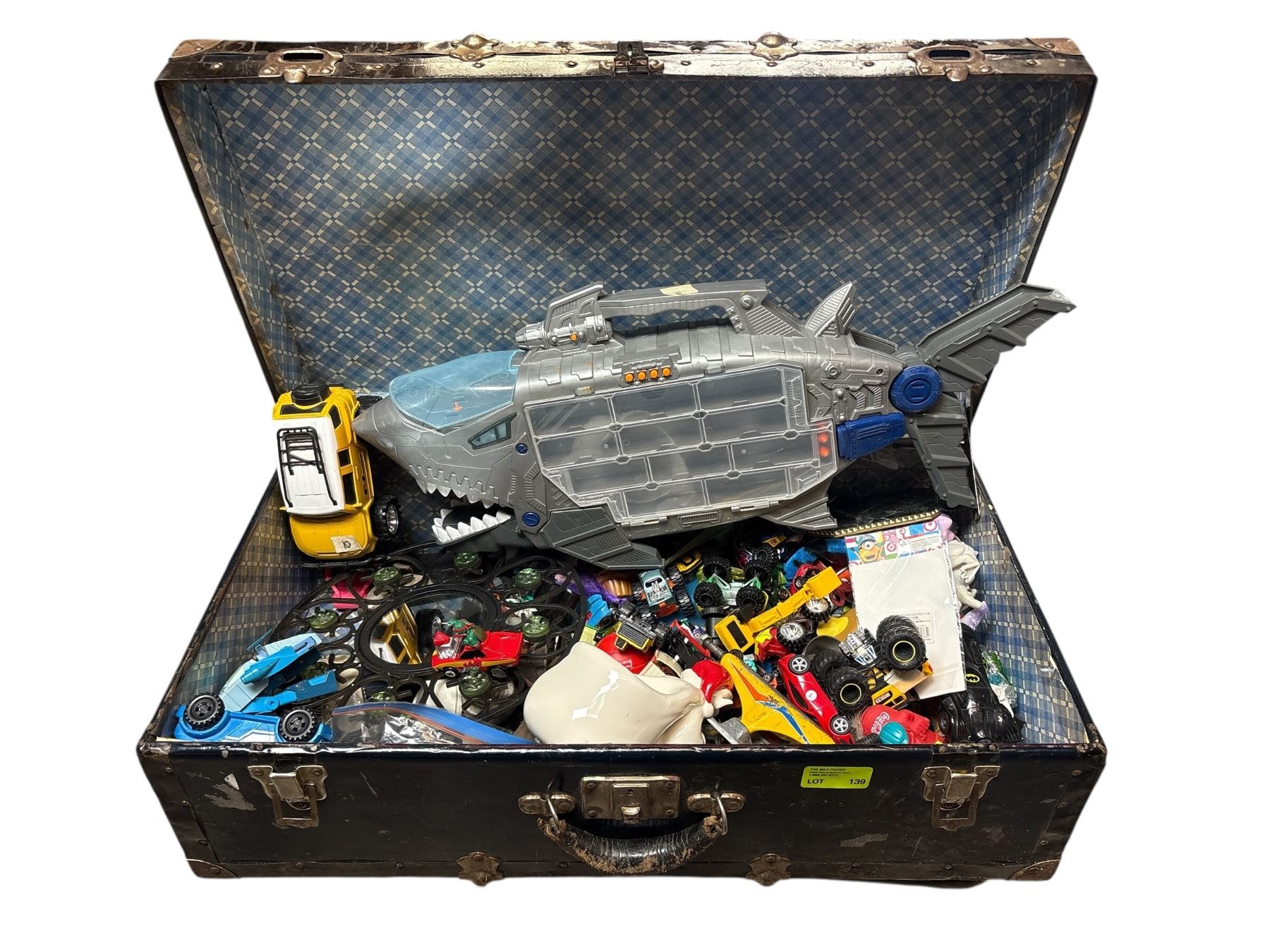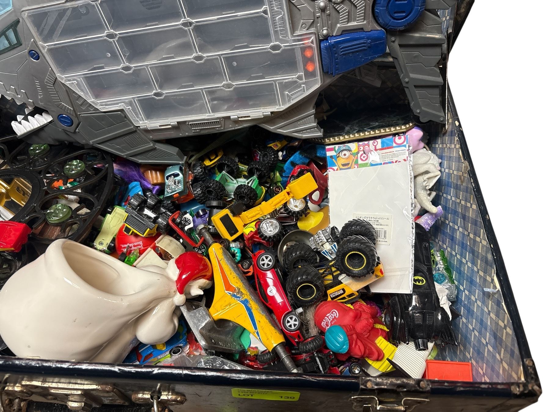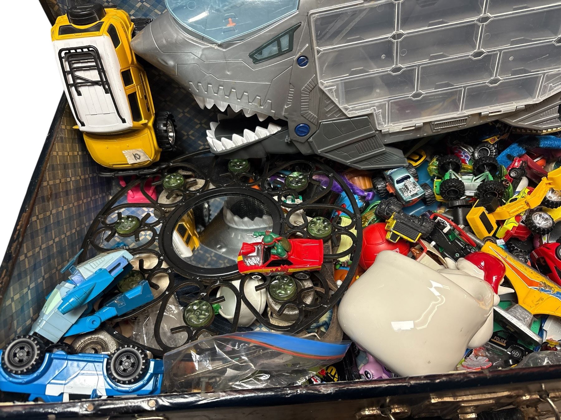 Treasure chest style luggage containing a mixed collection of toys, including vintage diecast vehicles, Transformers figures, and miscellaneous toy types. Specific brands, models, and condition details of Luggage design resembles a classic treasure chest. Item is as pictured.