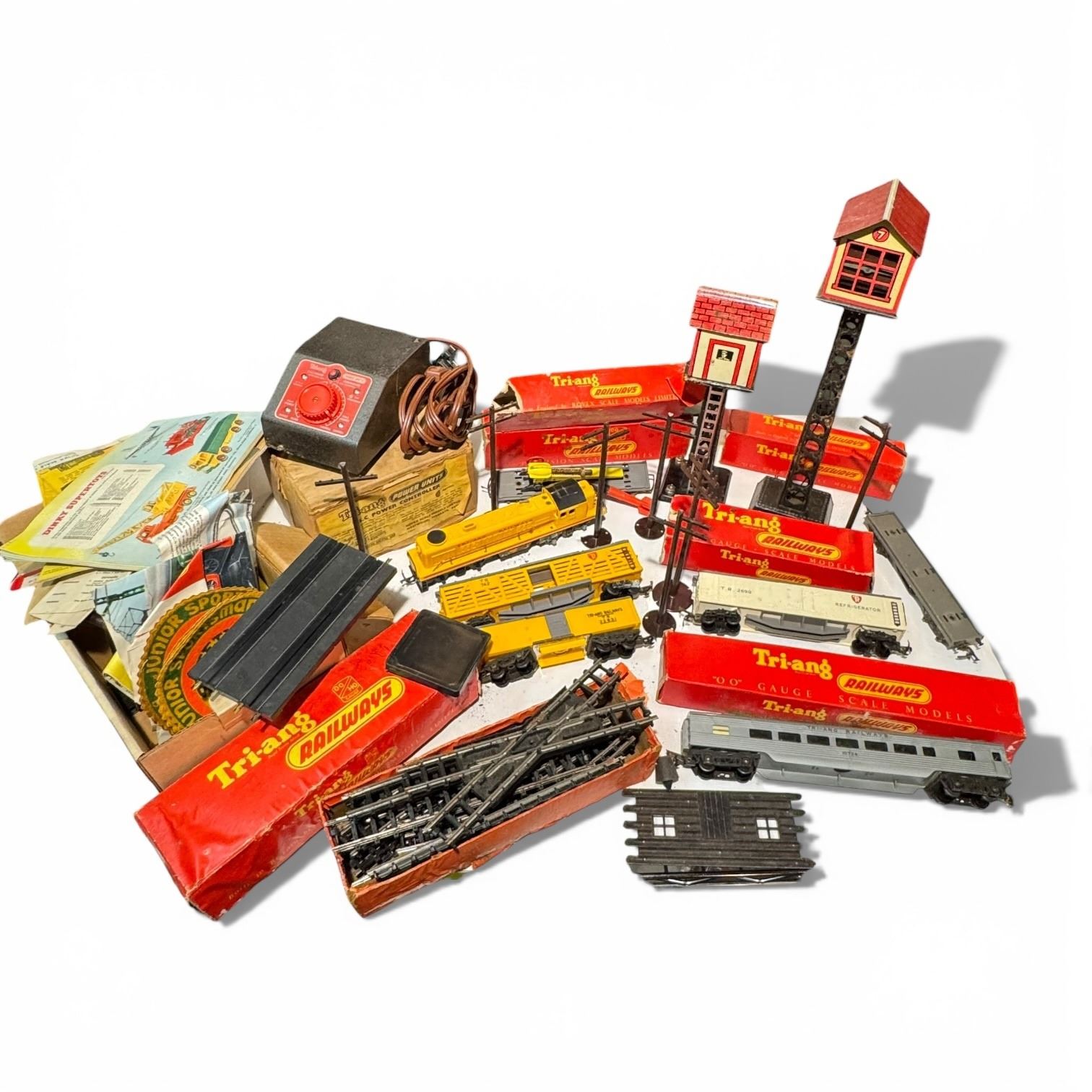 Vintage Tri-ang HO Scale Train Set with Transformer and 2 Tin Towers - Many of the original boxes