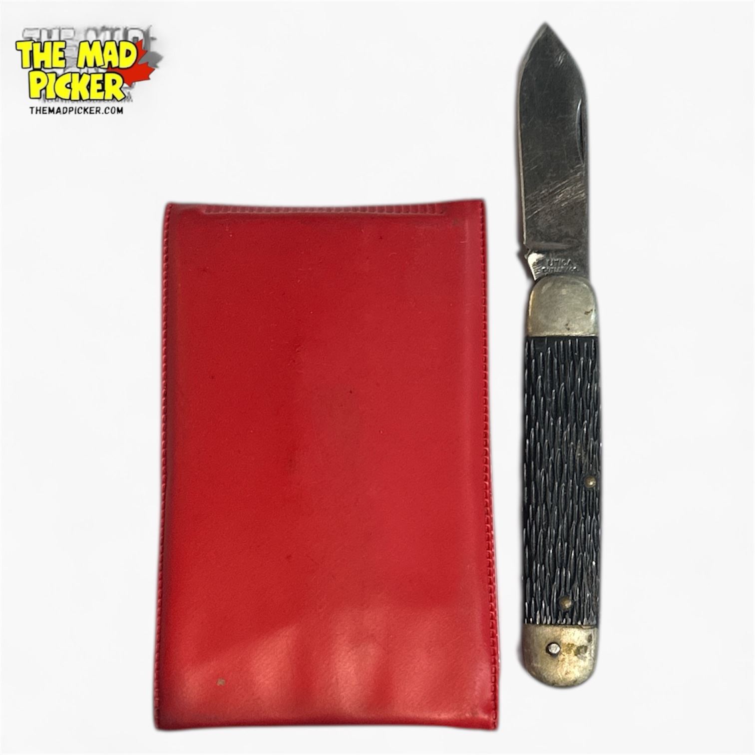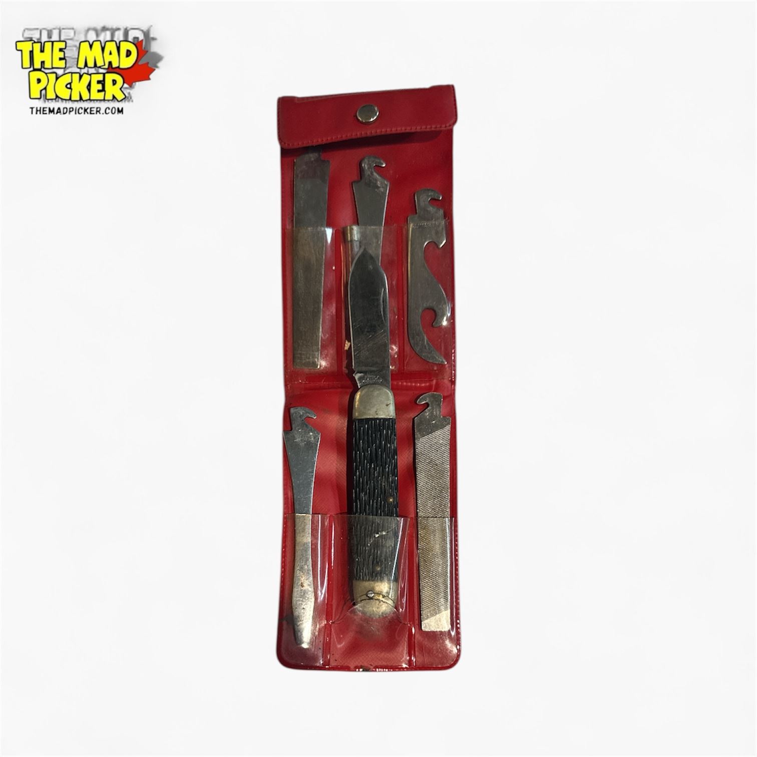 Vintage pocket knife by Utica Cutlery Company featuring a handle with storage for 5 interchangeable blades. Made in the USA, this knife combines utility with precision craftsmanship. Suitable for various tasks with its versatile blade options. Evidence of wear consistent with age and use.