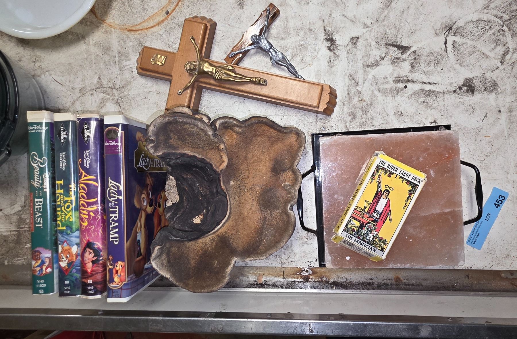Vintage VHS, mushroom, himalayan salt block, tarot cards, two crosses