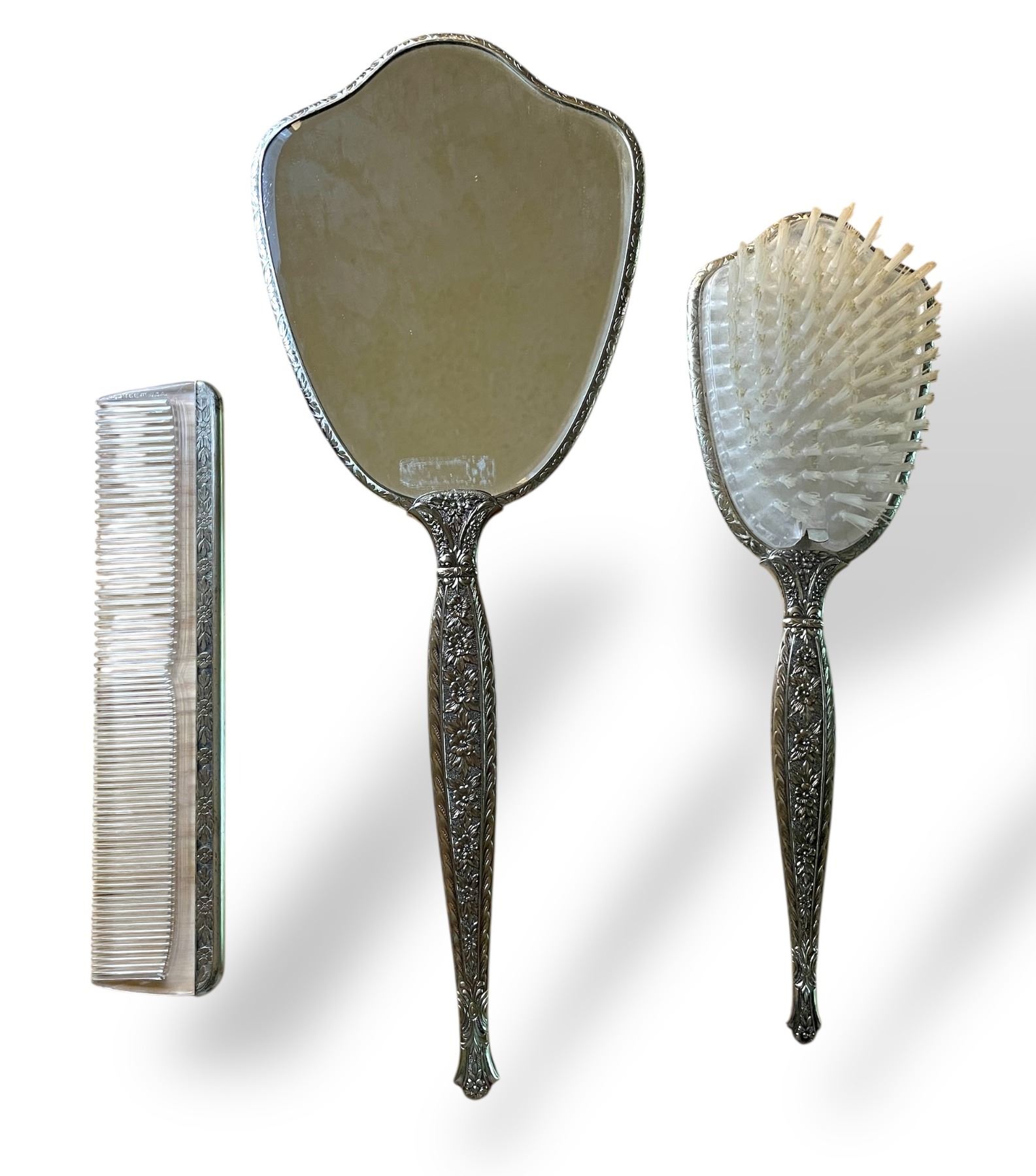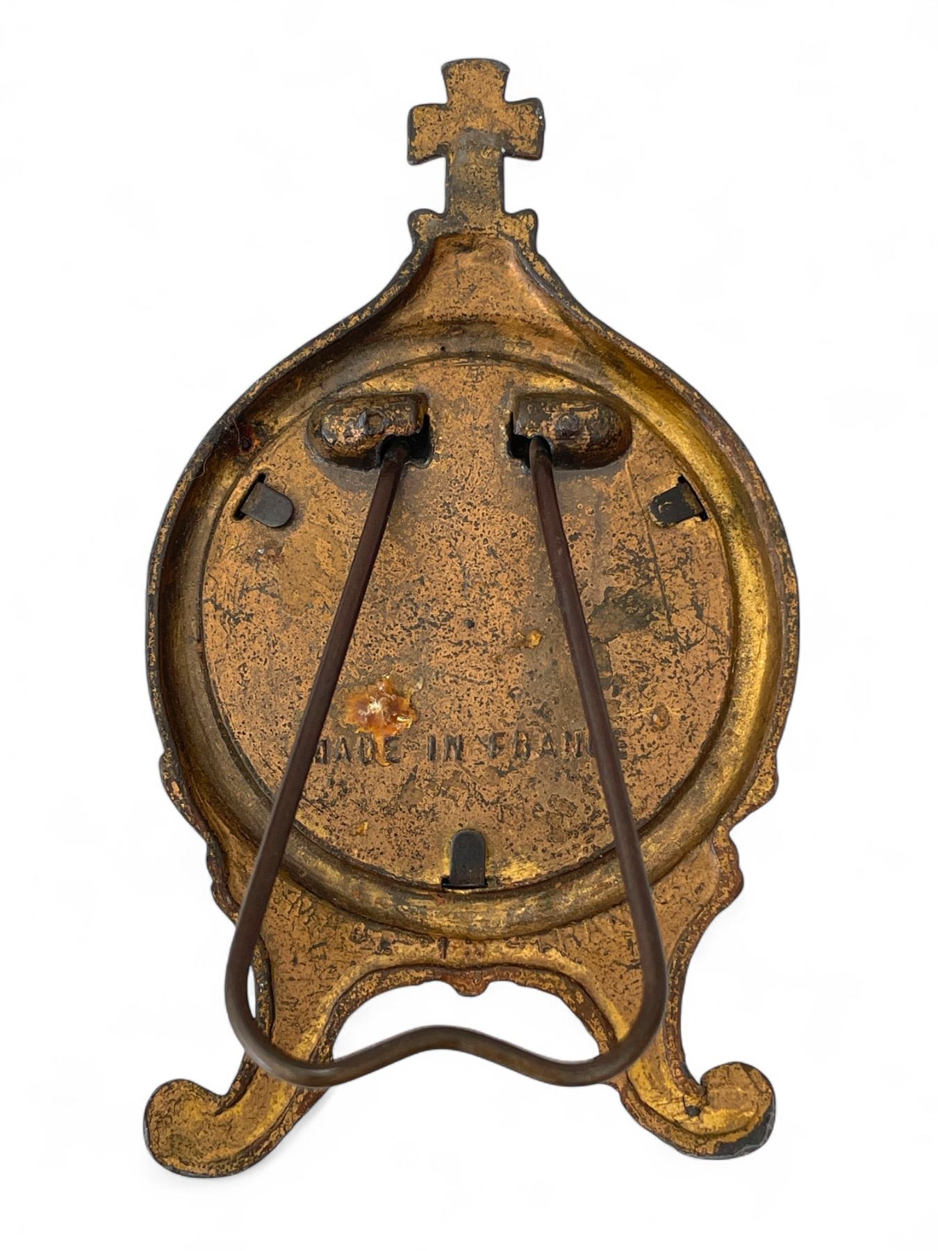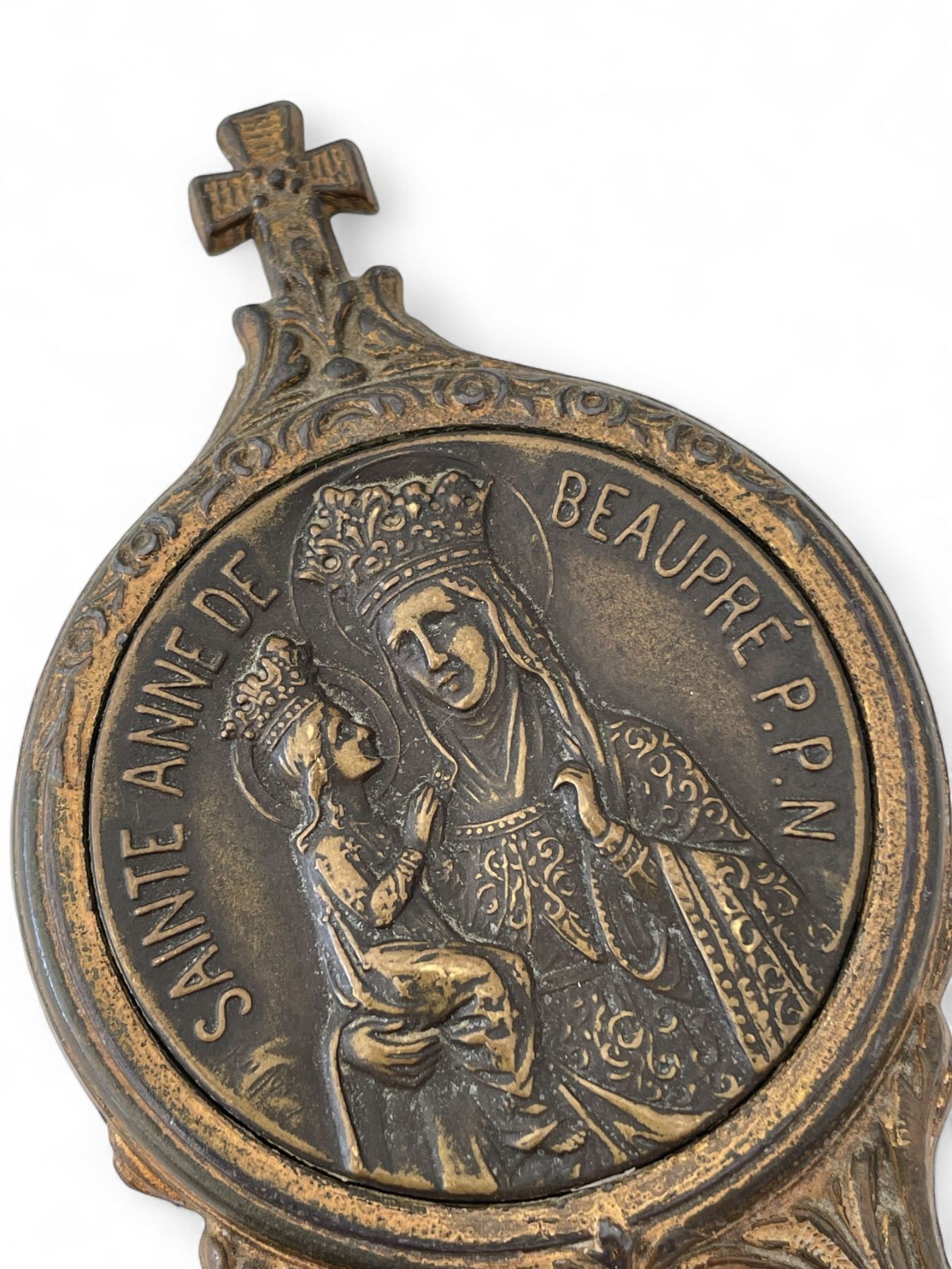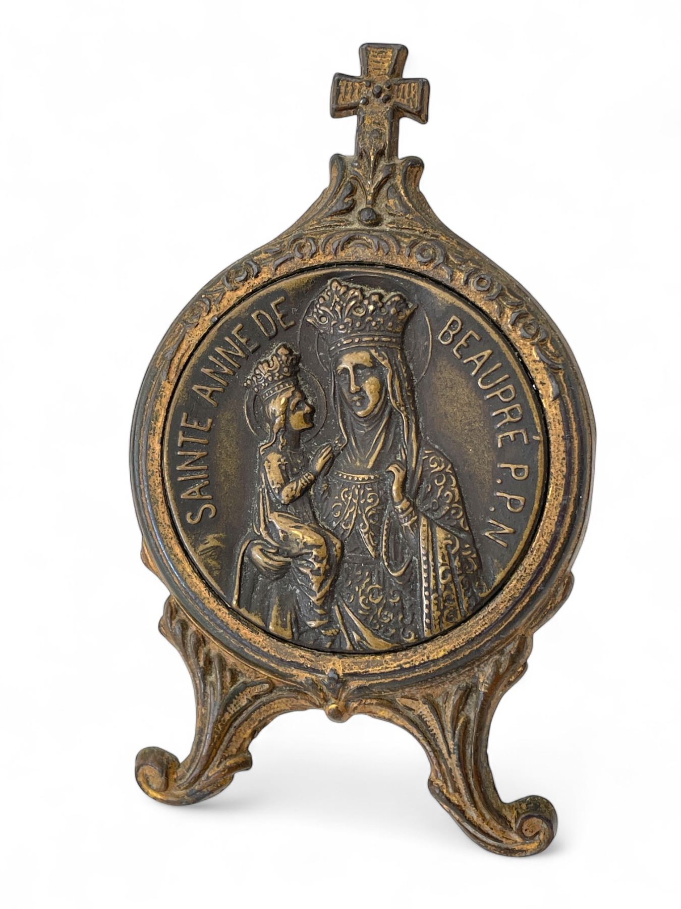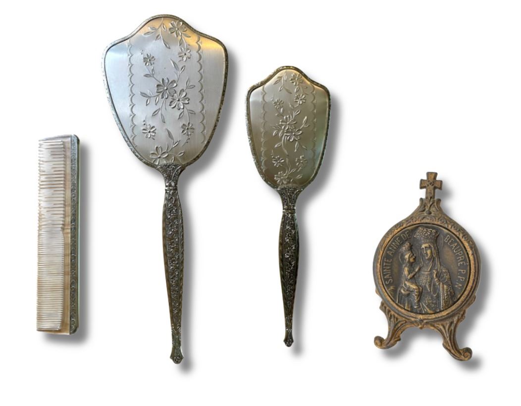 Vintage Vanity Trio and Antique Brass/Bronze Devotional Plaque: Sainte Anne de Beaupre, P.P.N. (Made in France)