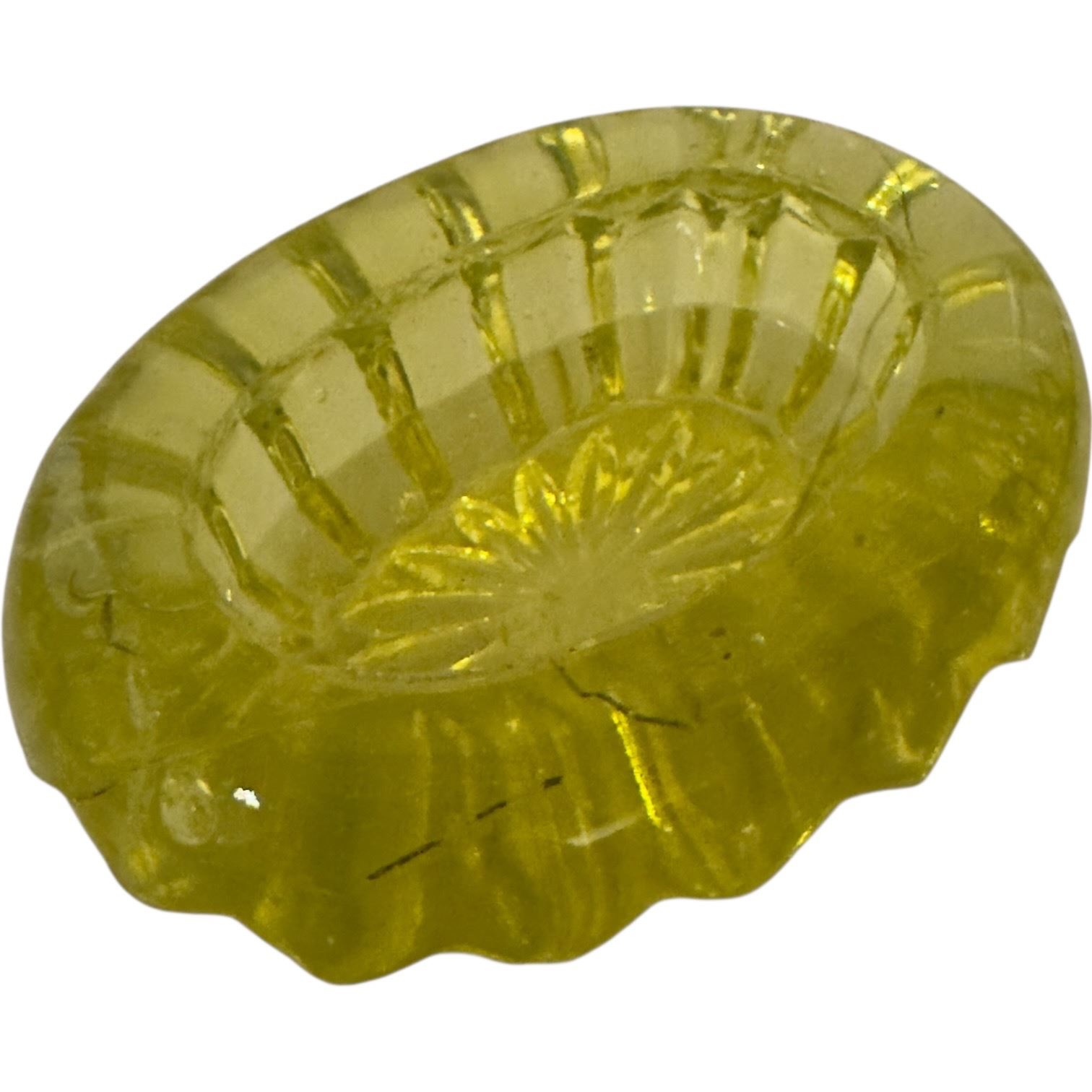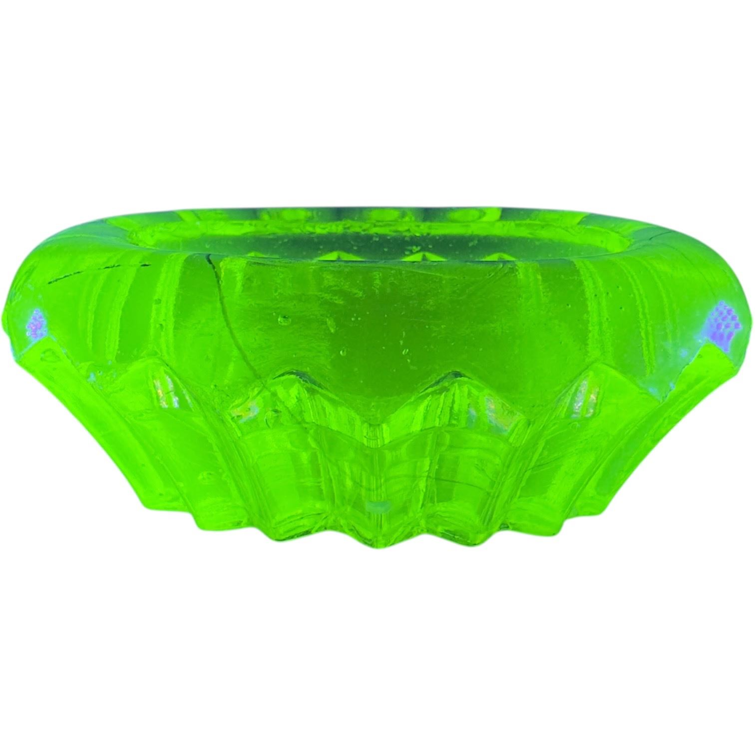 Vintage mid-20th century Vaseline uranium glass candy dish measuring 4.25-Inch long. Displays the characteristic fluorescent glow under UV light. Designed for serving or decorative purposes. Item is as pictured.