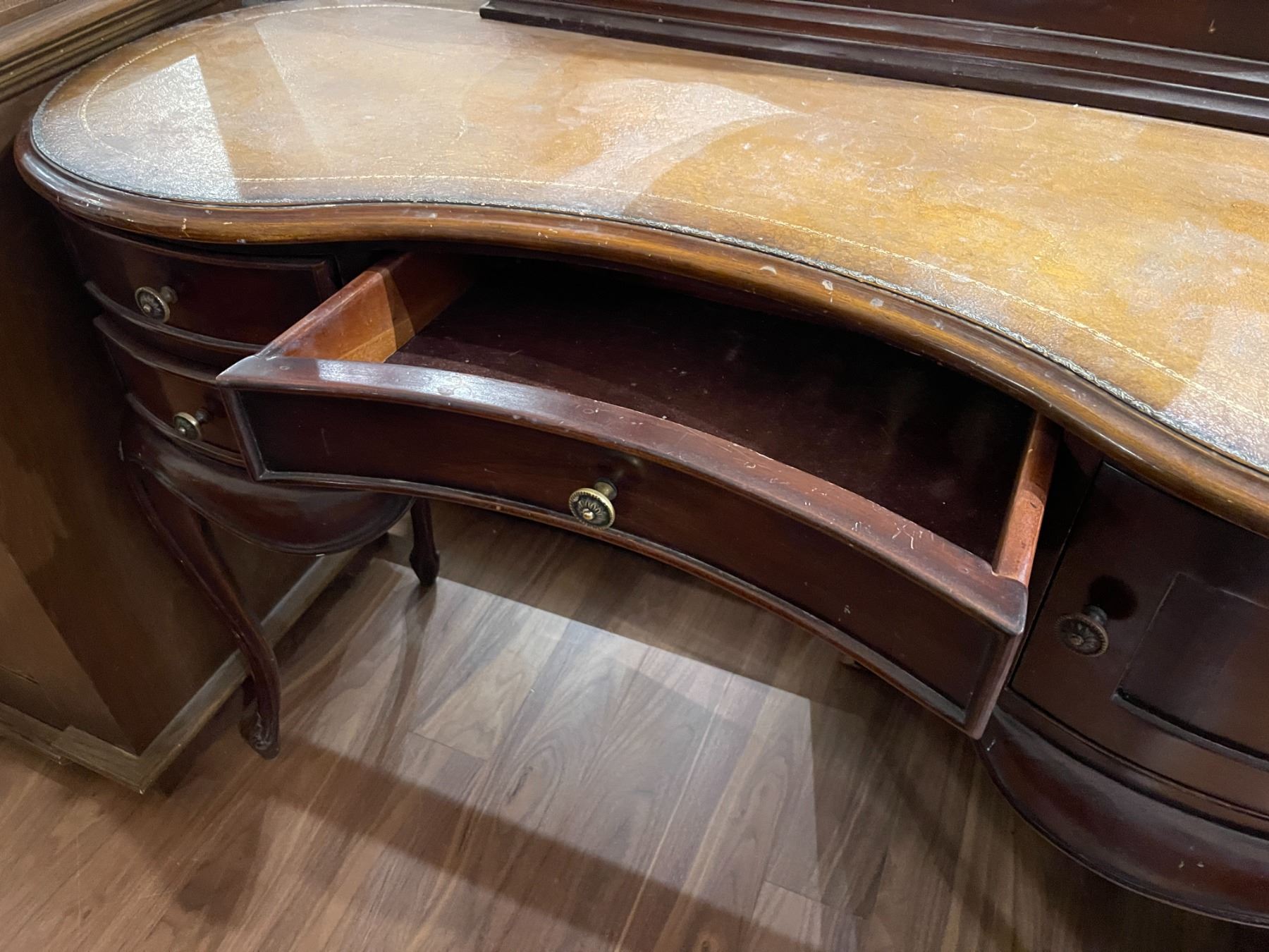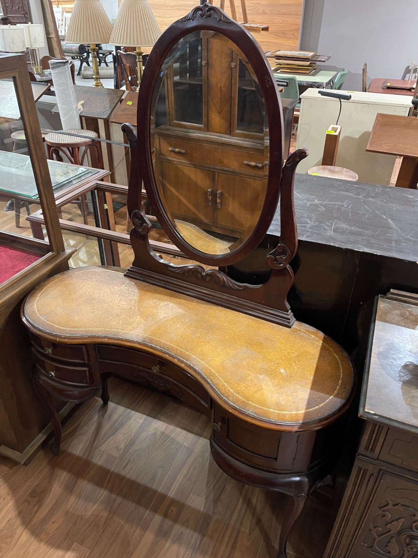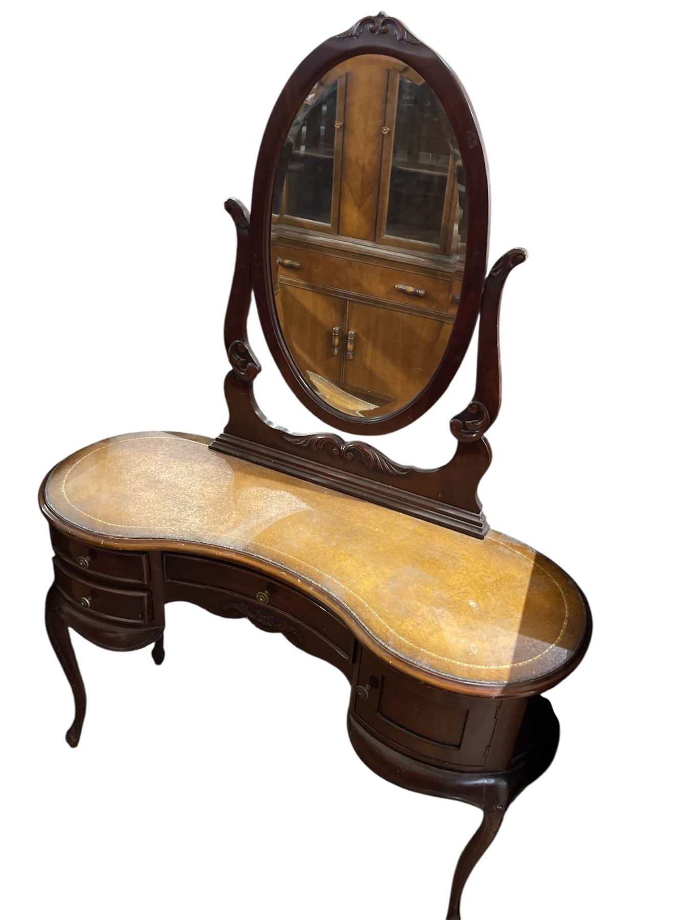 Vintage Victorian-era woman's dressing table featuring a kidney-shaped design in mahogany. Styled in Duchess fashion, this table showcases intricate craftsmanship. Dimensions are Length: 45-Inch, Width: 18-Inch, Height: 64.5-Inch. Item is as pictured.