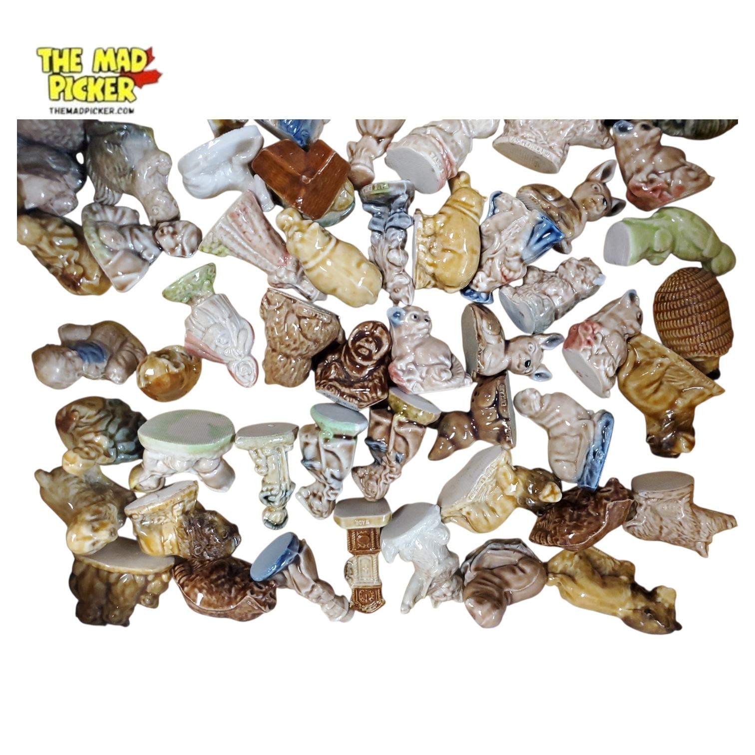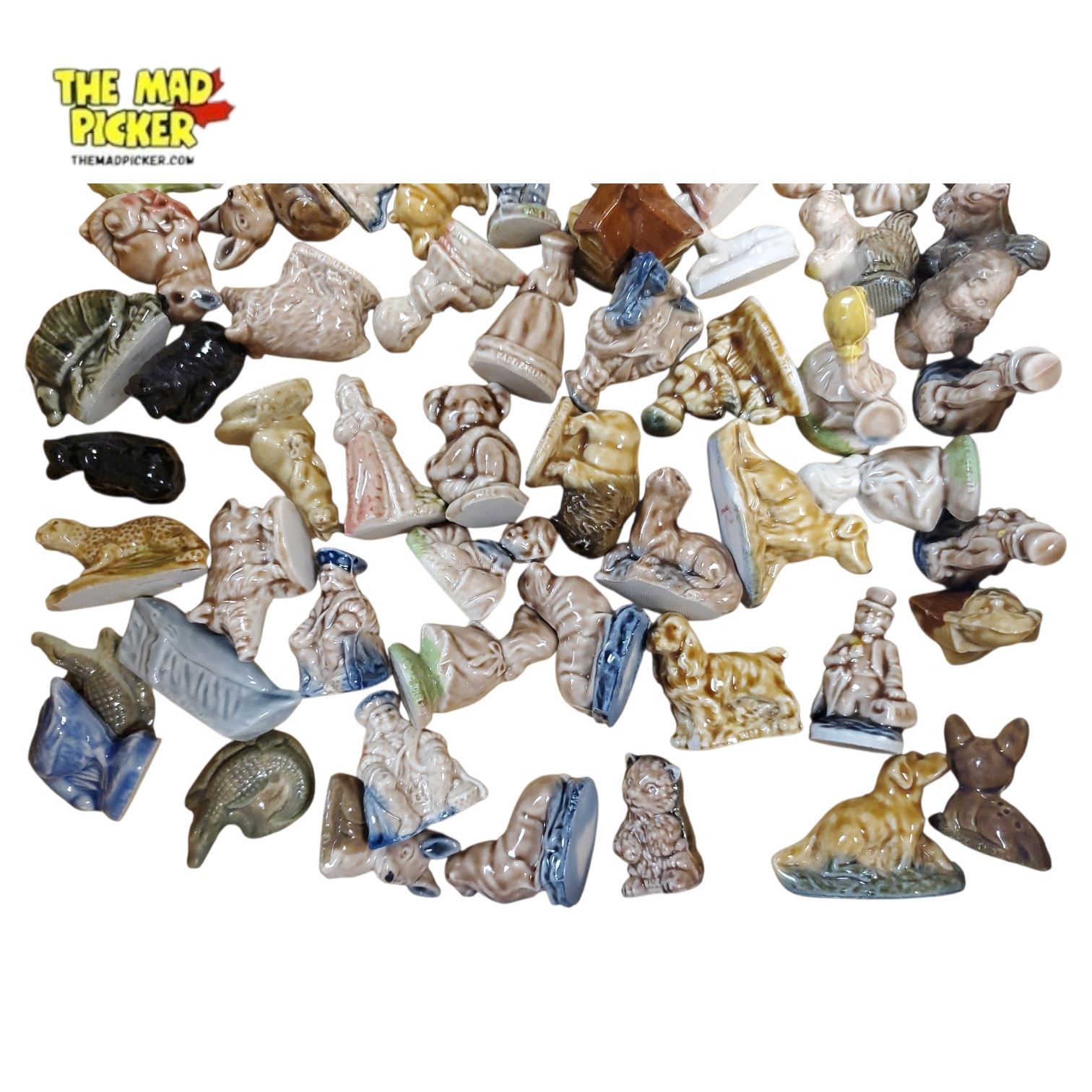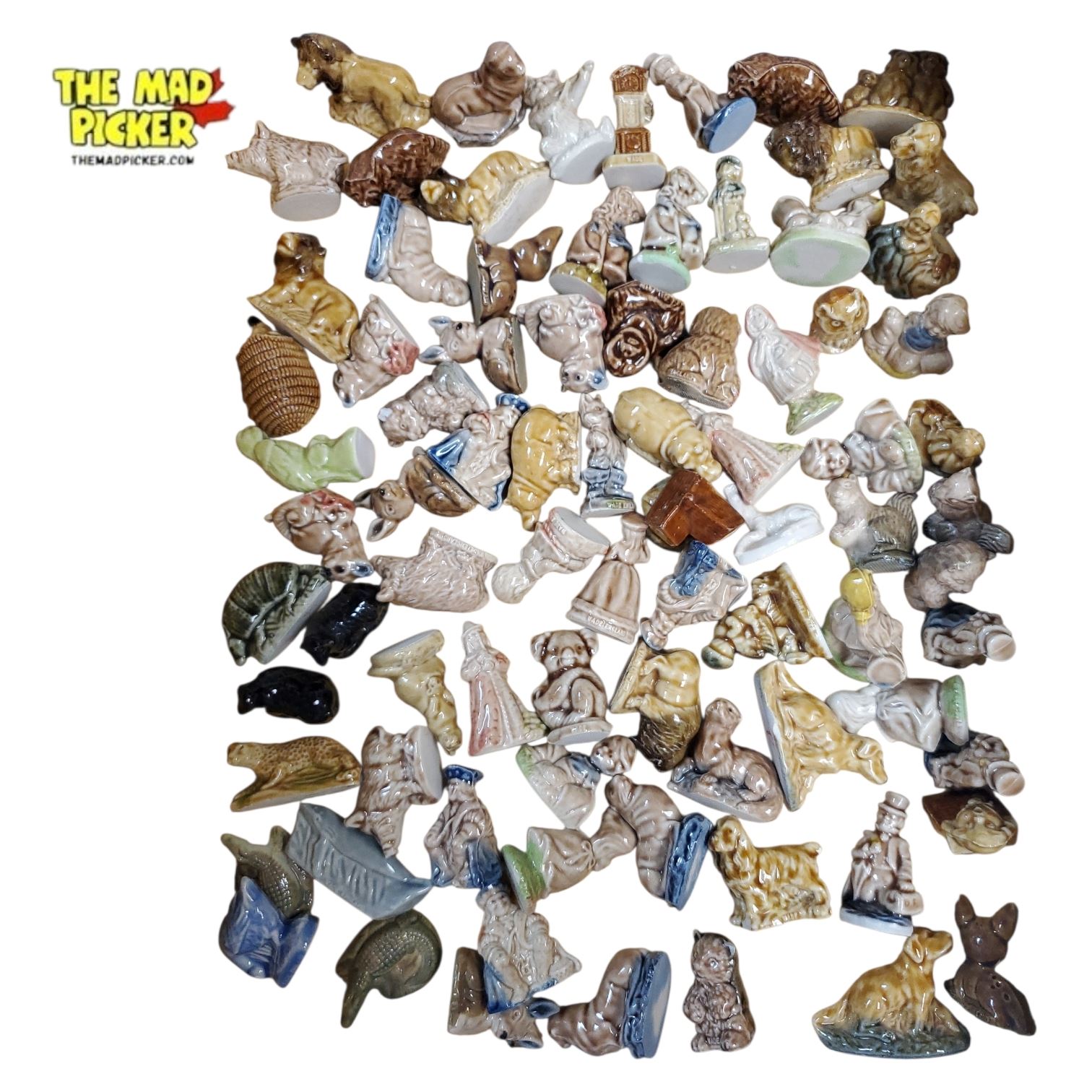 Collection of vintage Wade Whimsies porcelain miniatures manufactured by George Wade & Son Ltd. Produced from 1953 onward, these figurines depict animals, fairy tale, and nursery rhyme characters. Distributed as Red Rose Tea premiums, over 300 million made to date. Condition: fair.