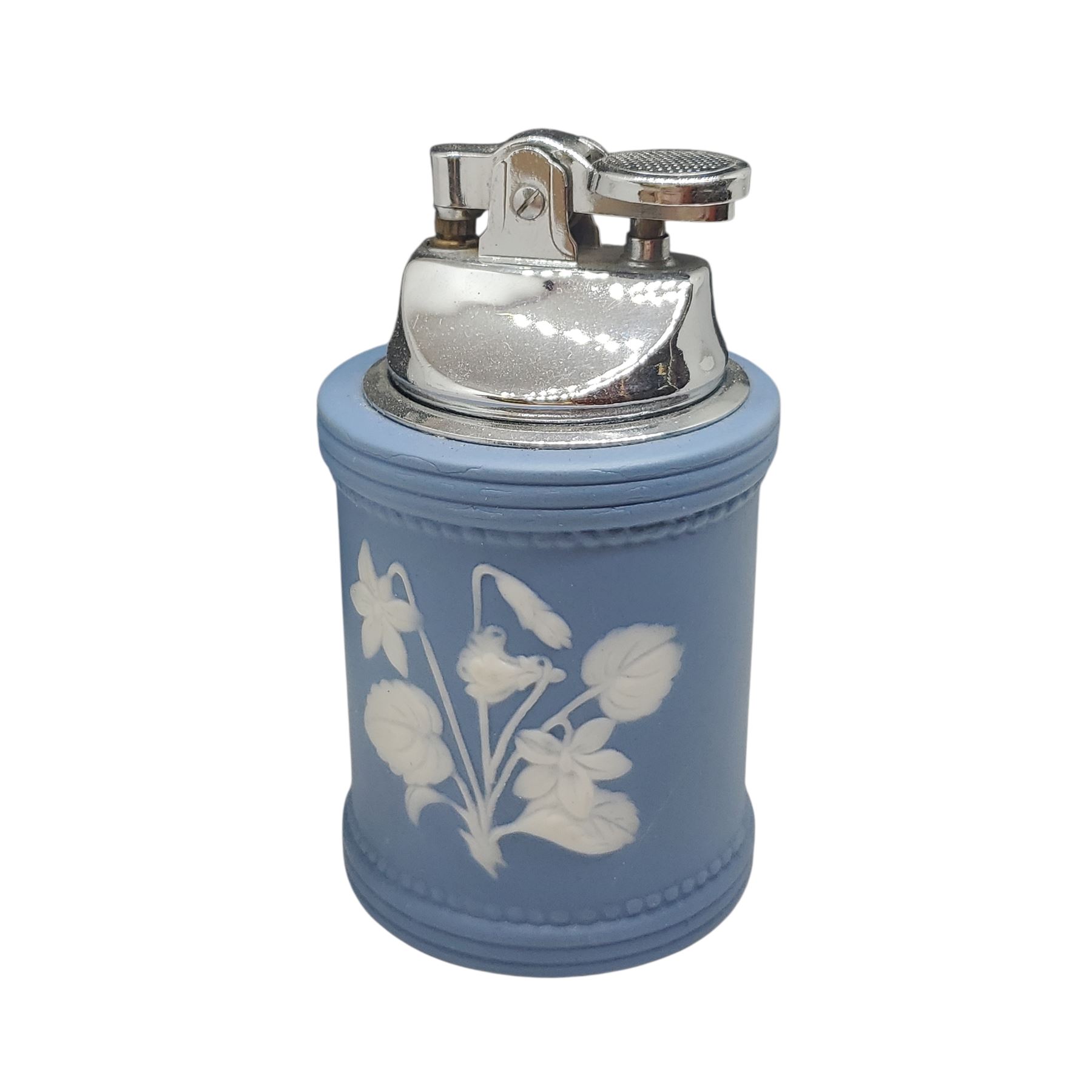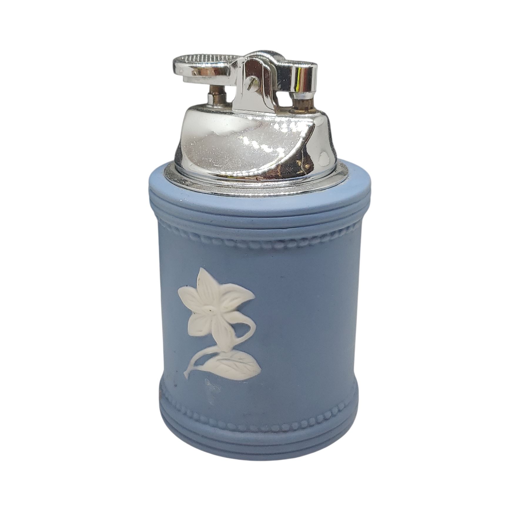 Vintage table lighter in the style of Wedgwood Blue Jasperware with a silver-tone metal base. Features classical white relief decorations on a matte blue ceramic body. Likely mid-20th century design. Functional as a lighter and collectible as a decorative piece.