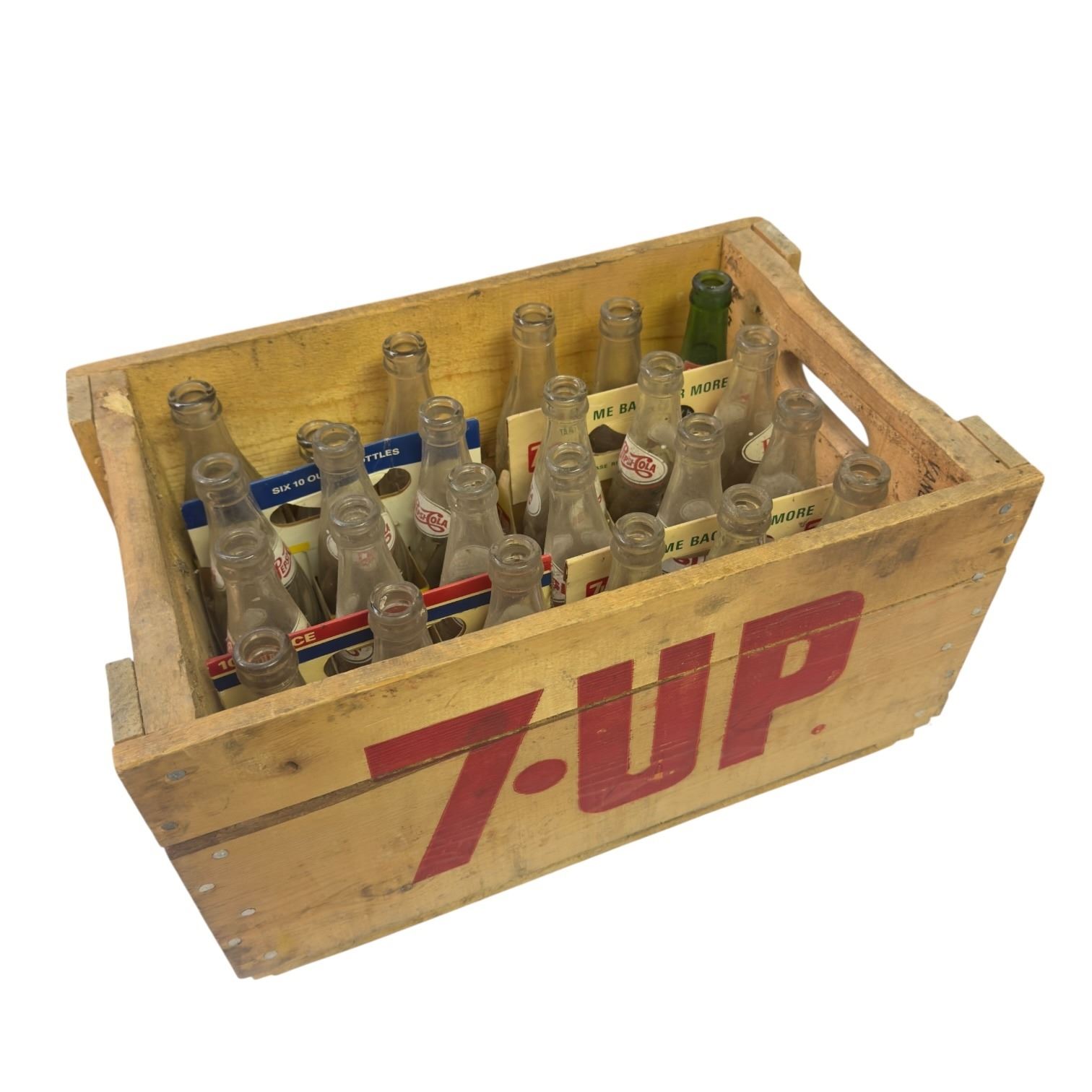 Vintage Wood 7-Up Crate with 24 Glass Pop Bottles (1x 7-Up & 4x Coca-Cola, 1x Crush)