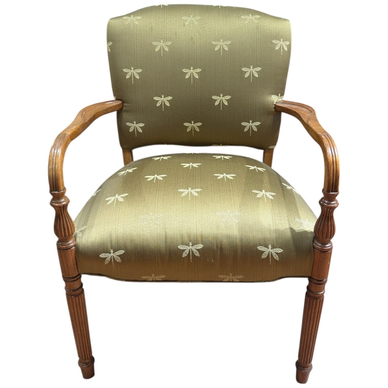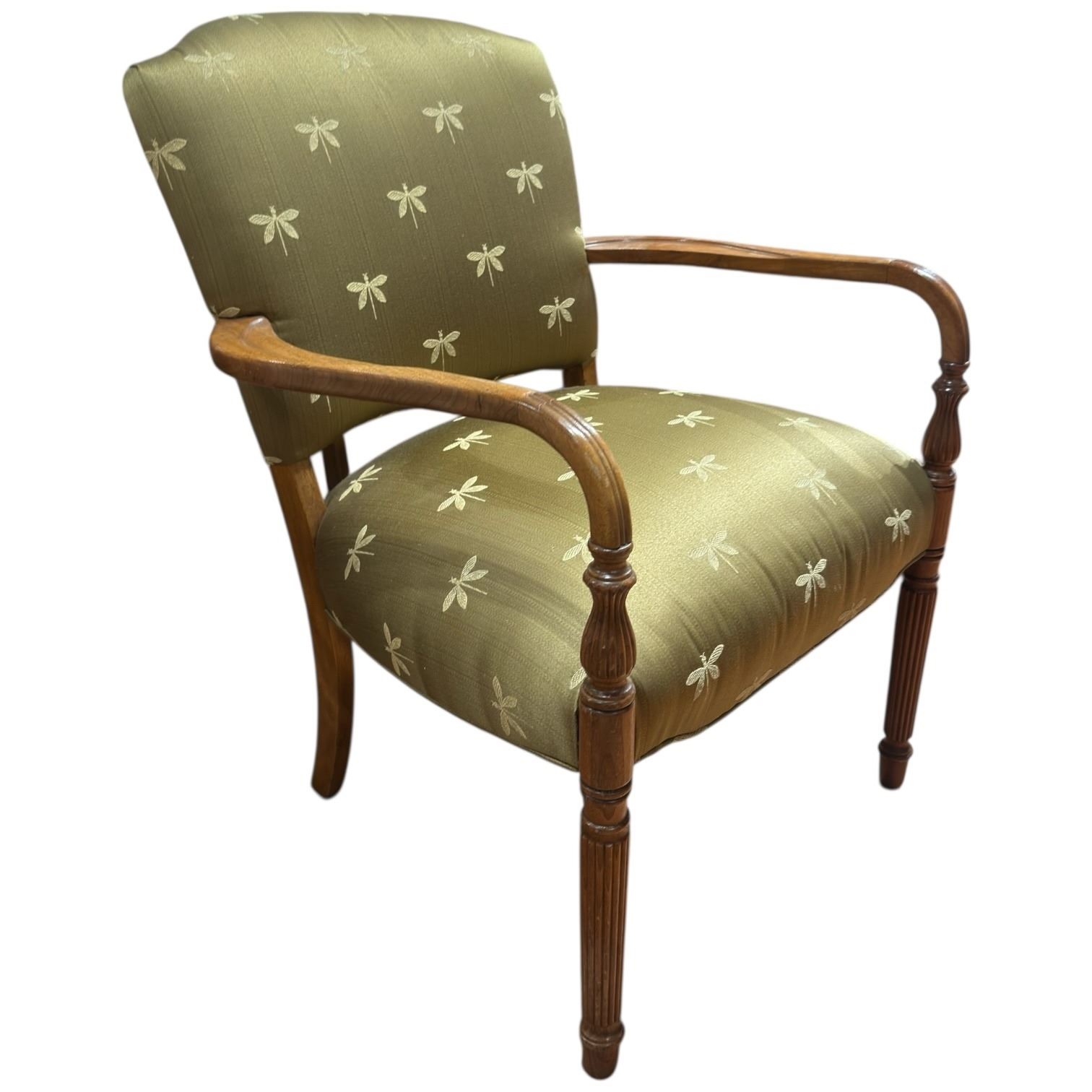 Vintage Wood Armchair with Green Satin-like Dragonfly Upholstery