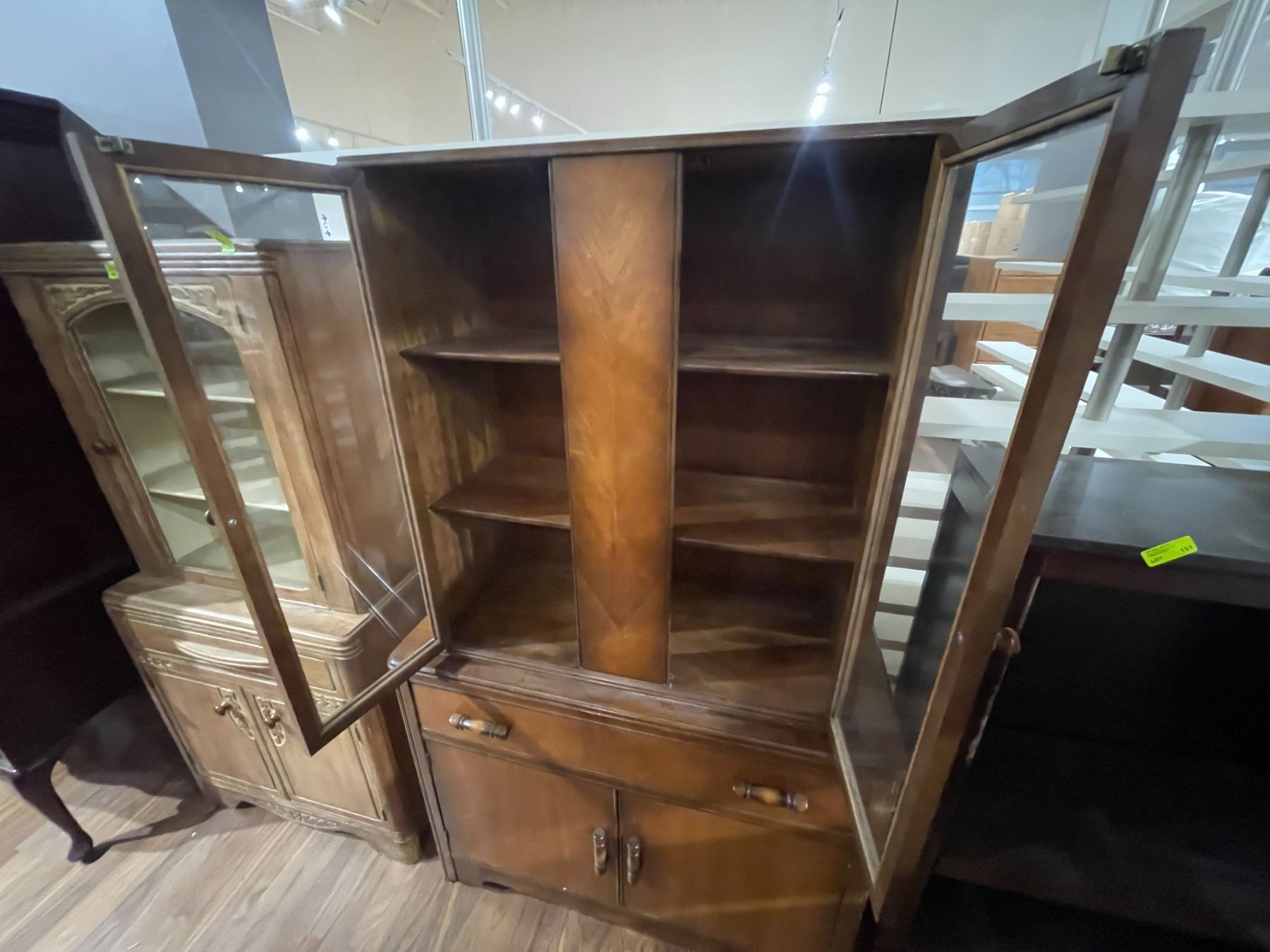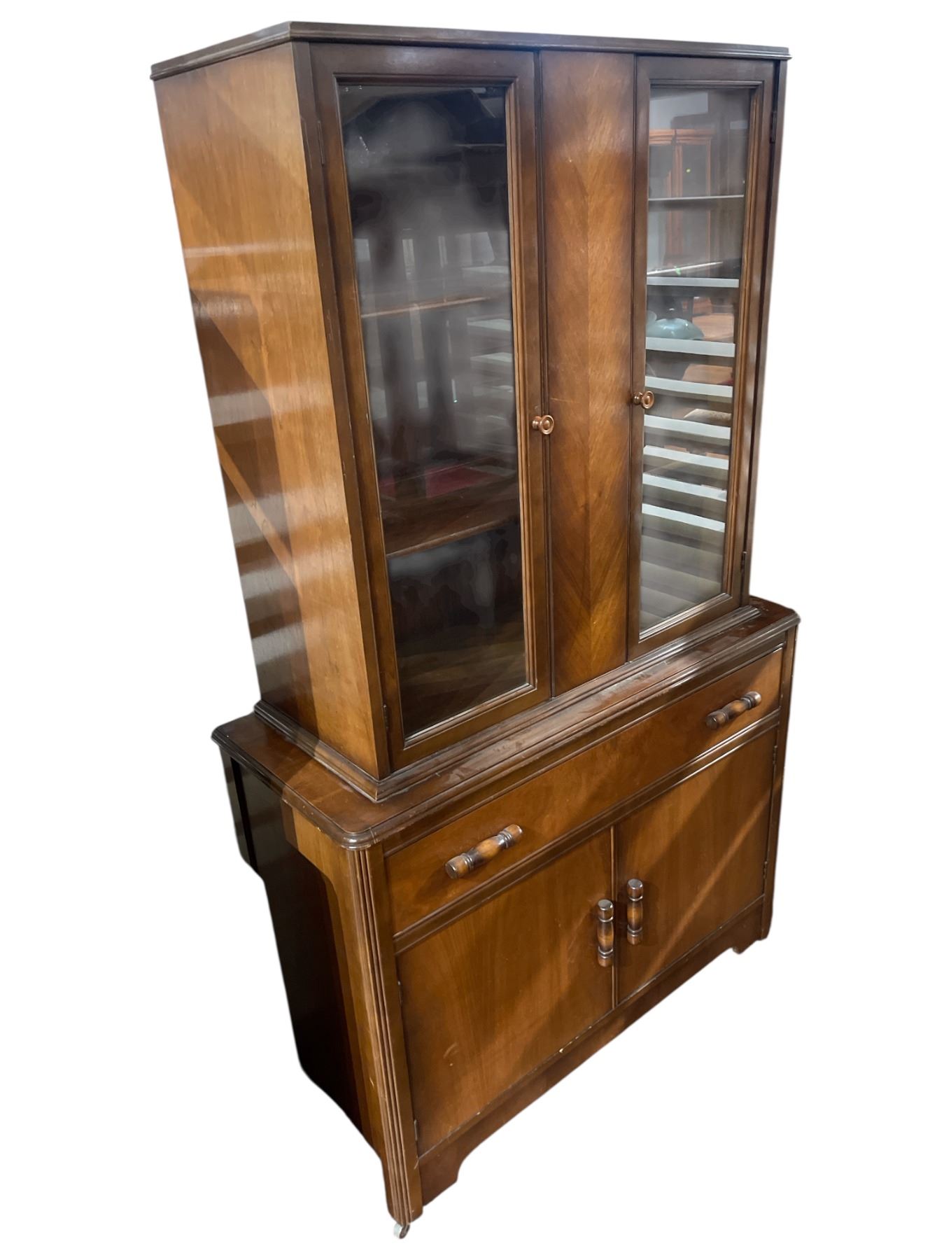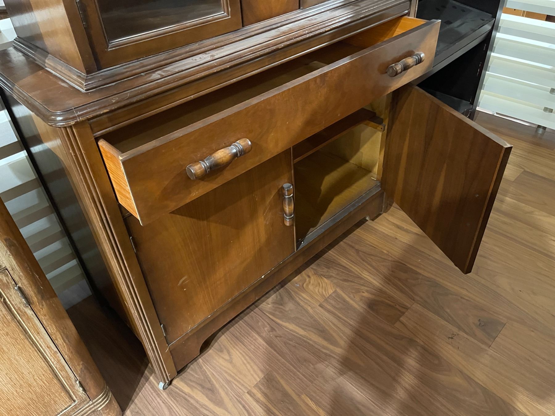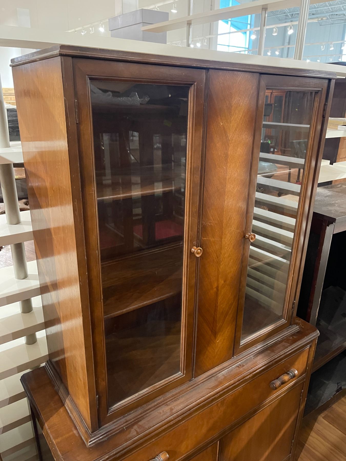 Vintage china hutch with dimensions of 40-Inch length, 16-Inch width, and 67.5-Inch height. Features multiple shelves and storage compartments suitable for displaying or storing dinnerware. Item is as pictured.