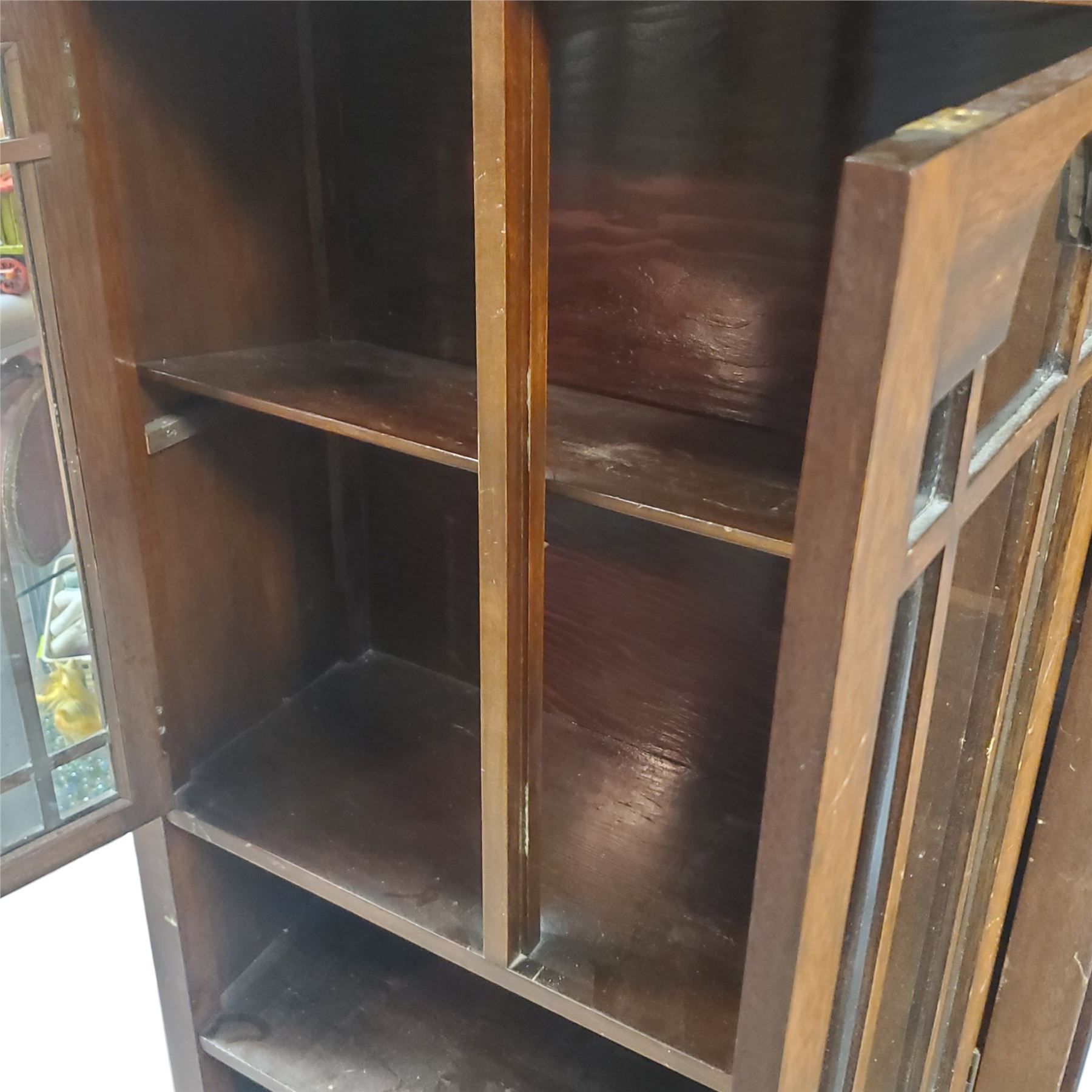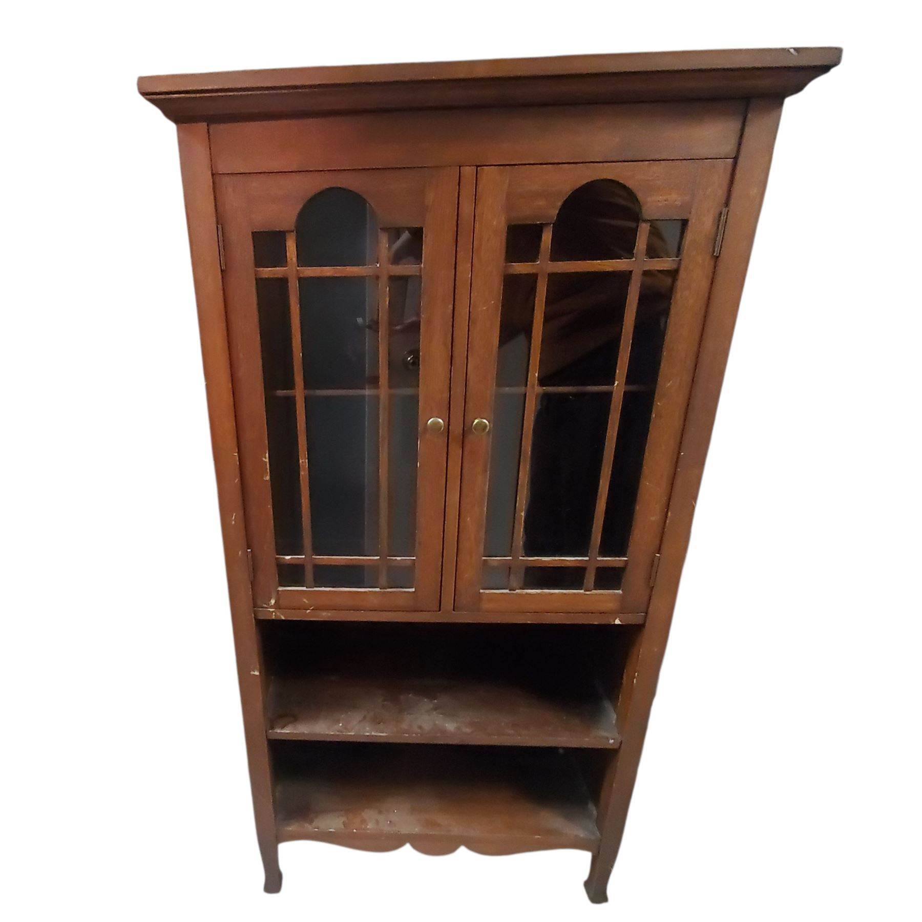 Vintage wood curio cabinet with glassed doors designed in a farmhouse esthetic. Features shelving for display or storage with dimensions of 29x11.5x53.5-Inch. Item is as pictured.