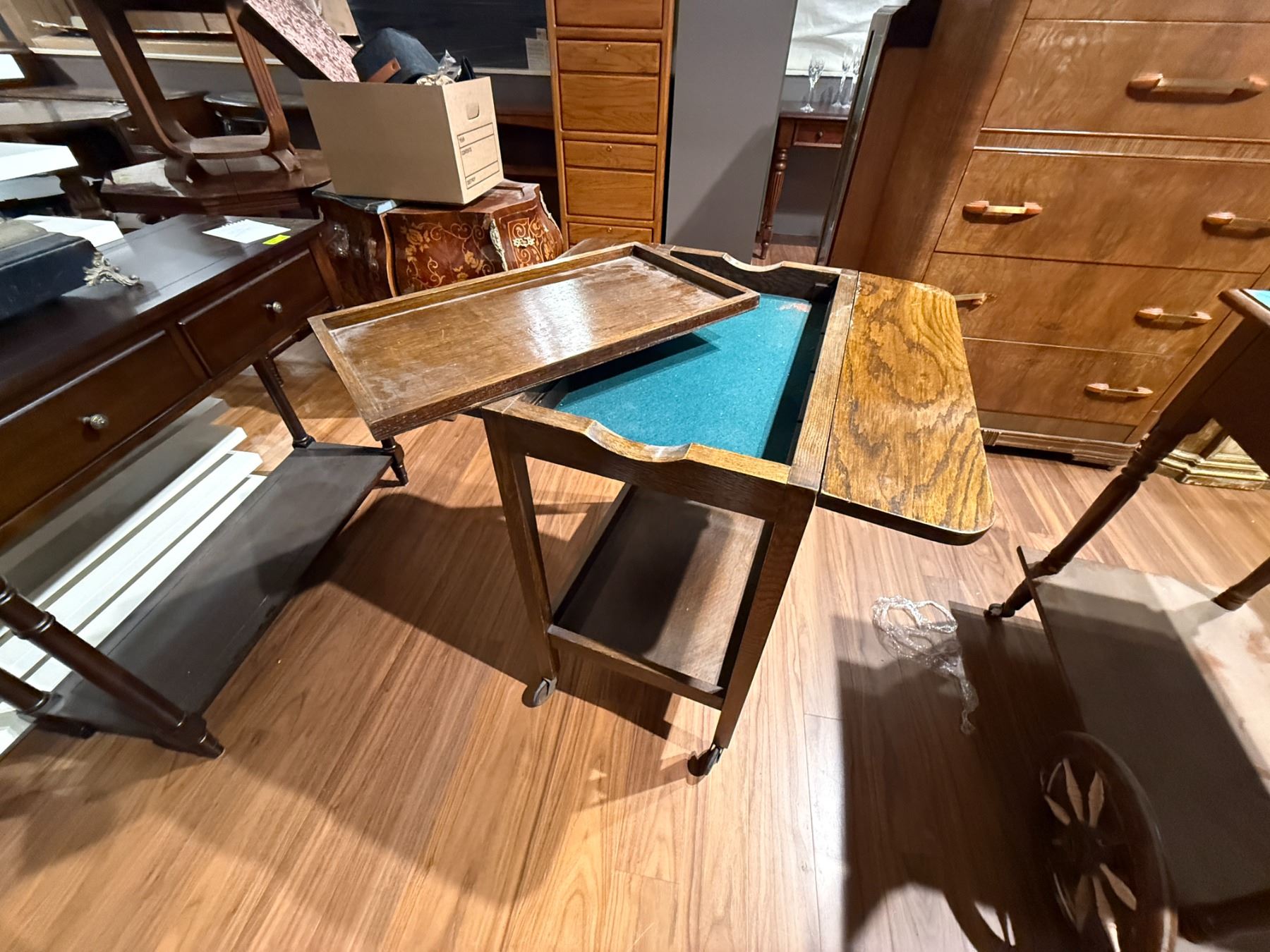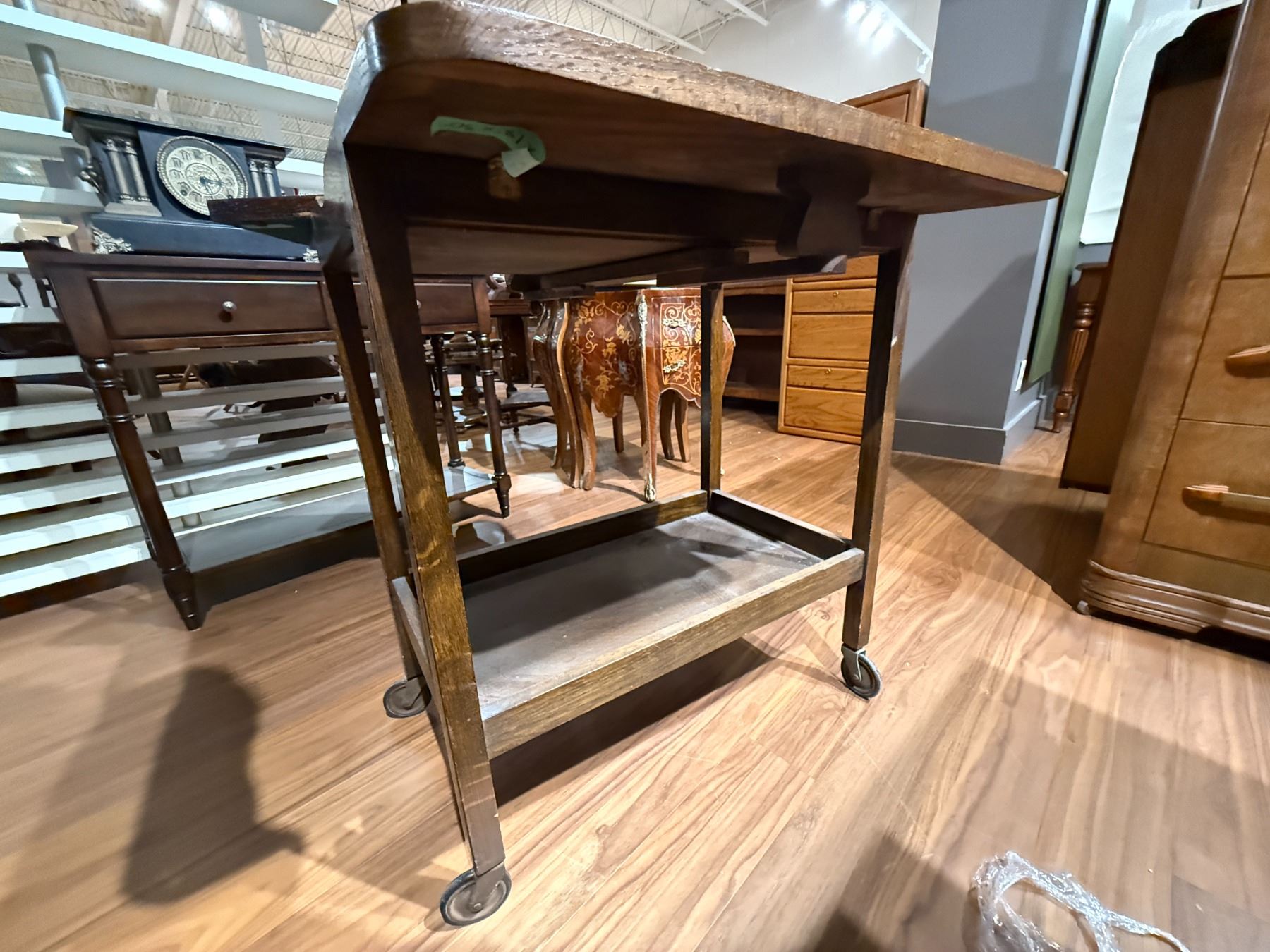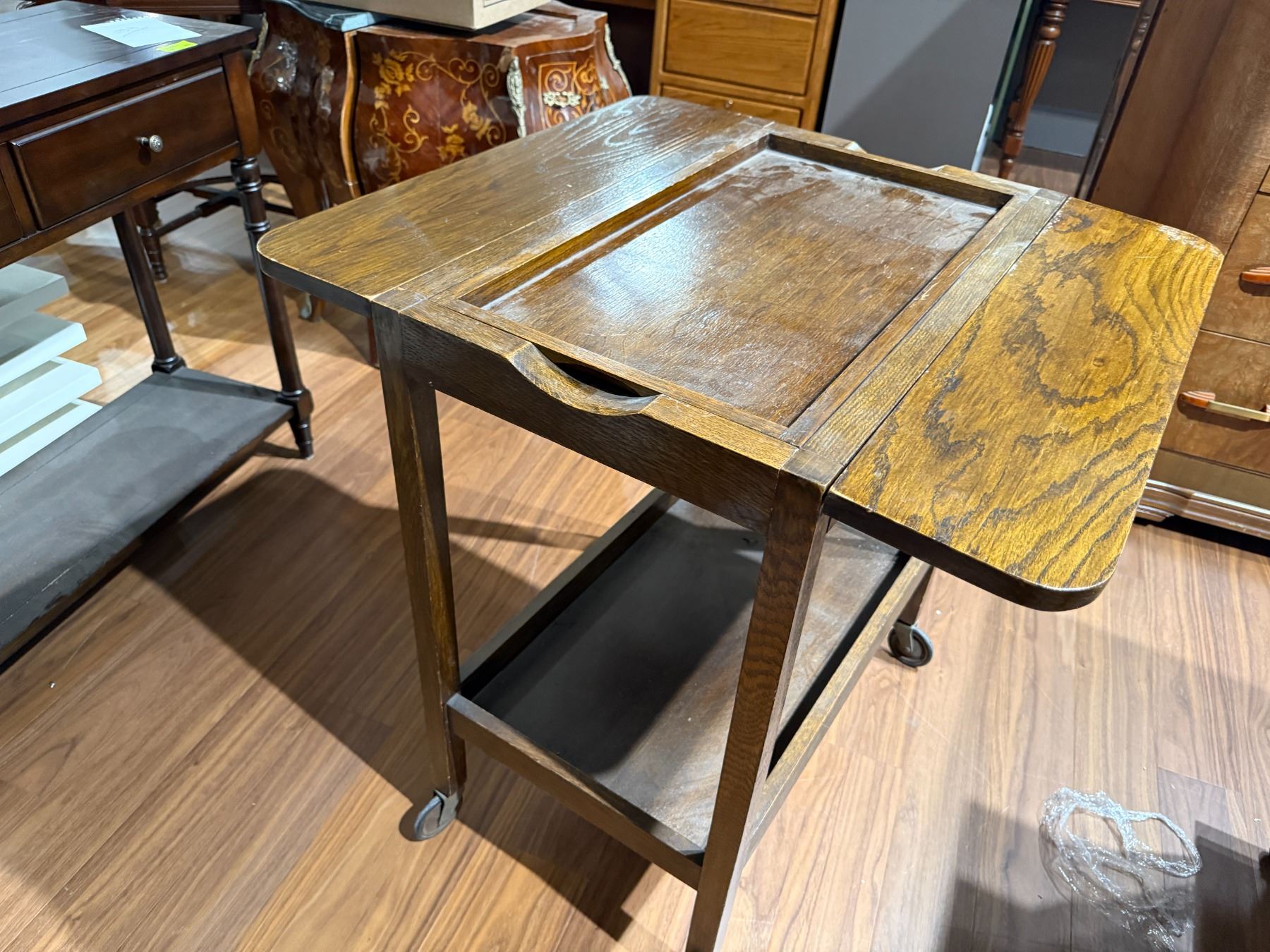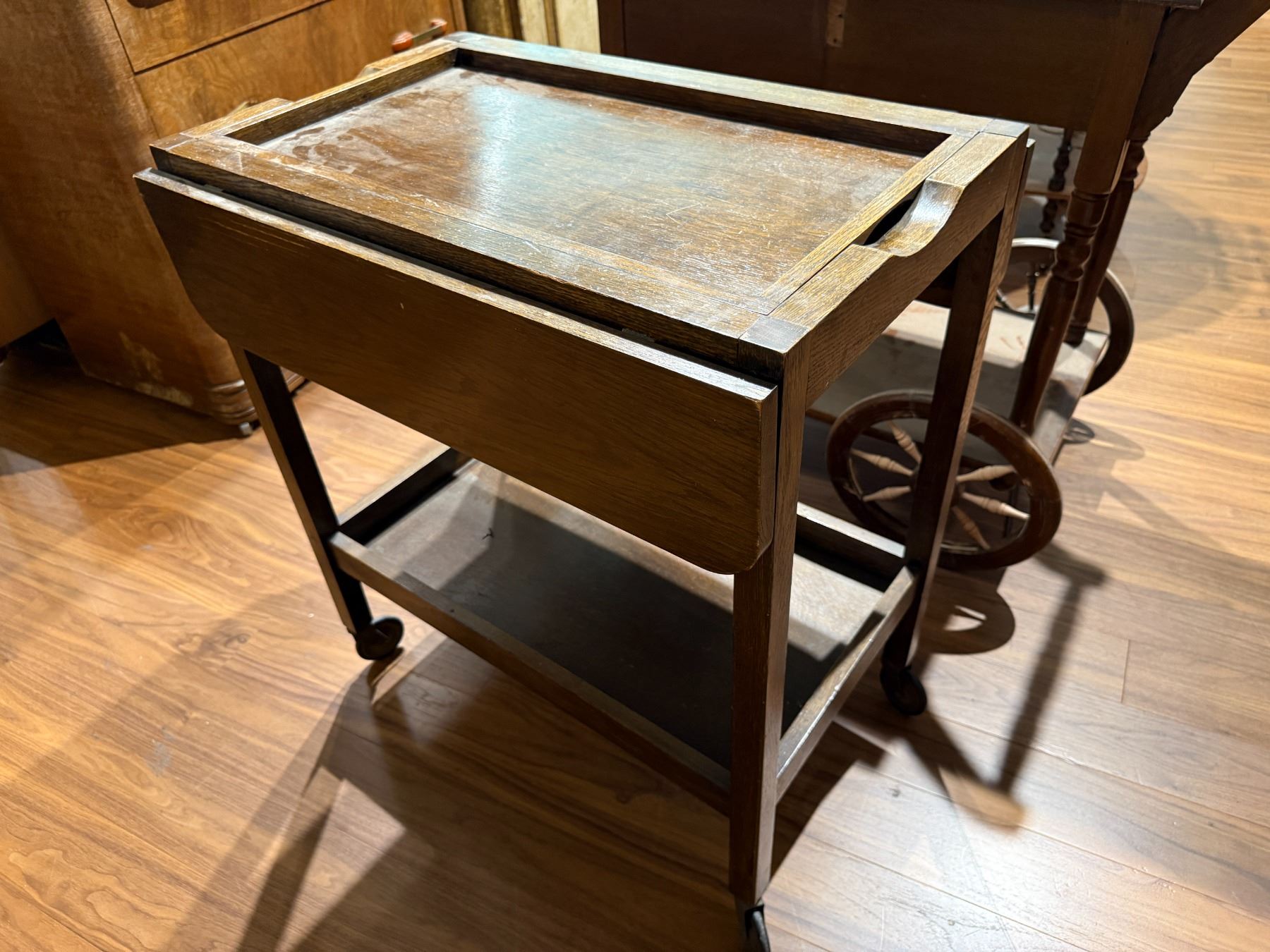 Vintage wood tea trolley in drop leaf style with removable tray. Features functional drop leaf sides and four legs for mobility. Dimensions: Length 26.25-Inch, Width 17.25-Inch, Height 30-Inch. Item is as pictured.