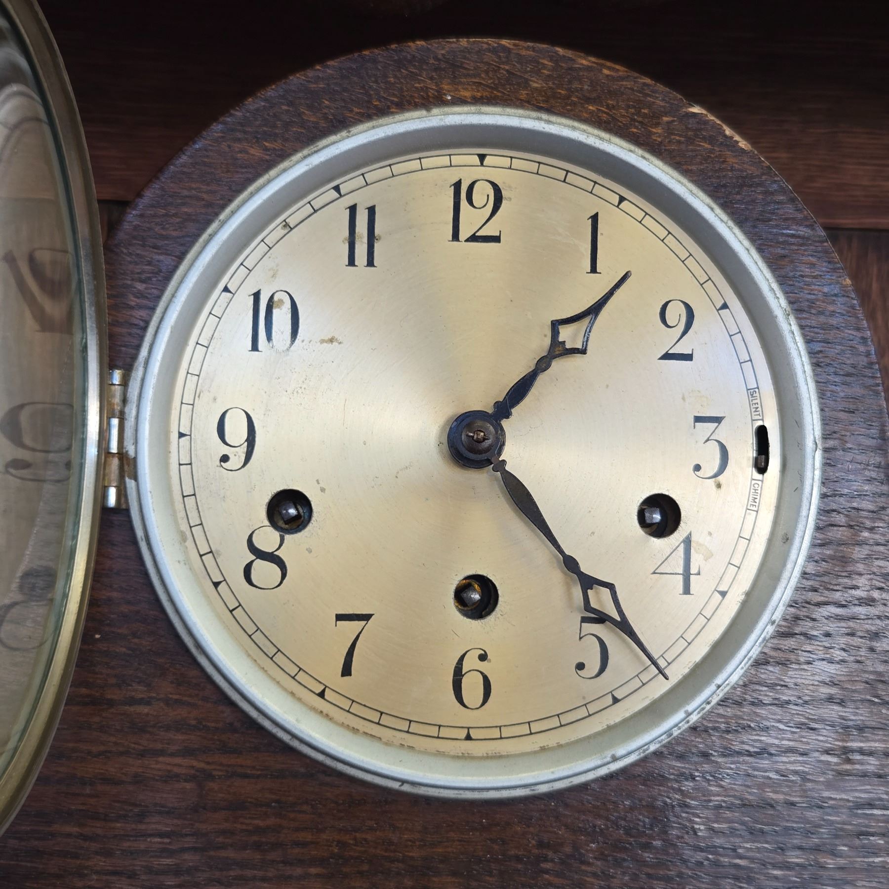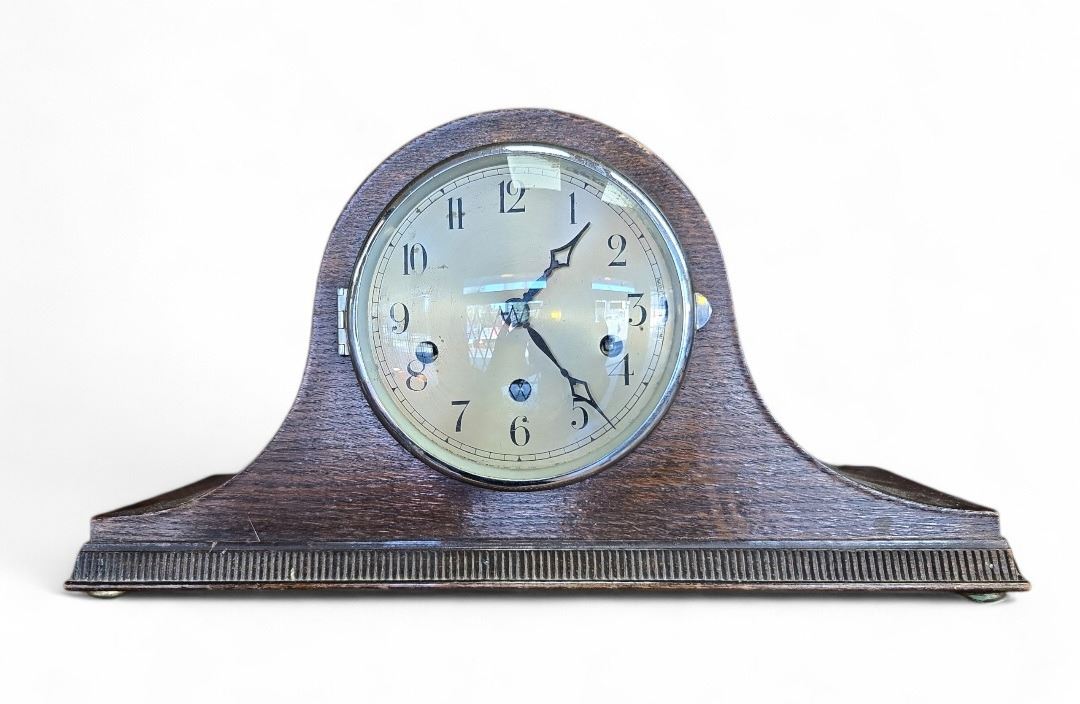 Vintage wood Napoleon hat style mantle clock measuring 16.5x6x9-Inch. Crafted in a traditional design, the clock features a curved case resembling the silhouette of Napoleon's hat. Item is as pictured.