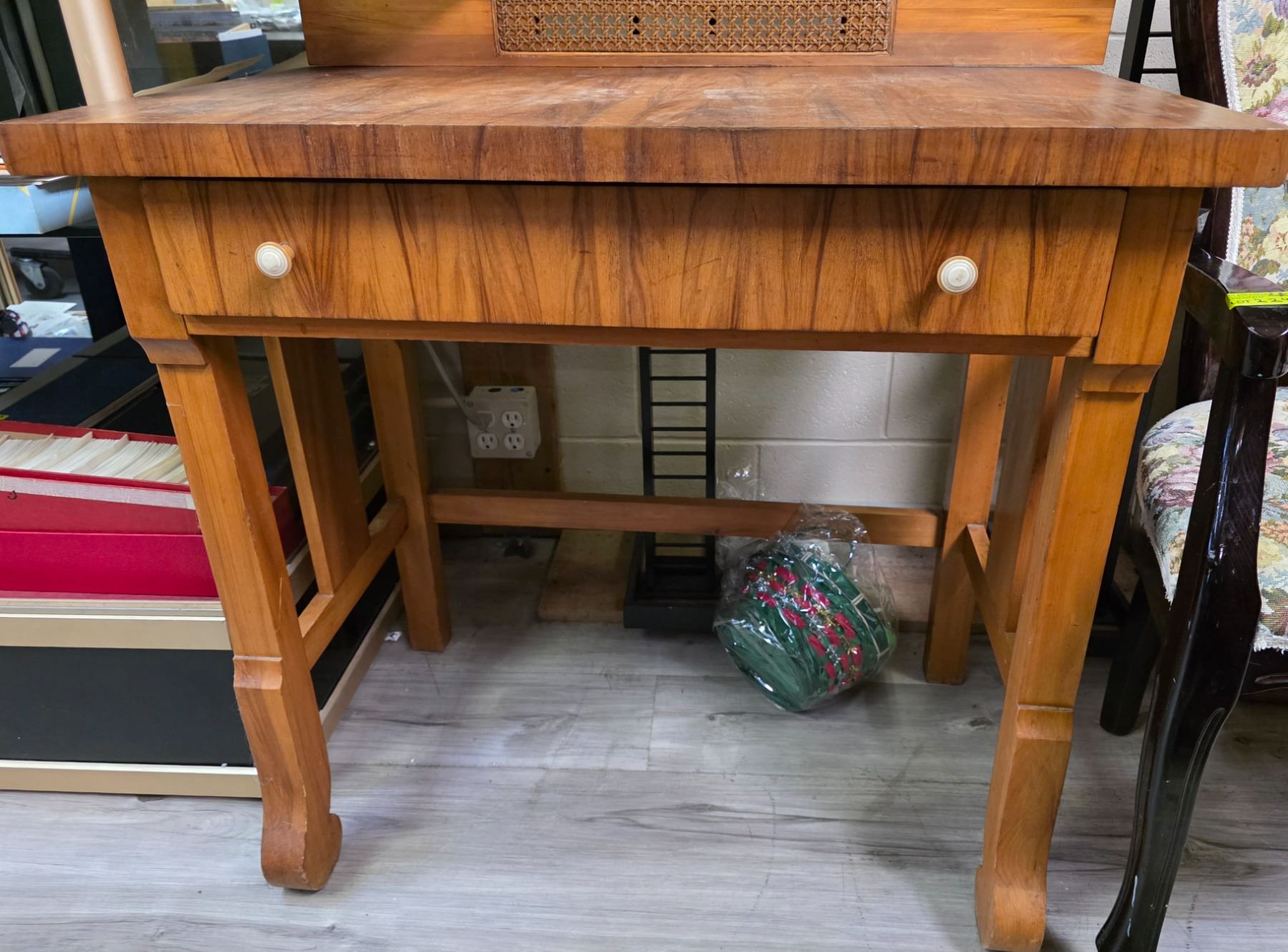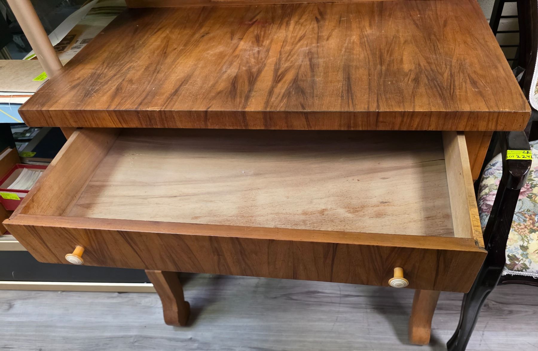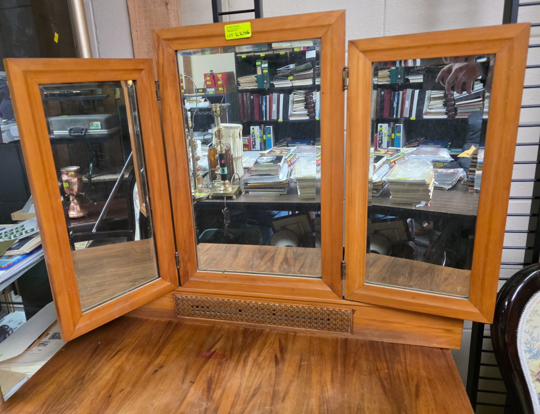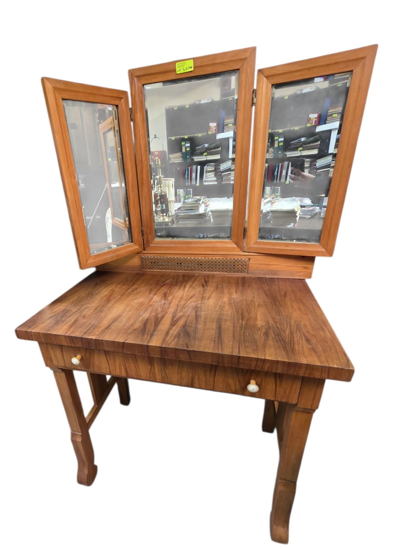 Vintage Wood Vanity Table with Trifold Mirror and Bakelite Handles * Surface of the table is 33" wide x 19" deep