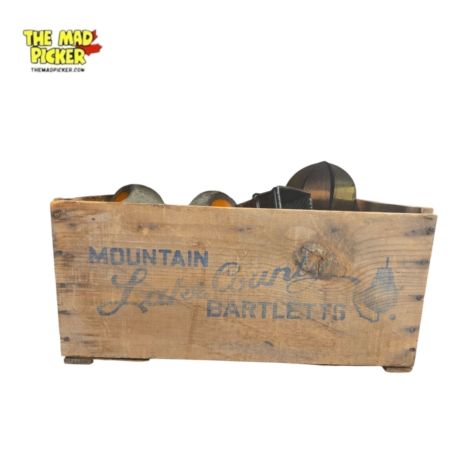 Wooden crate originally used for Bartlet Pears, dating to the mid-20th century. Constructed from aged wood with stenciled labeling indicative of produce transportation. Includes an assortment of vintage collectibles stored within. Measures approximately 12-18 inches in length, based on typical crate size.