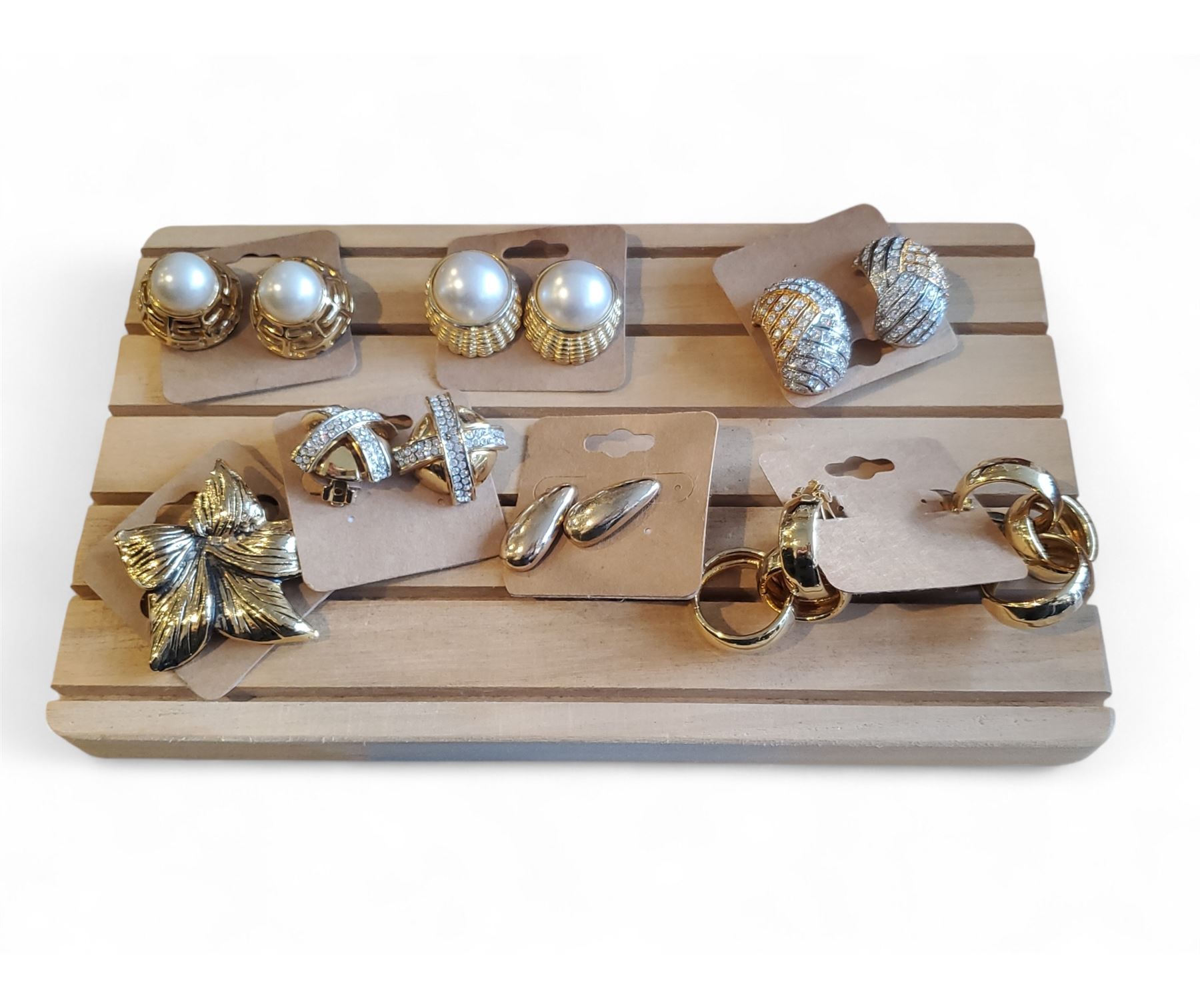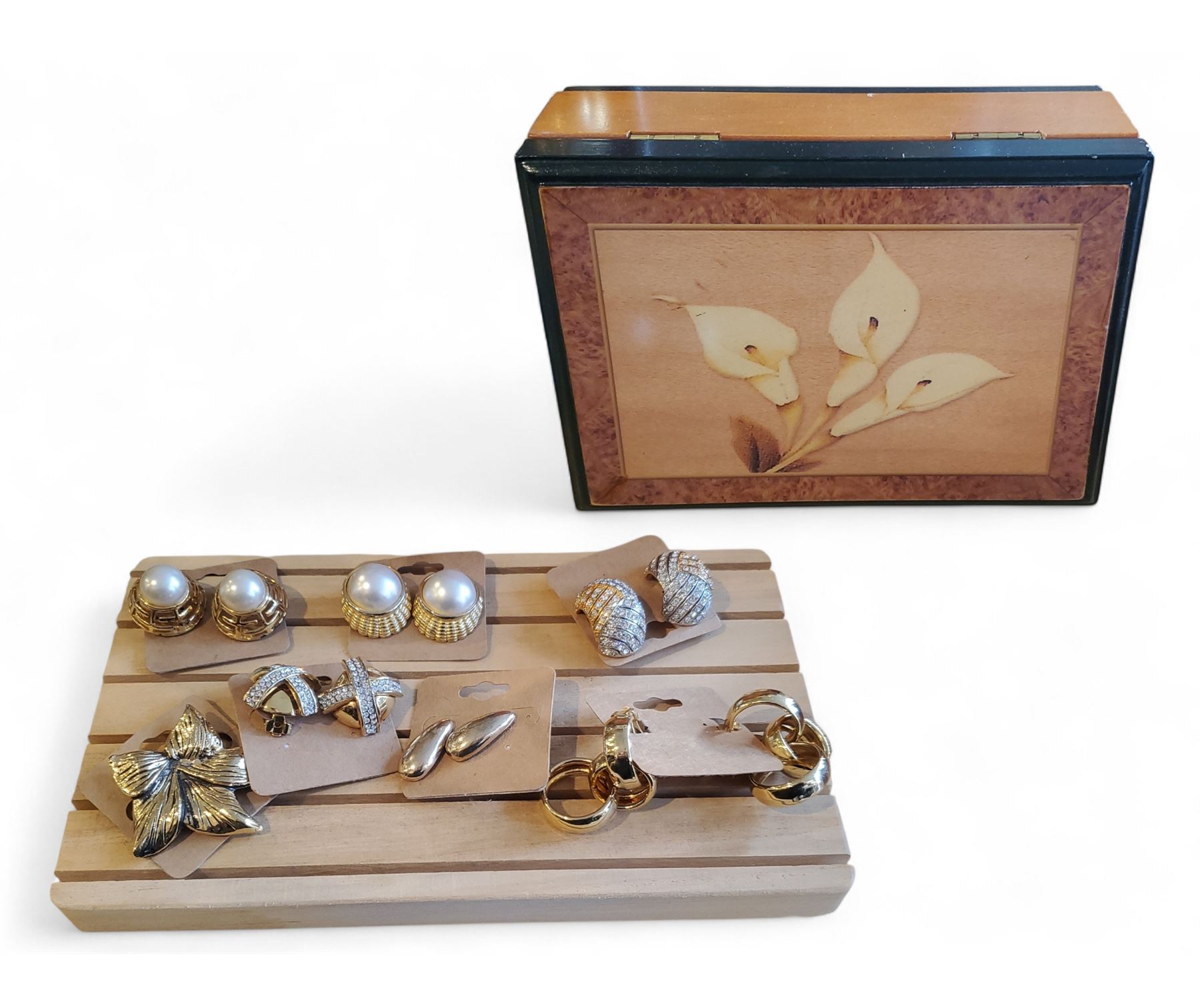 Vintage Wooden Box & Assorted Golden Jewellery - includes Clip Earrings, Brooch & Wooden Tray