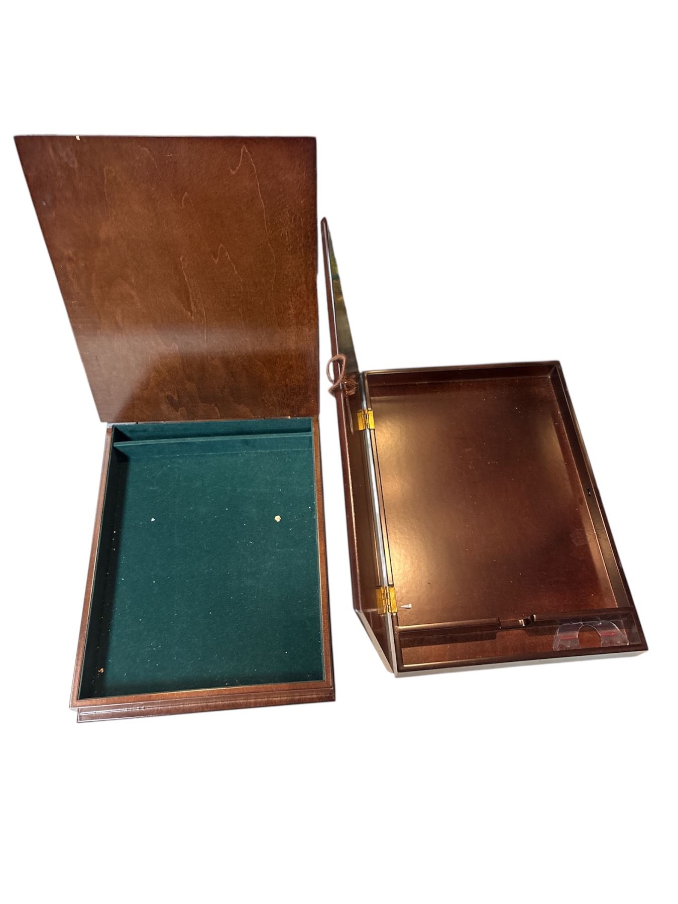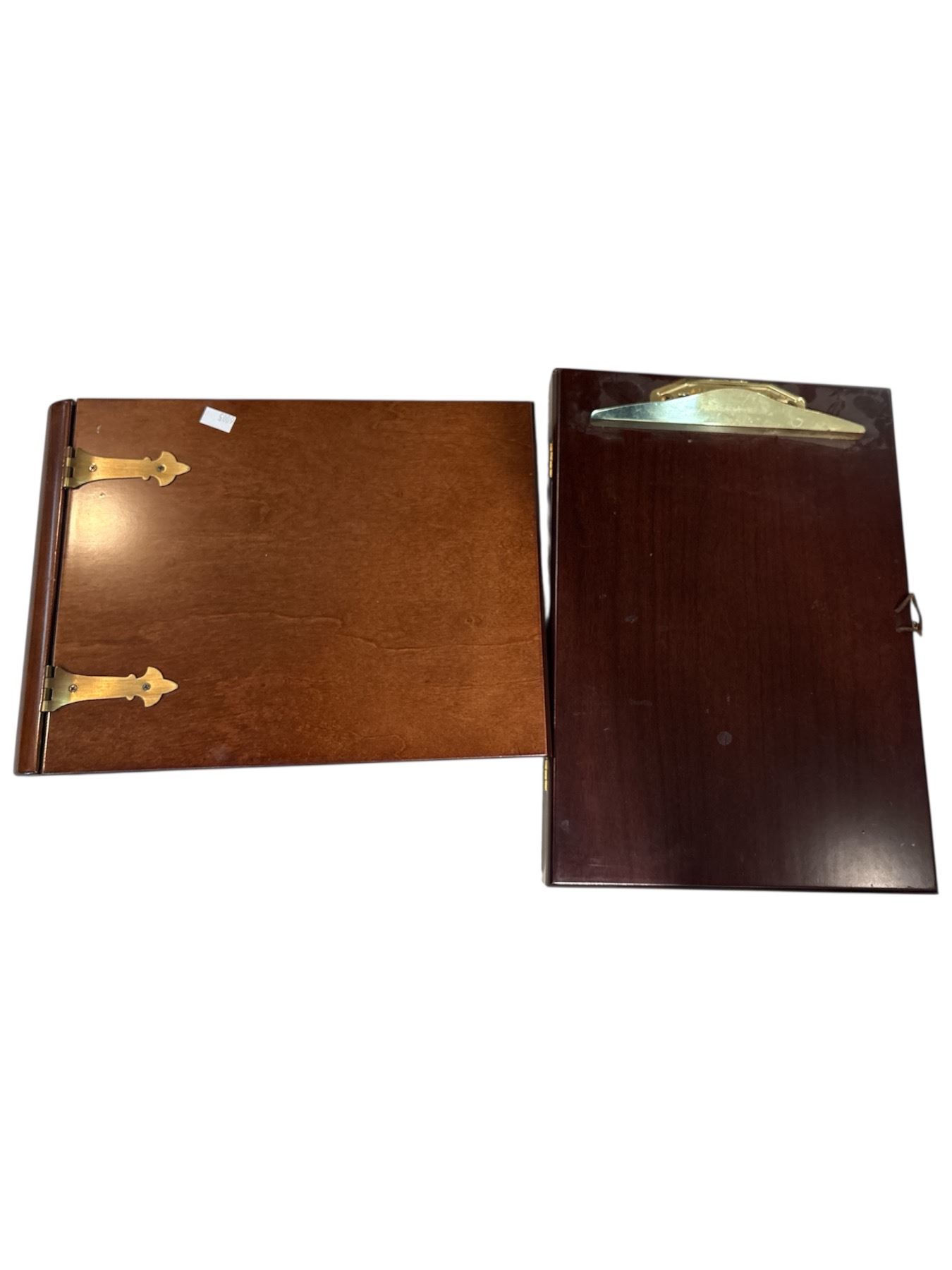 Lot includes a vintage wooden box and wooden storage clipboard. The wooden box features a hinged lid, suitable for storage or display, while the storage clipboard combines functionality with classic wooden construction. Both items showcase traditional craftsmanship. Item is as pictured.