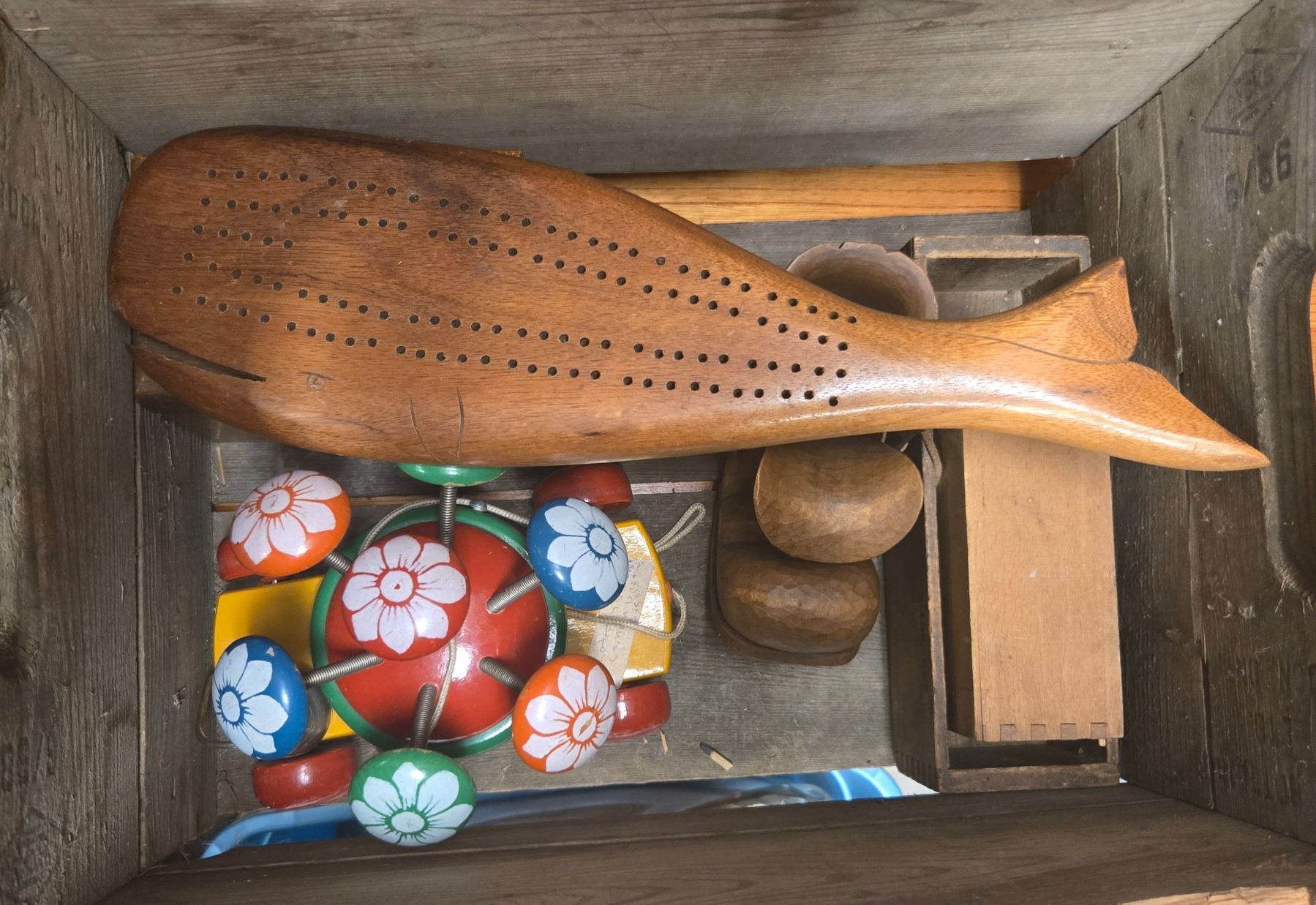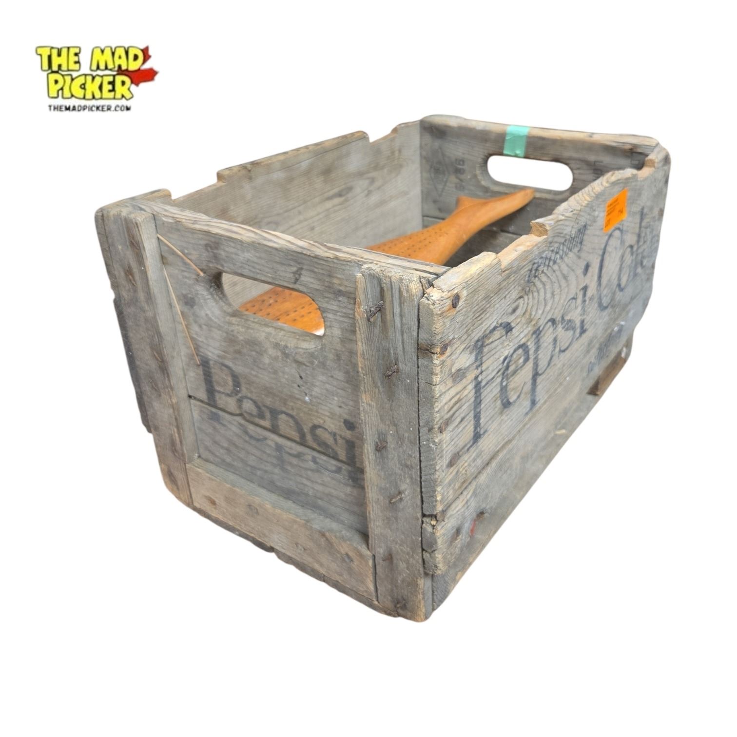 Rustic wooden Pepsi crate featuring vintage-style branding, filled with assorted wooden collectibles. Includes handcrafted wooden bowls, a cribbage board, and additional small items. Crate and contents showcase natural woodgrain and patina, providing a cohesive display of wooden utility and decor.