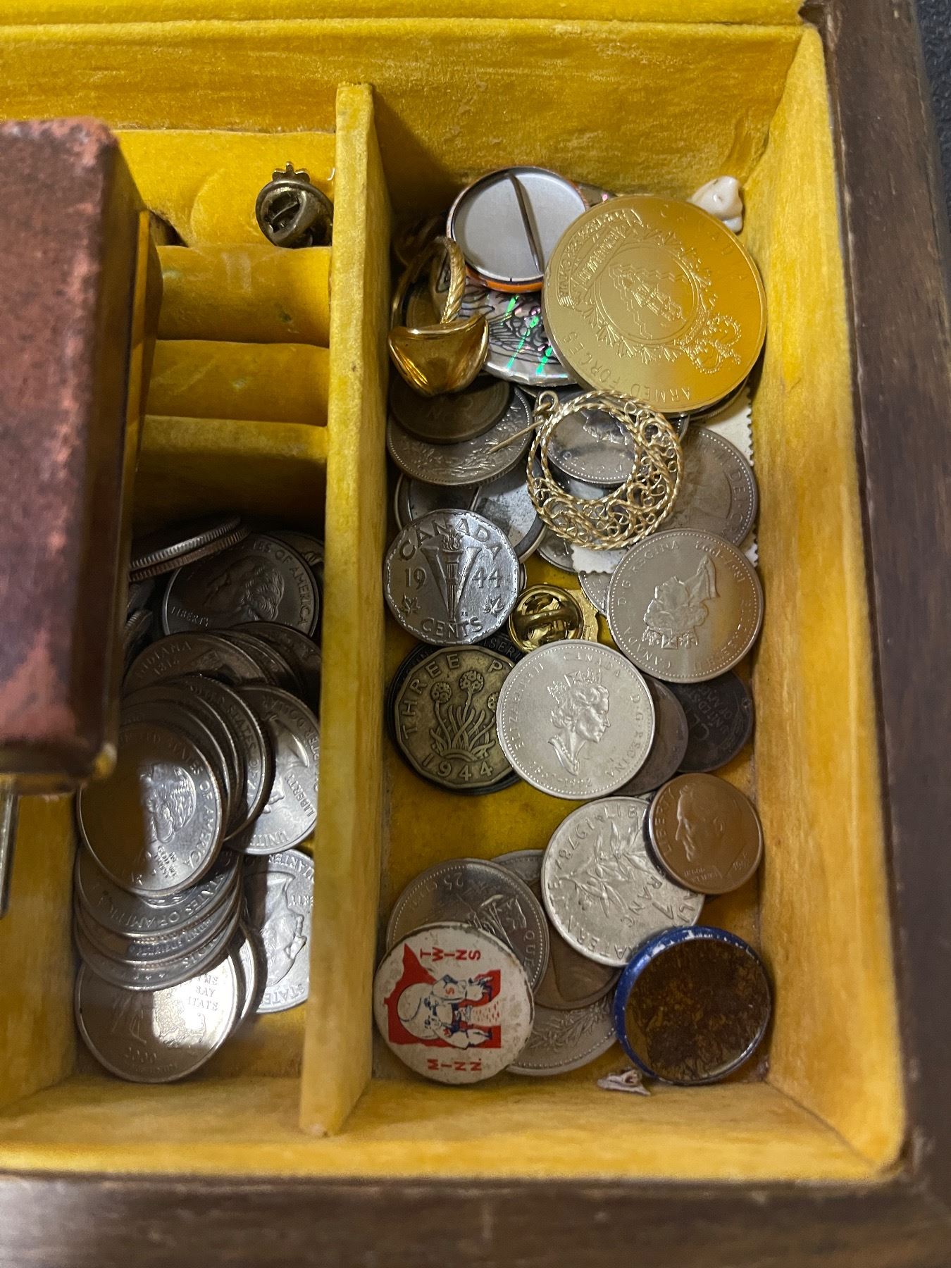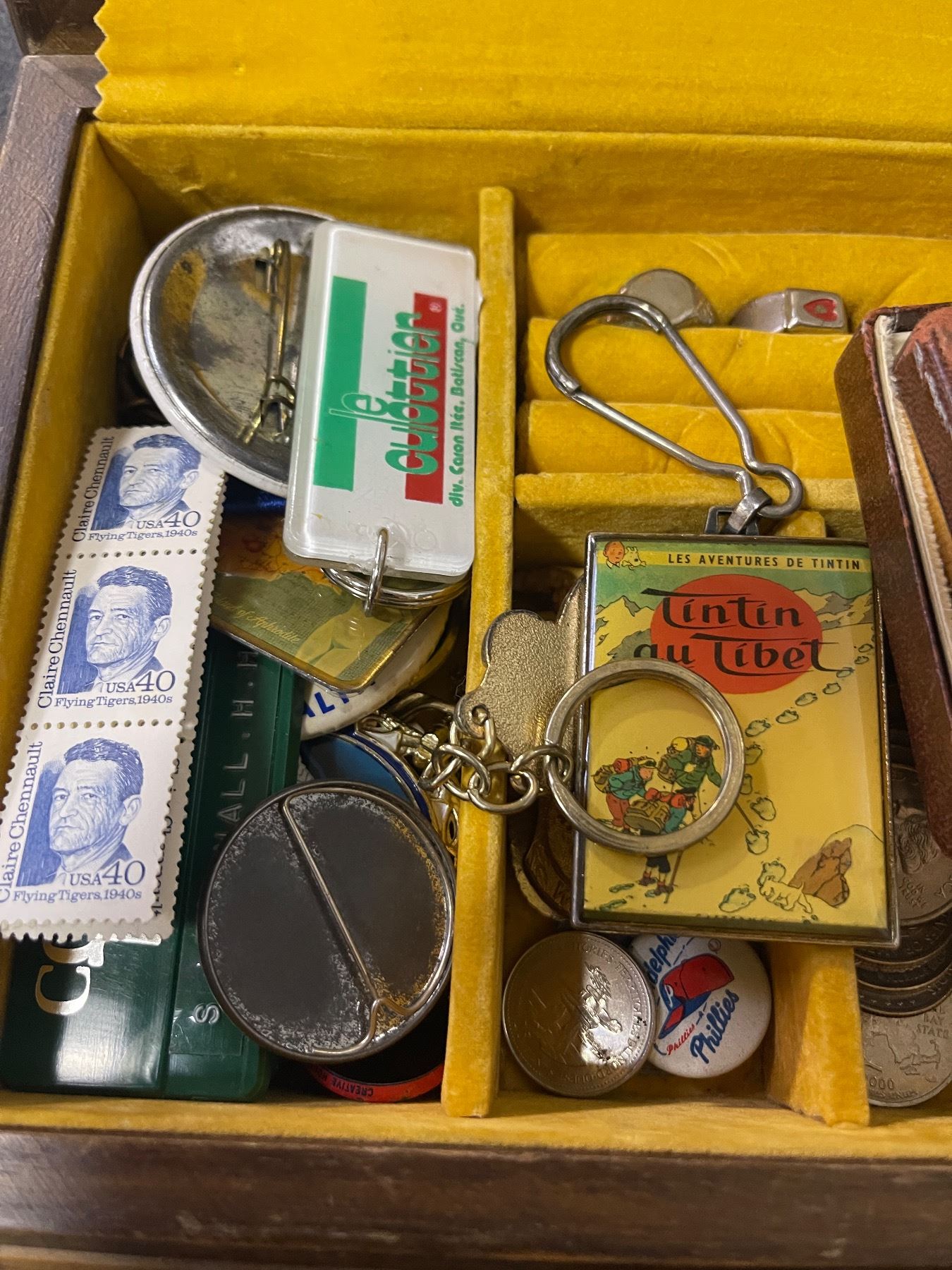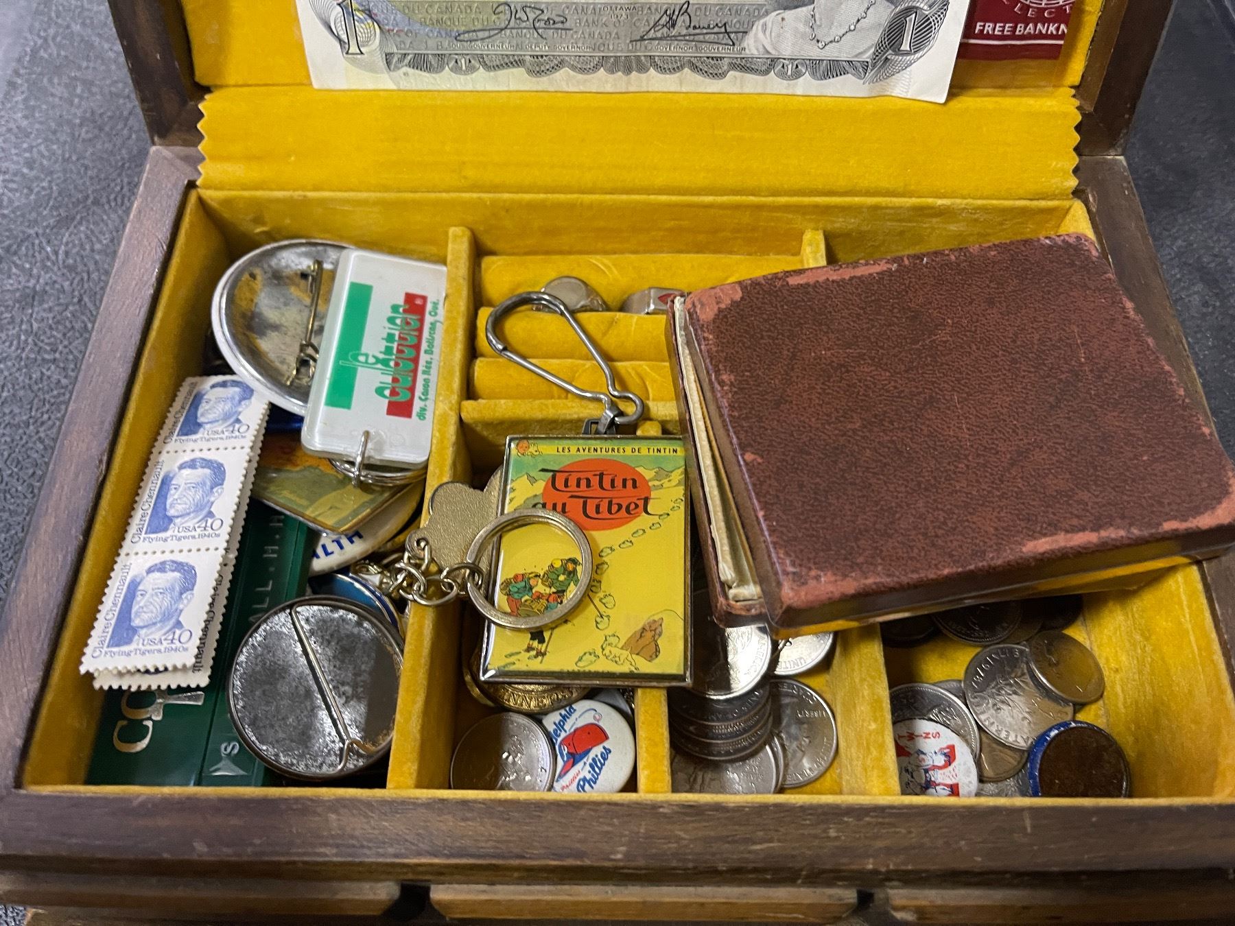Vintage Wooden Trinket Box with Assorted Keychains, Pins, Stamps, Coins, and More