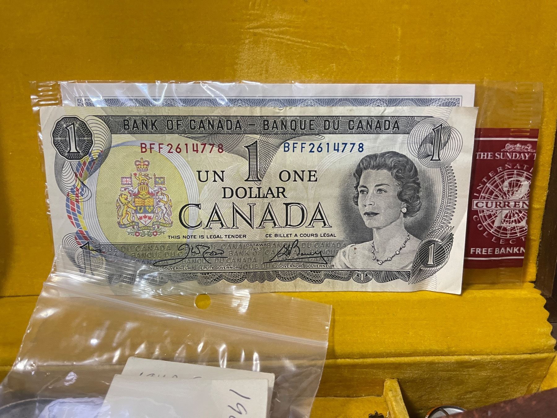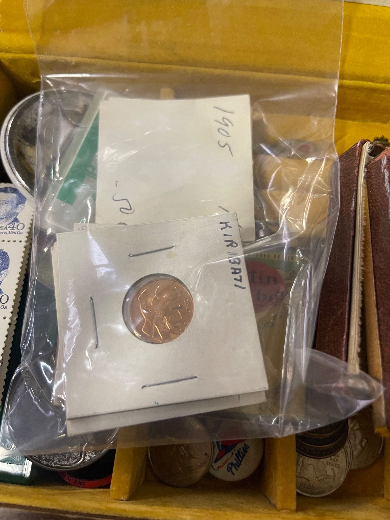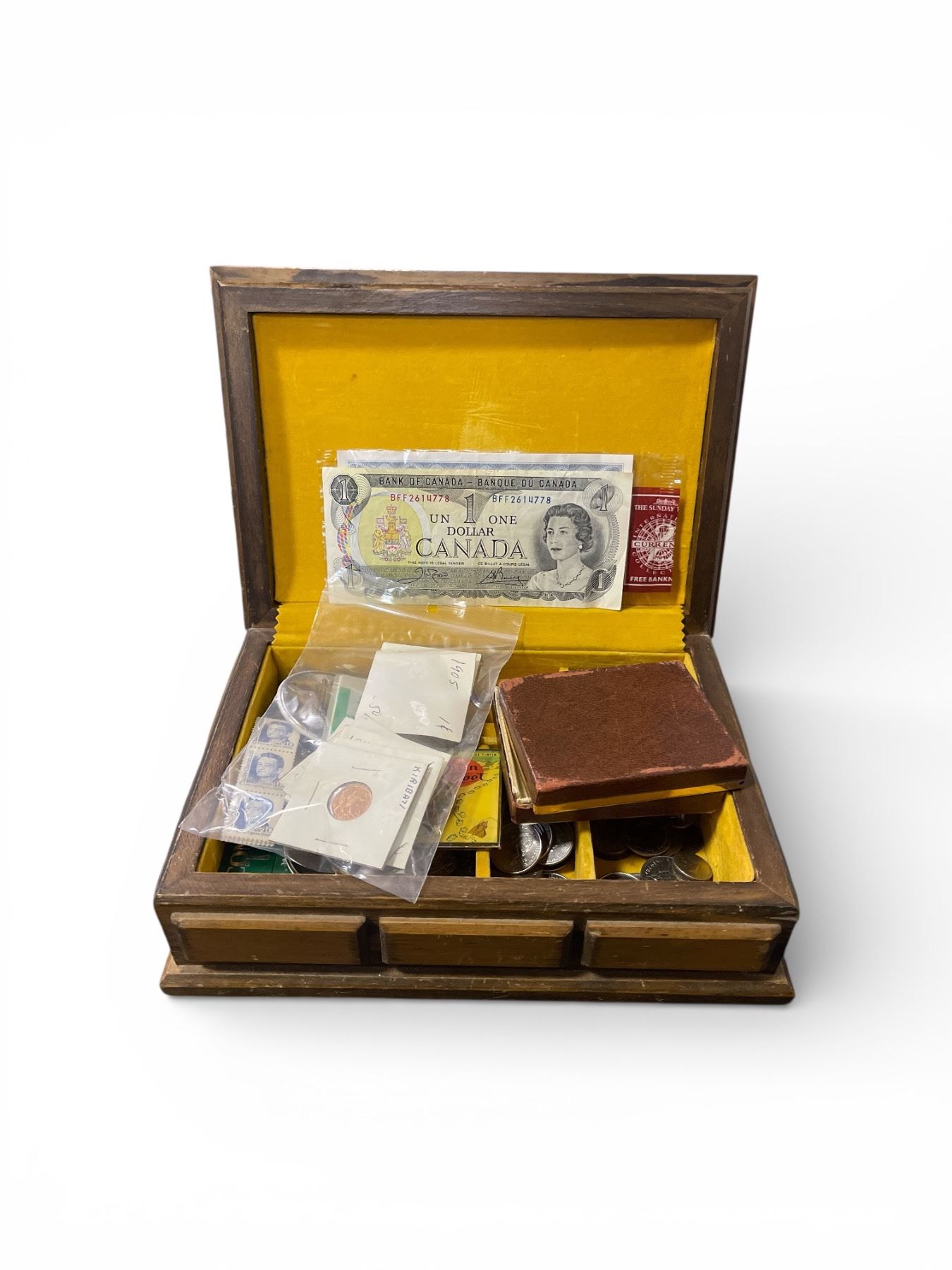 Vintage Wooden Trinket Box with Assorted Keychains, Pins, Stamps, Coins, and More