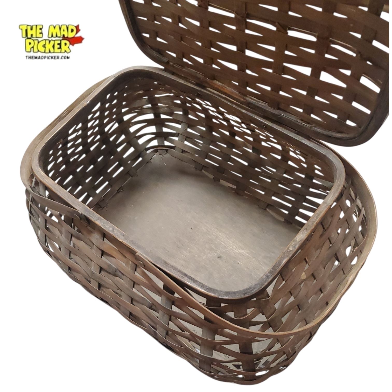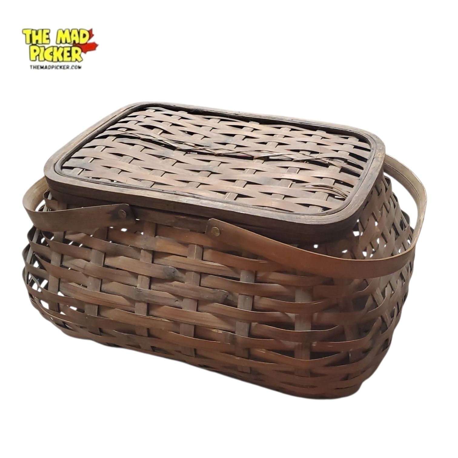 Vintage woven splint picnic basket, likely made from ash or bamboo. Features a hinged lid with leather-hinged wood design and a woven pattern. Equipped with two wooden carrying handles. Classic craftsmanship, suitable for mid-20th century styling.
