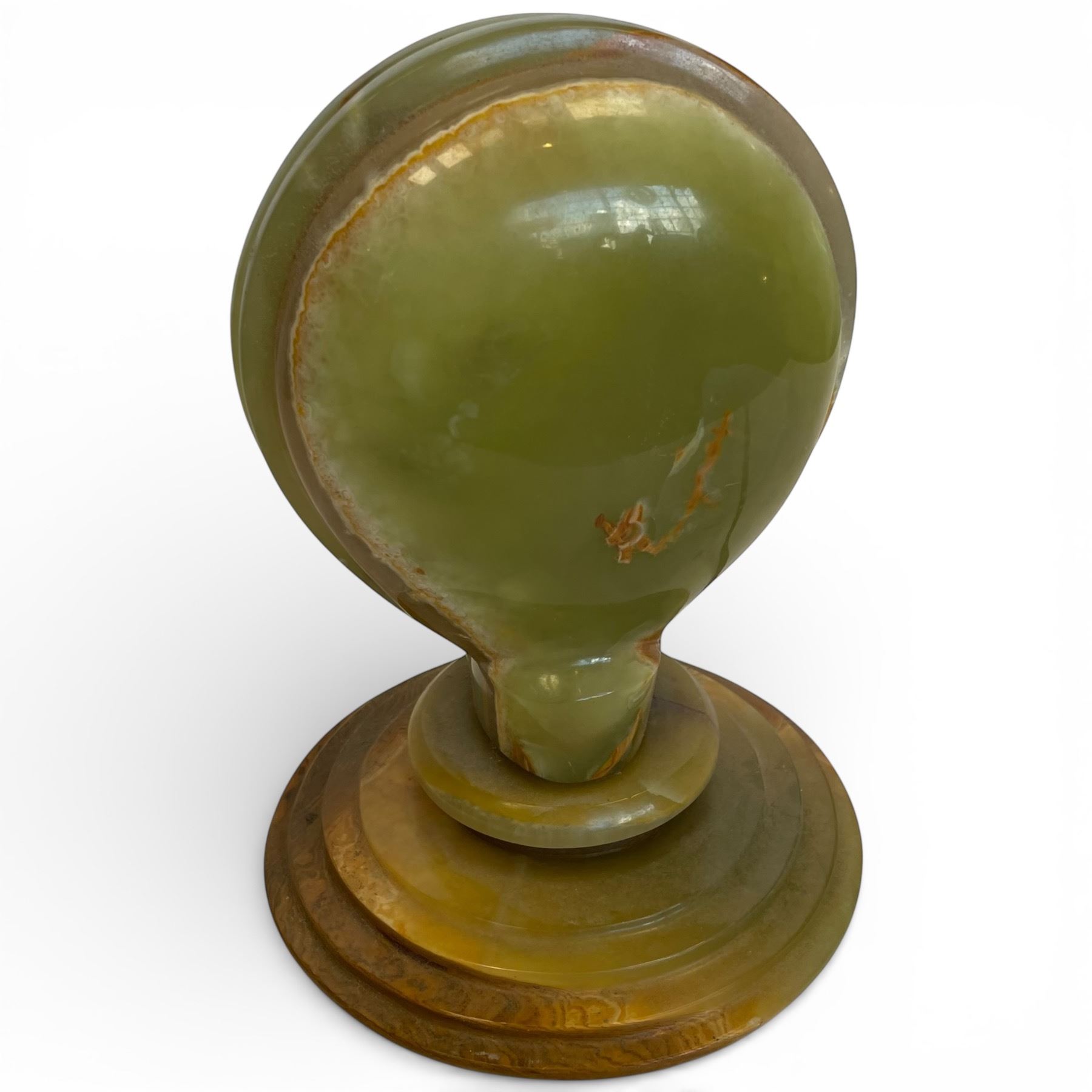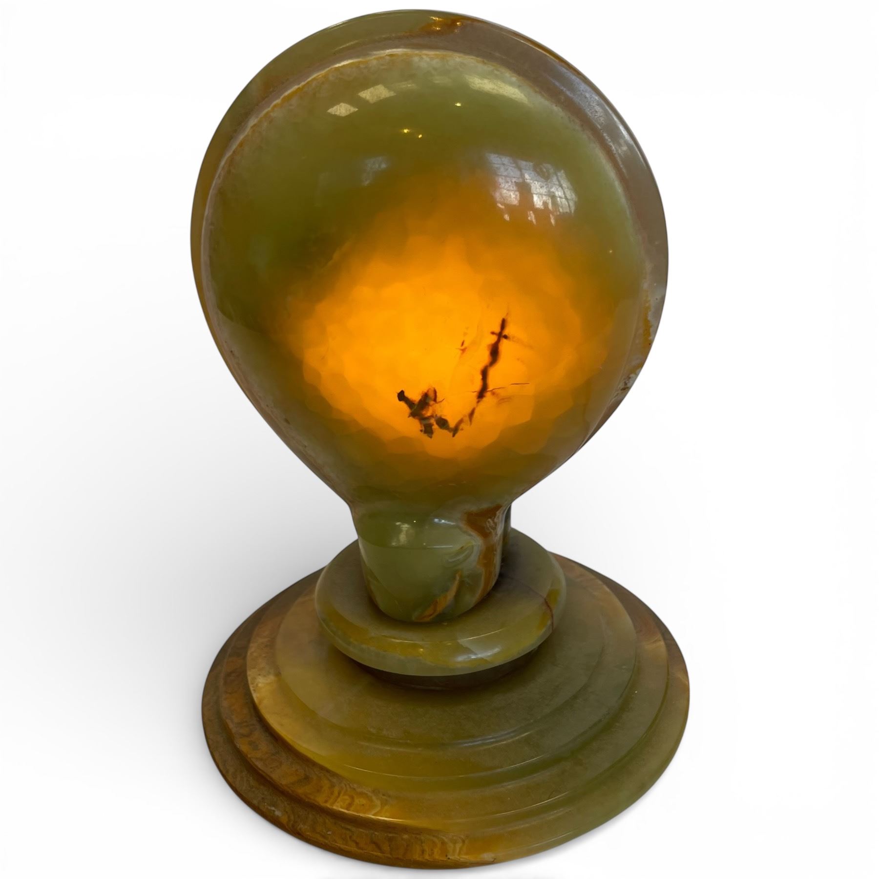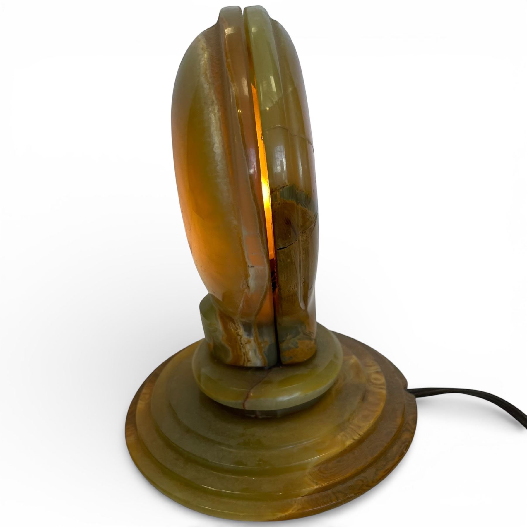 Vintage lamp with base crafted from yellow and green onyx stone. The lamp stands 7.5-Inch tall. Features unique natural patterns within the onyx material, characteristic of vintage stone-craft lamps. Item is as pictured. Small crack on backside