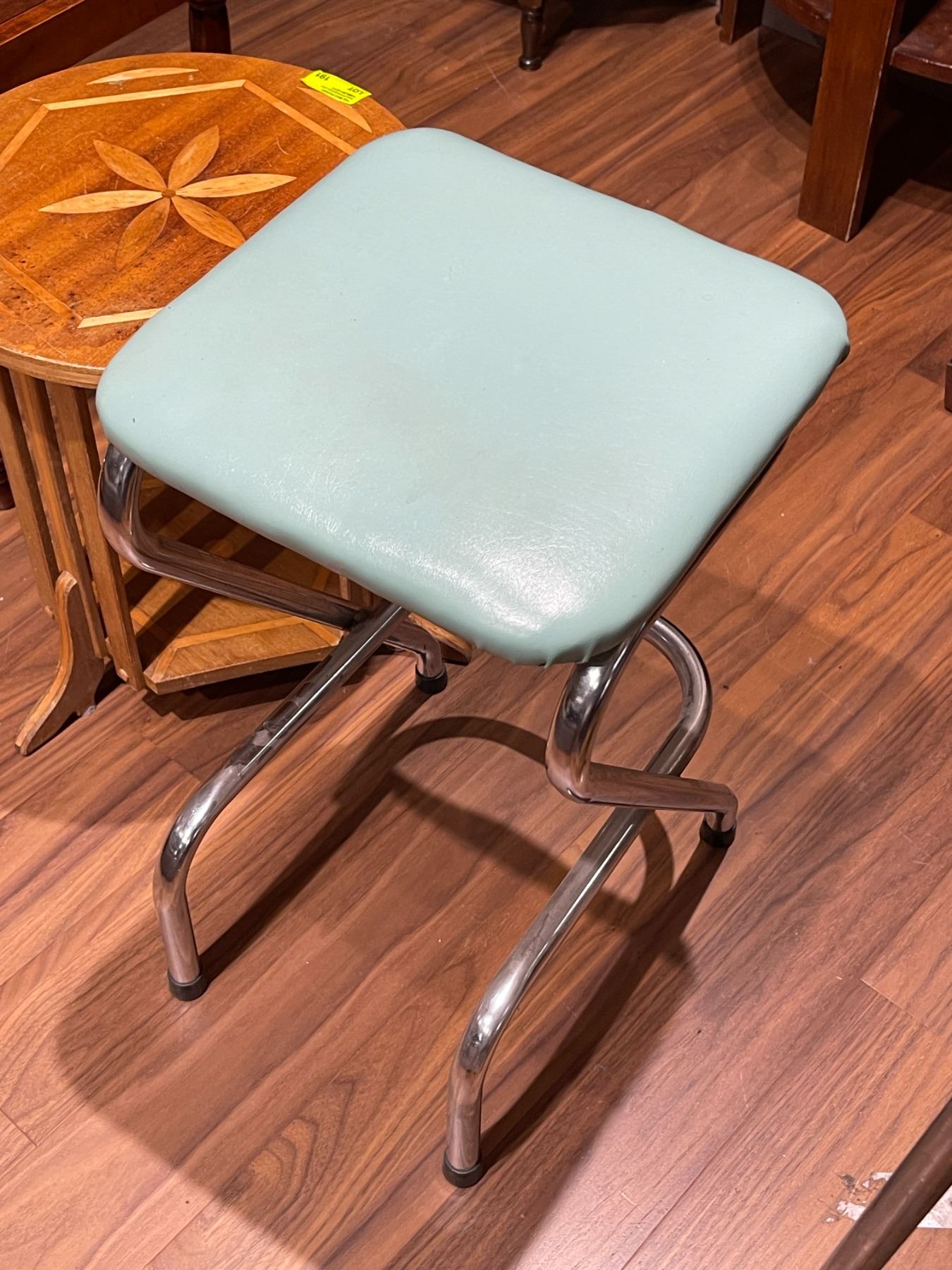 Vintage Z-style stool featuring a chrome frame and blue vinyl seat. Dimensions are 12-Inch length, 12-Inch width, and 21.5-Inch height. Chrome frame showcases a retro aesthetic with a padded blue vinyl seat for comfort. Item is as pictured.